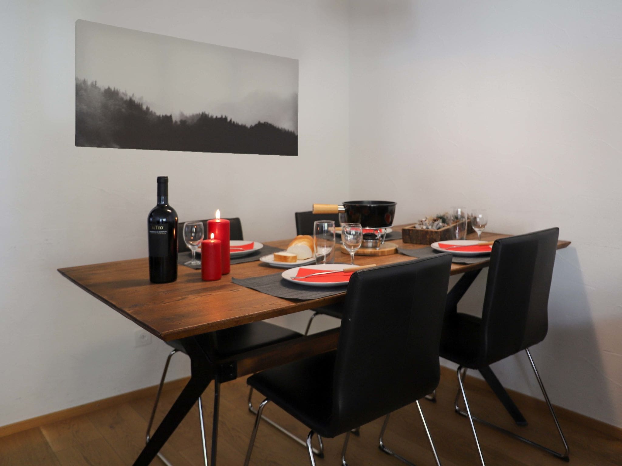 The apartment’s outdoor spaces are thoughtfully designed to maximize the dramatic mountain setting. The large west-facing terrace serves as an outdoor living room, furnished with comfortable seating and four deck chairs for relaxing while watching the sun set behind the peaks. The additional north-facing balcony provides alternative outdoor space and different mountain vistas throughout the day.