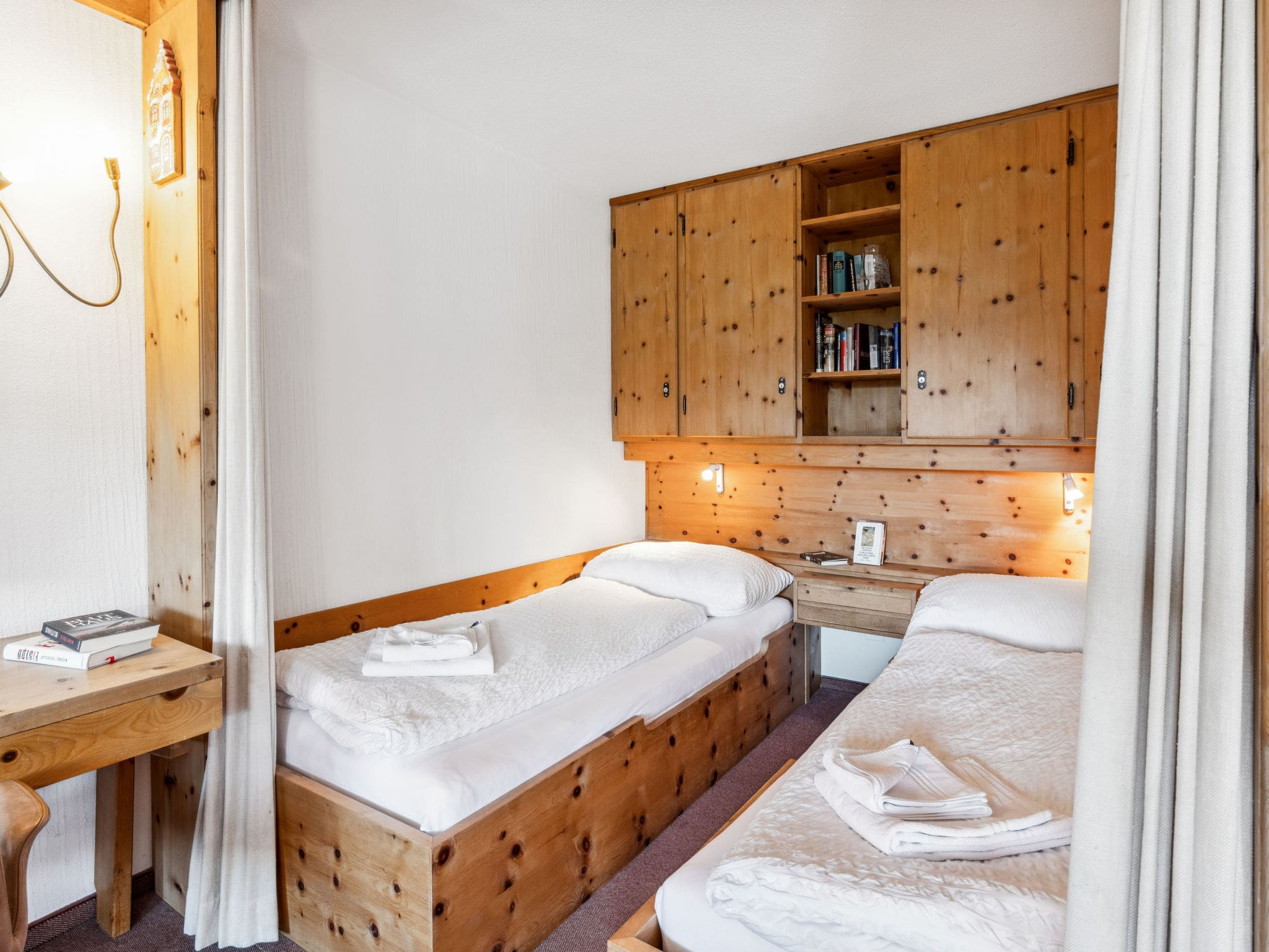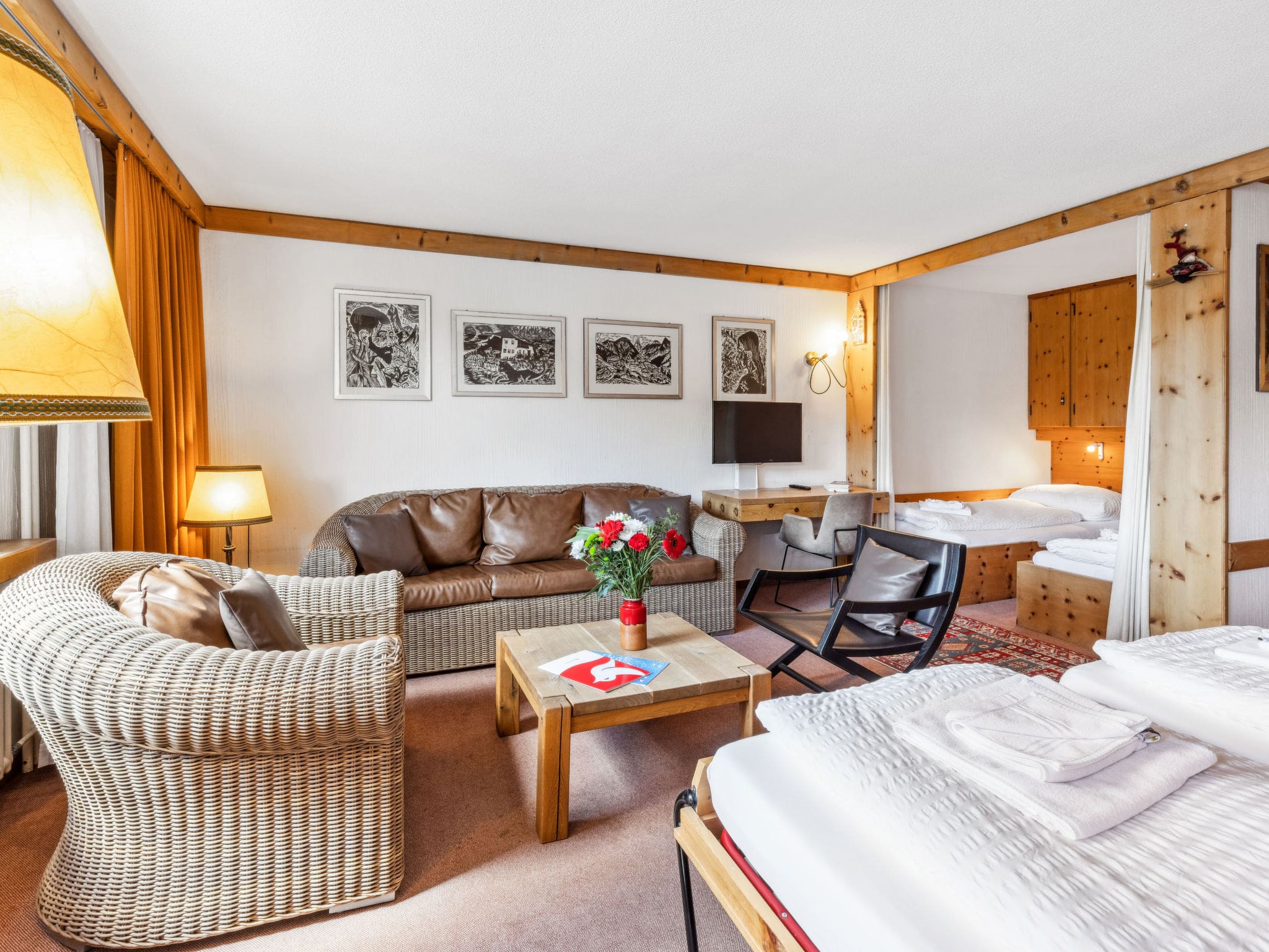This thoughtfully designed 50m² apartment on the sixth floor combines rustic Alpine charm with modern conveniences. The open-plan living and dining area features comfortable furnishings and a flat-screen cable TV, creating a welcoming space to unwind after days spent exploring the mountains. The clever use of space includes an alcove sleeping area with curtain for privacy, alongside fold-away beds in the main living area, accommodating up to four guests with ease.