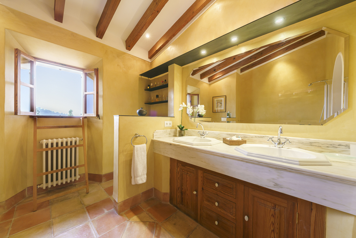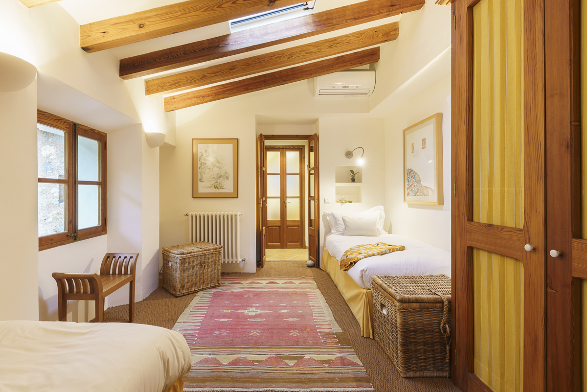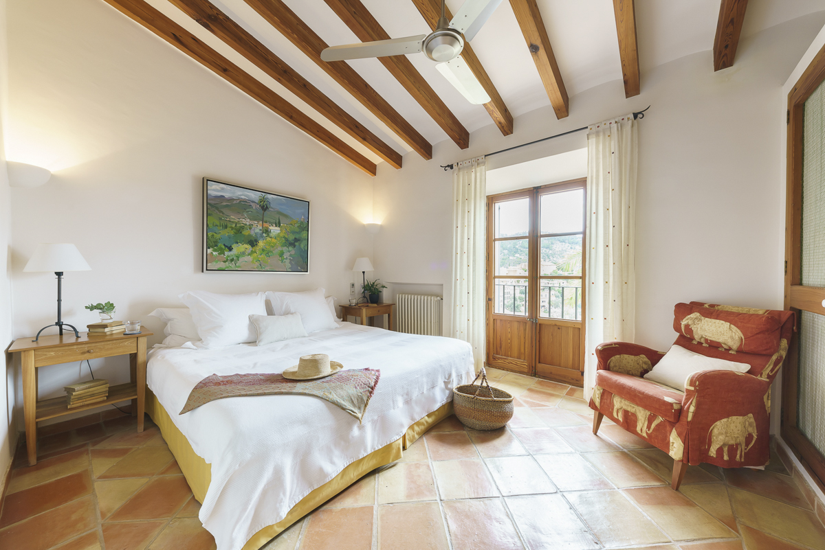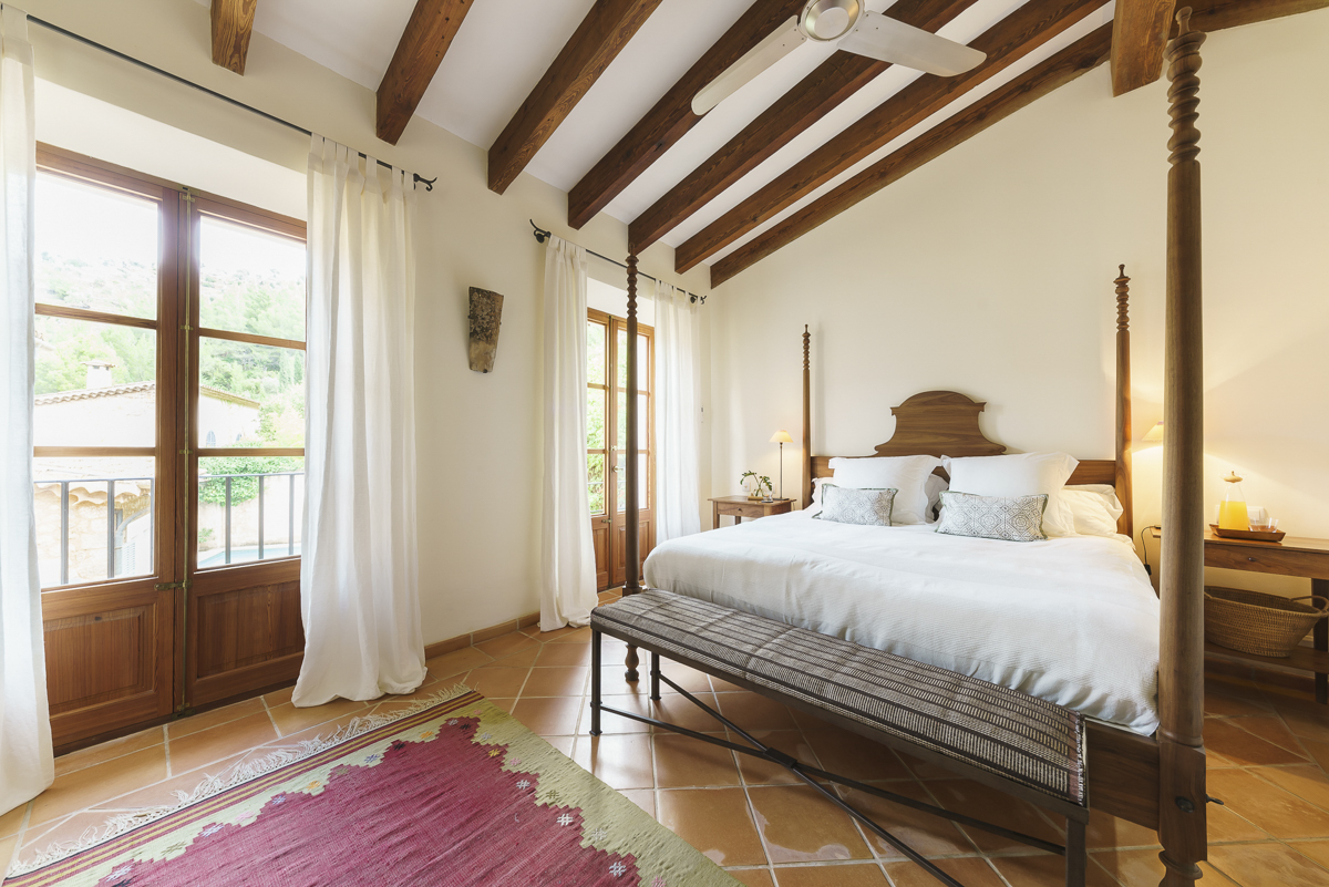 The master bedroom has a wonderful terrace with views of Deia, a jacuzzi ensuite bathroom and a four-poster bed plus there are two further ensuite bedrooms upstairs.The fourth bedroom, available for groups of seven or eight guests, is in its own wing which is accessed via the courtyard. This bedroom has its own study area, a four-poster bed, flat screen TV and even its own private garden. The ensuite bathroom has a free-standing bath and is situated in a tower with windows in all directions with fantastic mountain views.