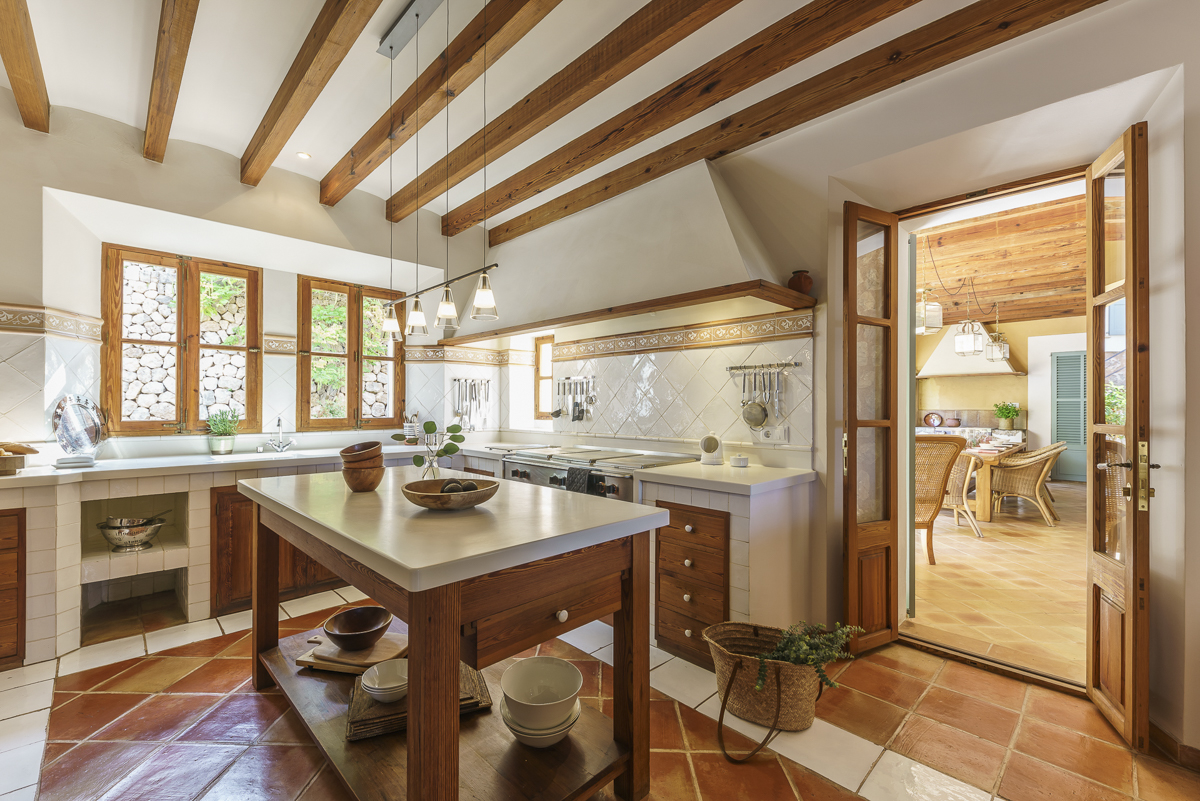 The living area features a traditional Mallorquin canopied seating area around an open fireplace and there is a large oak dining table for cosy feasts on cooler evenings. Old meets new with modern luxuries such as a Bose surround sound system across the living area plus satellite wide-screen TV and DVD player. The large kitchen has Corian worktops, a steam oven, Nespresso machine, electric BBQ and many other standard amenities to make cooking up a feast a highly enjoyable experience.