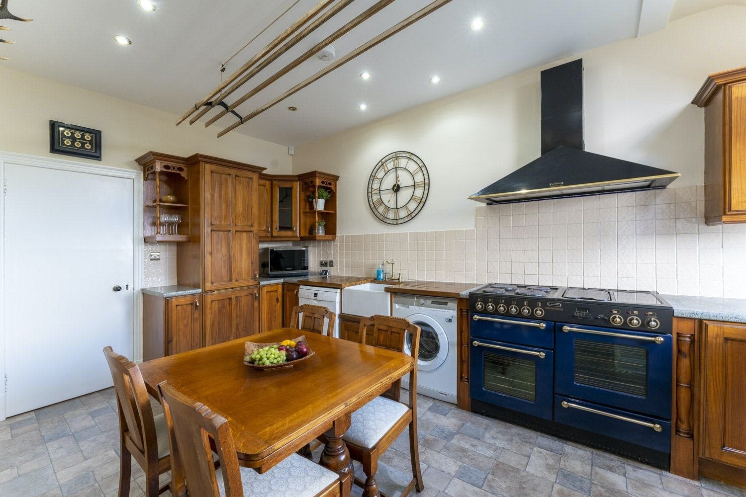 Step inside to discover spacious interiors thoughtfully designed for relaxation and enjoyment. The living room, centered around a cozy wood-burning stove, provides an inviting space for gatherings. The fully equipped kitchen is a chef’s delight, complete with modern appliances and ample dining space. With five beautifully appointed bedrooms, including a ground floor option for those with reduced mobility, every guest will find their own slice of comfort. The house also features a versatile room with a zip-and-link bed, adaptable to your specific needs.