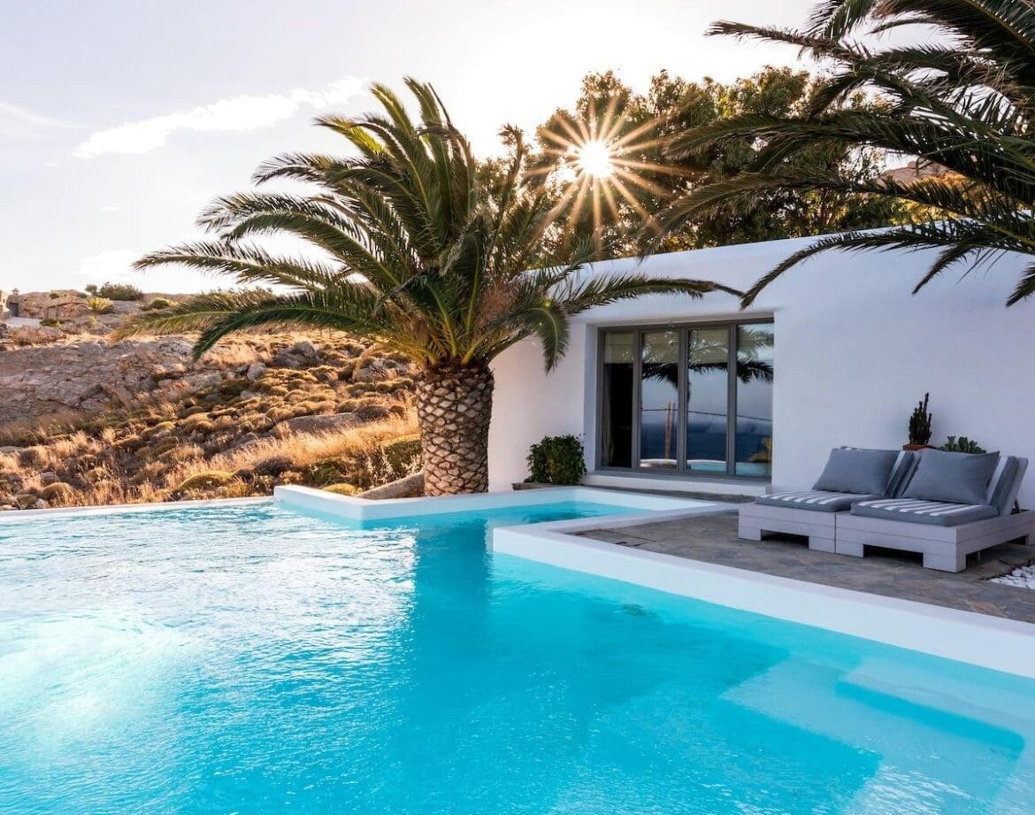 Light, bright and glam, this stylish villa is just the ticket for a Mykonos getaway. The panoramic views across the Aegean are unforgettable, and you’ll be able to take full advantage of the sweeping scenery on the terrace. Whether you’re cooling off in the infinity pool, lazing underneath swaying palm trees or sipping tea on the balcony, the glistening ocean is your backdrop – what can be better than that?