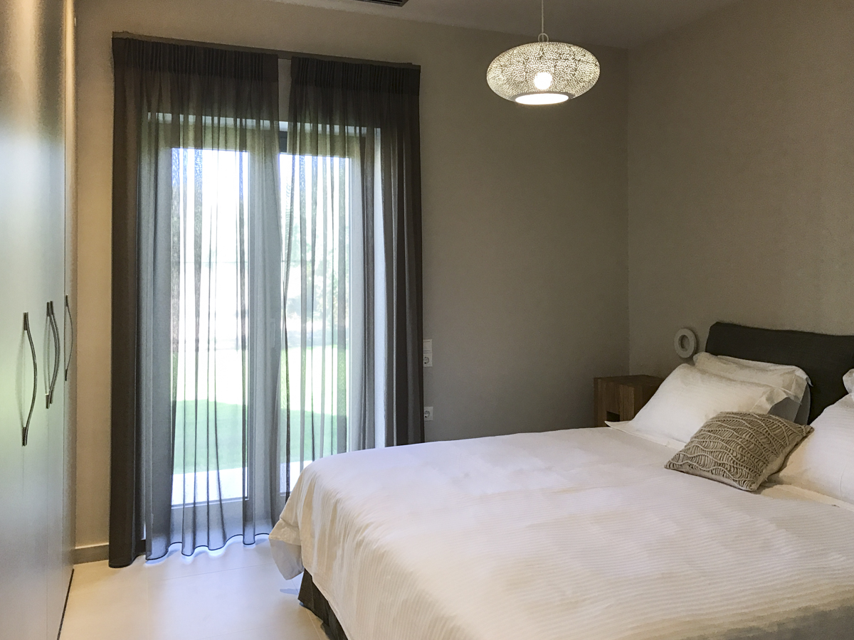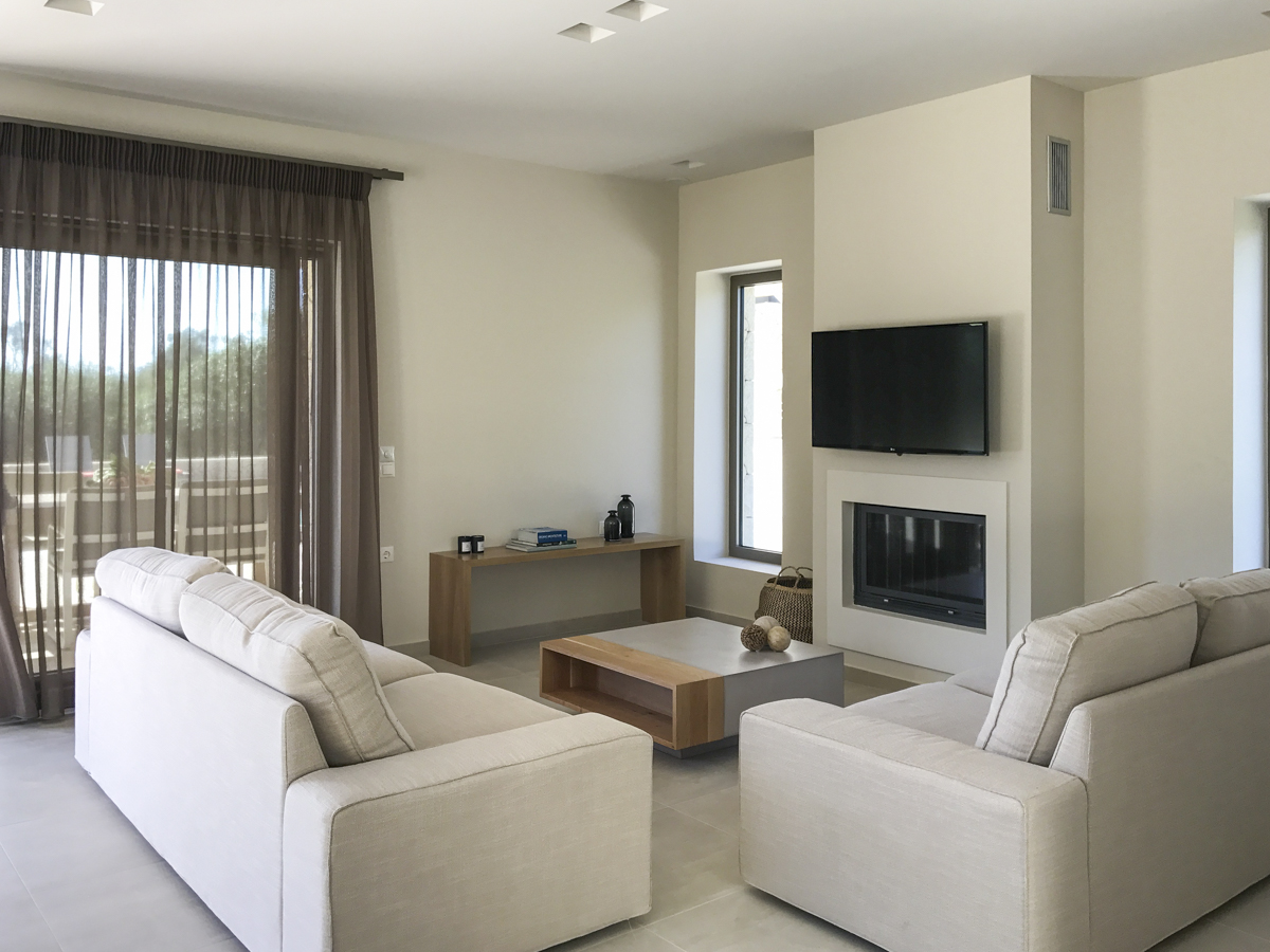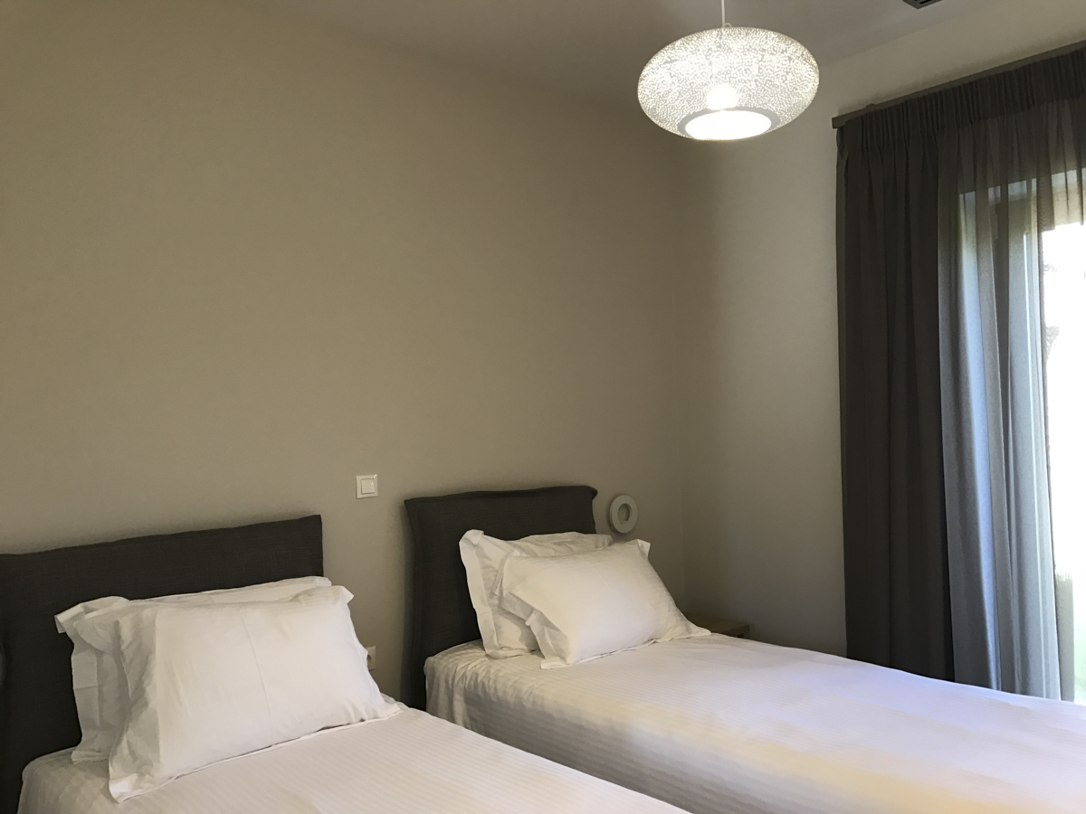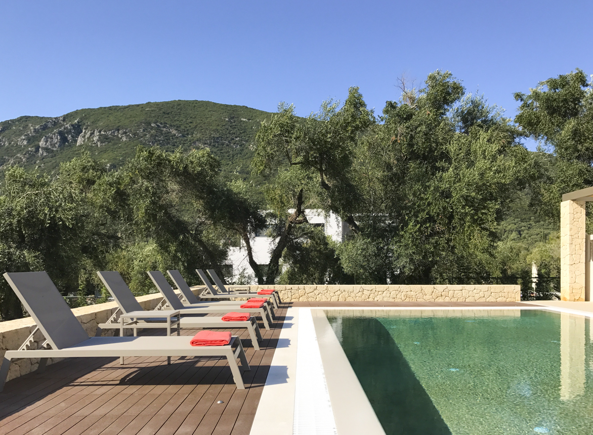 Villa Demeter, set in a small development of just three villas, boasts a stunning location on the quieter, south western side of Corfu. It comfortably sleeps 6 and has a sleek, modern and uncluttered finish. The villa is set out all on one level; with the living accommodation largely open plan. There is a fully fitted kitchen, with all the modern appliances and equipment you will need (oven, hob, fridge, freezer, Nespresso coffee machine, microwave) – the dining area is just next to the kitchen so you can all eat together, without the cook feeling tucked away! The main veranda leads out from the dining room, with a second dining area outside overlooking the pool – great if you want to keep an eye on the little ones while you enjoy a long lunch. Back inside is the sitting room, with its comfortable sofas, Smart satellite TV and pS4 – great distractions if you want to escape the heat of the day.
