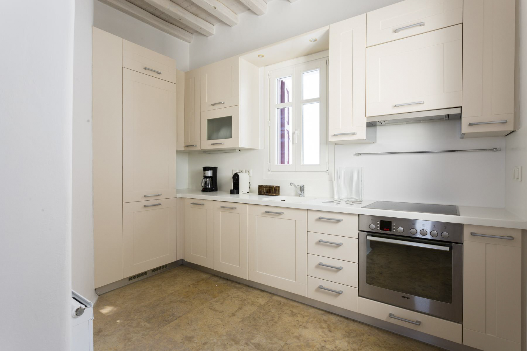 There are rustic elements like a wooden table and beams, alongside classically Mediterranean architecture like coves and coloured wooden shutters. The modern, fully equipped kitchen has a small breakfast bar and cooking facilities.The three bedrooms can sleep six and are similarly styled – they have pastel-coloured soft furnishings, neat en-suite bathrooms and the master has a charming balcony with sea views.
