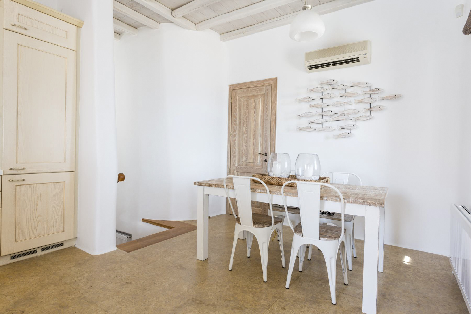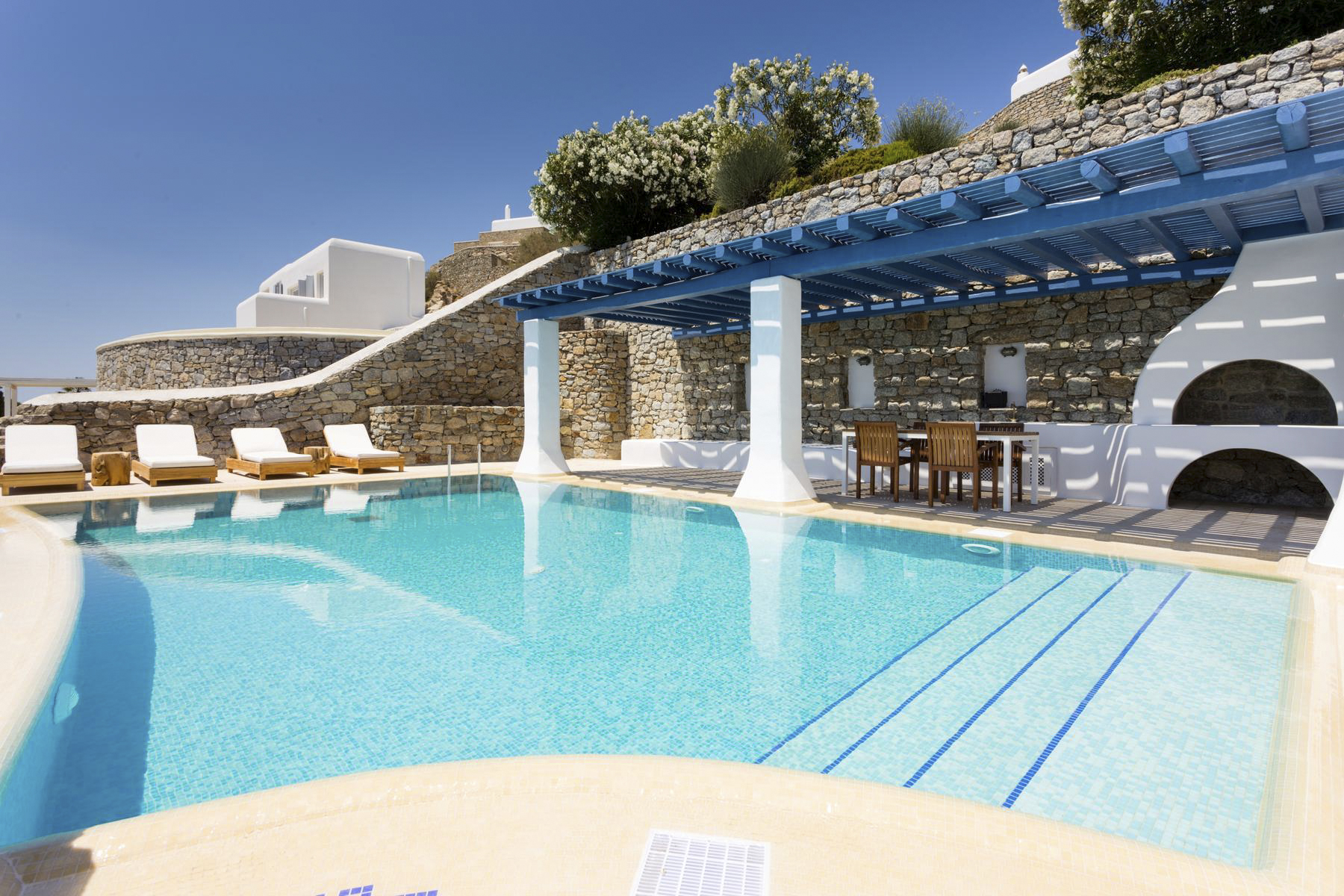 Step into Mediterranean luxury at Villa Marine – a family-friendly three-bedroom villa on the idyllic Greek island of Mykonos. Part of a secluded complex, this peaceful villa boasts a private dock and sea access, lush garden surroundings and dedicated daily cleaning staff for a carefree stay. You have your own pool with crystal-clear waters, and there are steps leading down to the sandy shoreline.
