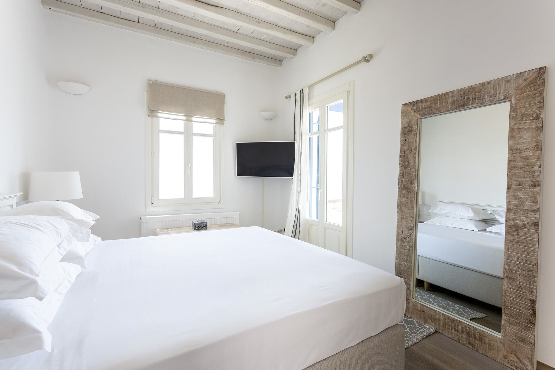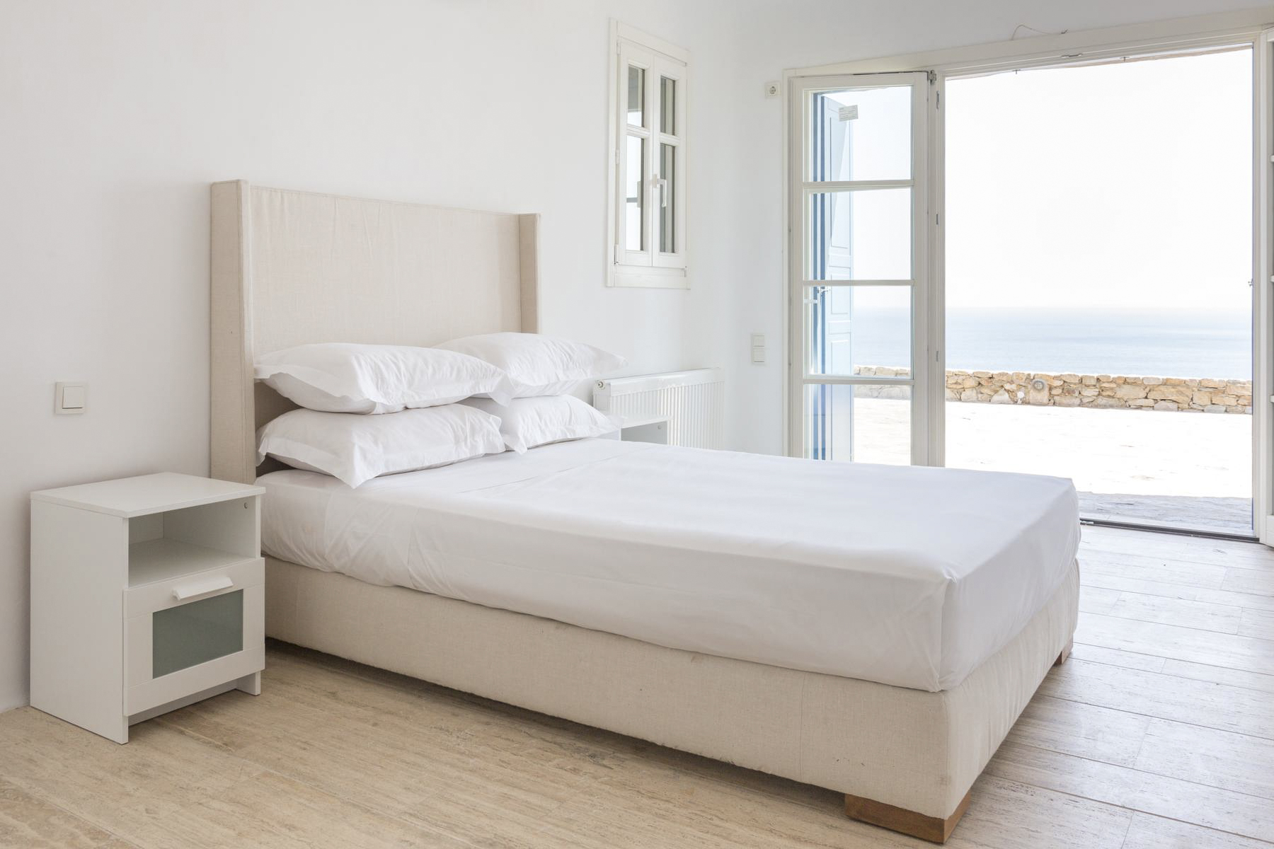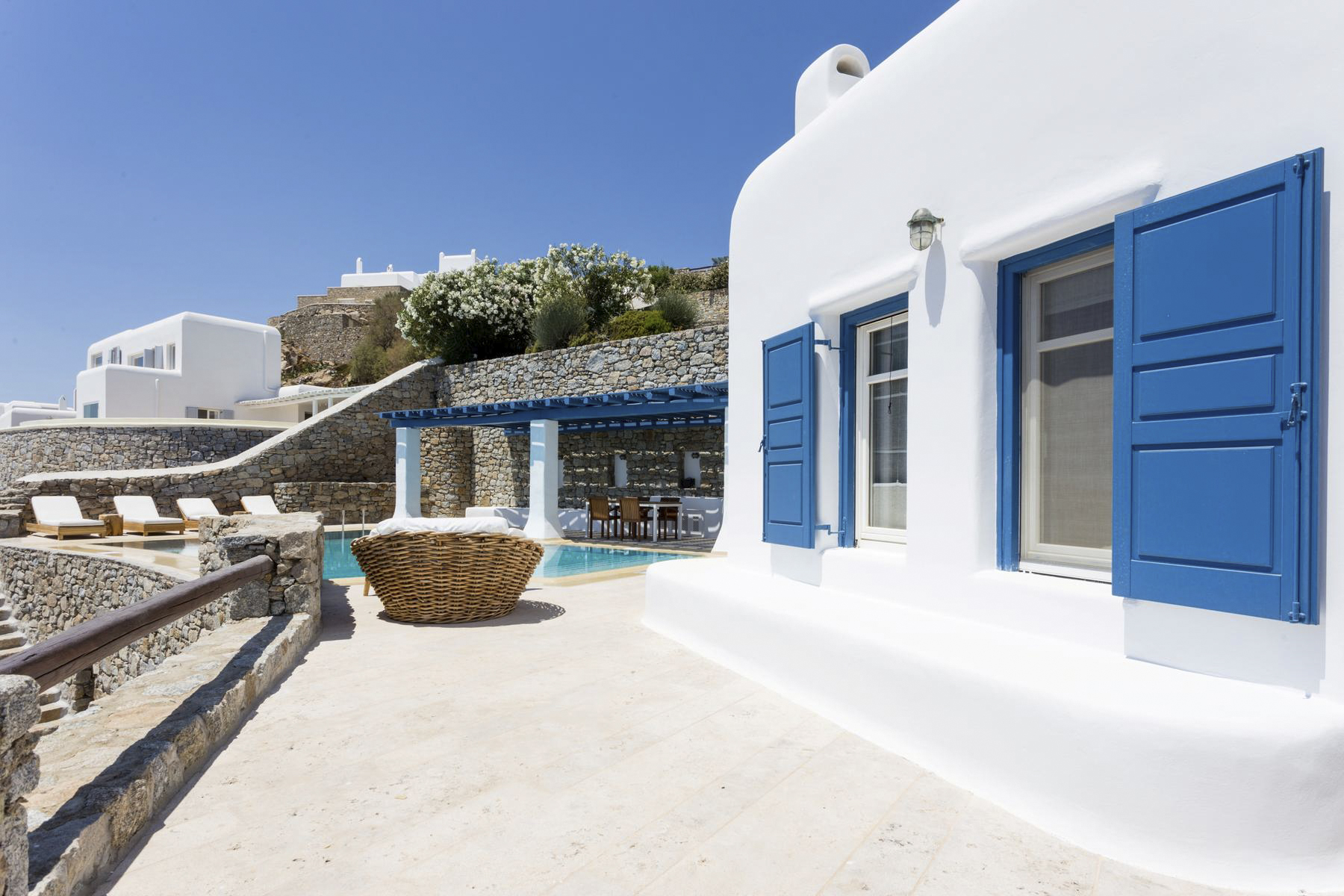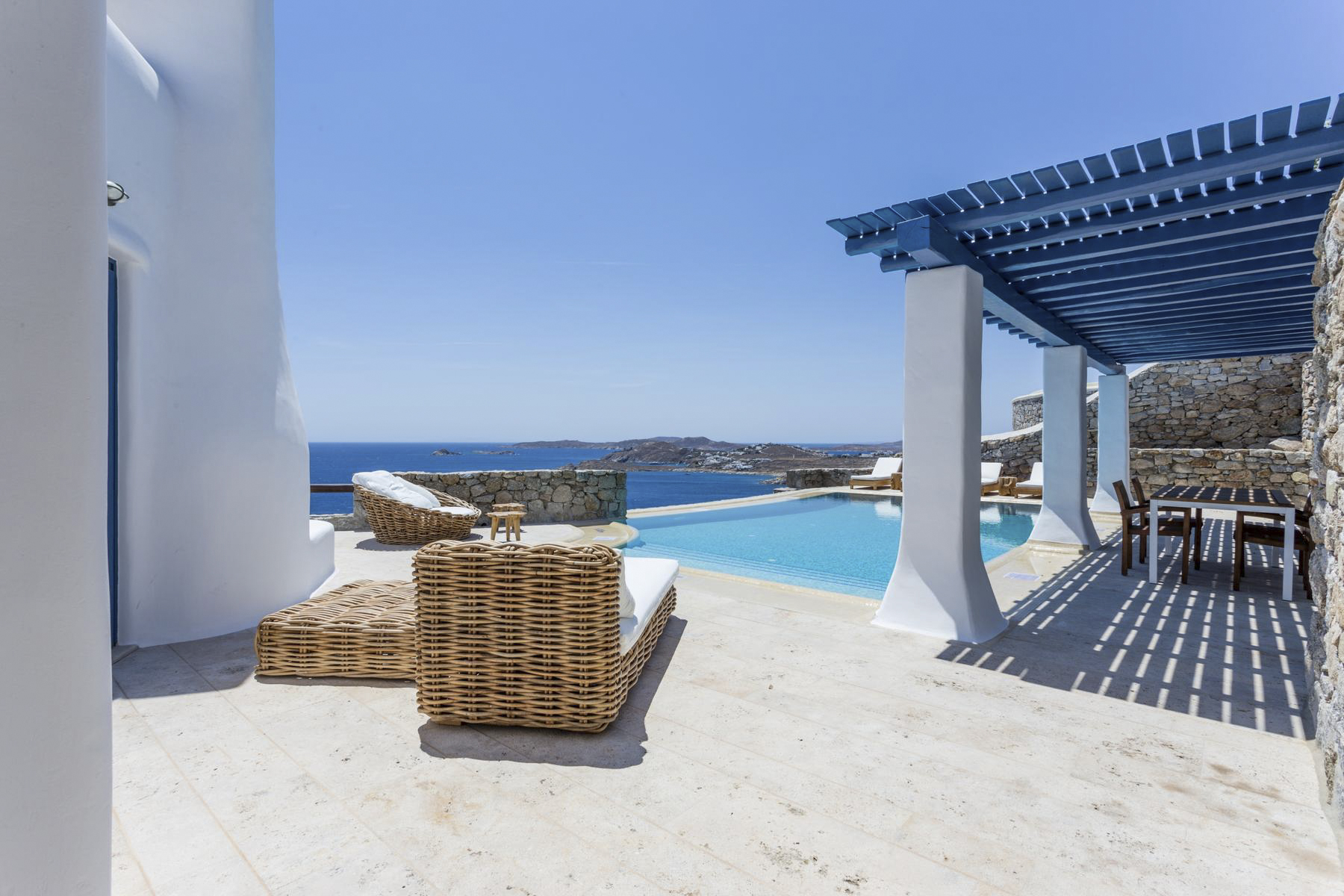 Although the area’s pleasantly quiet, you’re close to local shops, tavernas and cafés, and are only around a 15-minute drive away from the centre of Mykonos. Famous for its cosmopolitan atmosphere, you’ll find lots of places to eat and explore in the town including sun-soaked beaches and architectural wonders – making this an ideal destination for families, friends and couples alike.Mykonos is a cosmopolitan Greek island in the Aegean Sea. With mazes of white-washed buildings and historic churches, the island’s architecture is one of a kind. Located near the neighbouring uninhabited islands of Delos – with a UNESCO-listed archaeological site – and Rhenia with pristine beach coves and snorkelling sports – Mykonos is the perfect place to go exploring.