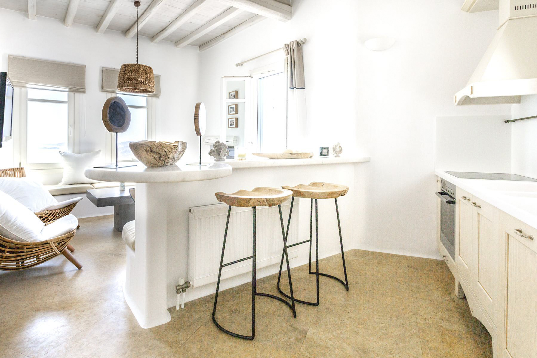Villa Marine fuses classic Greek architecture with contemporary furnishings. Think rustic stone walls, quaint blue shutters, whitewashed walls and soft grey and white décor. There’s an open-plan living room and a modern kitchen, complete with a dining table, breakfast bar and an elegant, pared-back sitting room for relaxing after a day of exploring the beautiful surrounds.