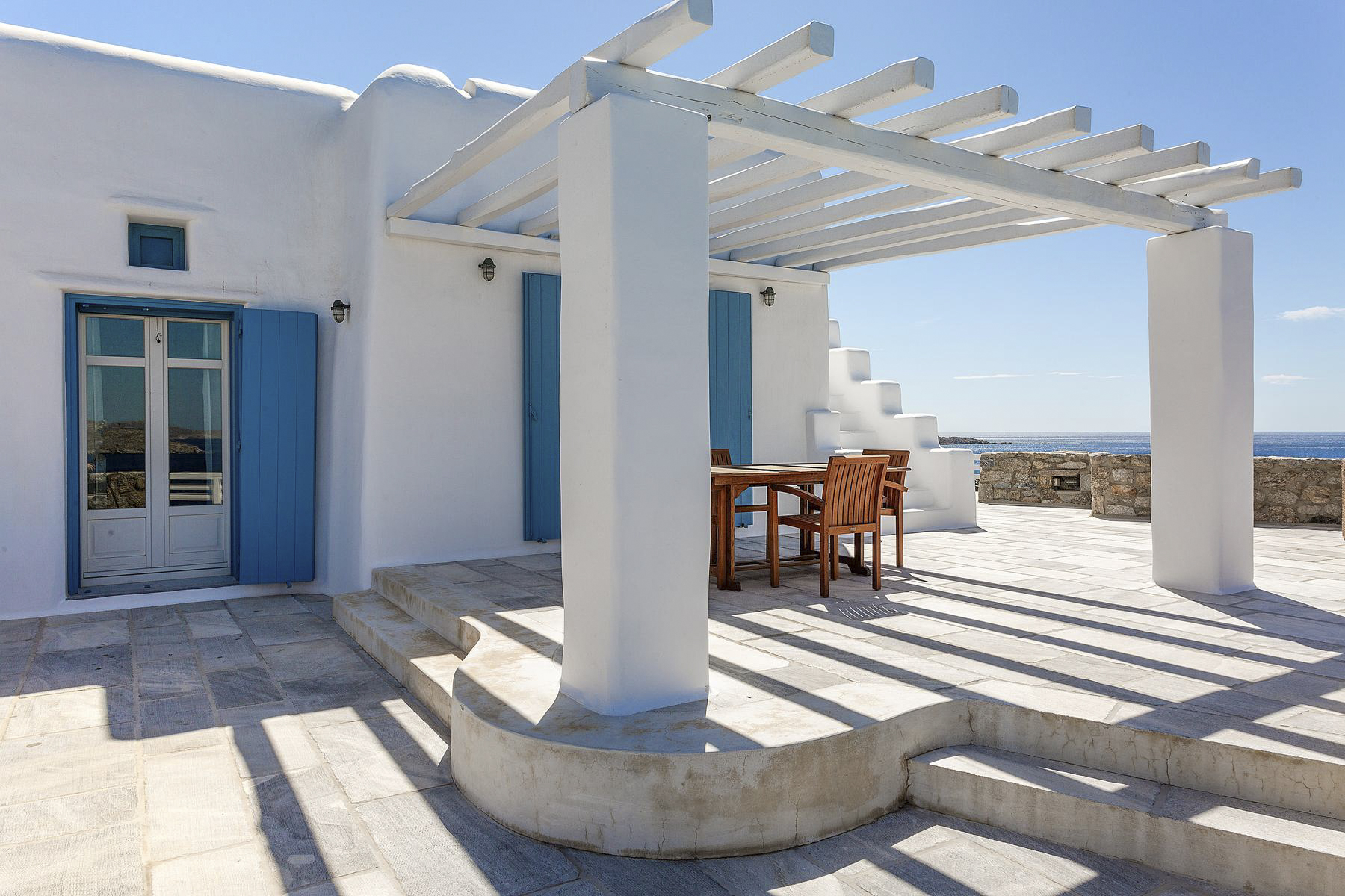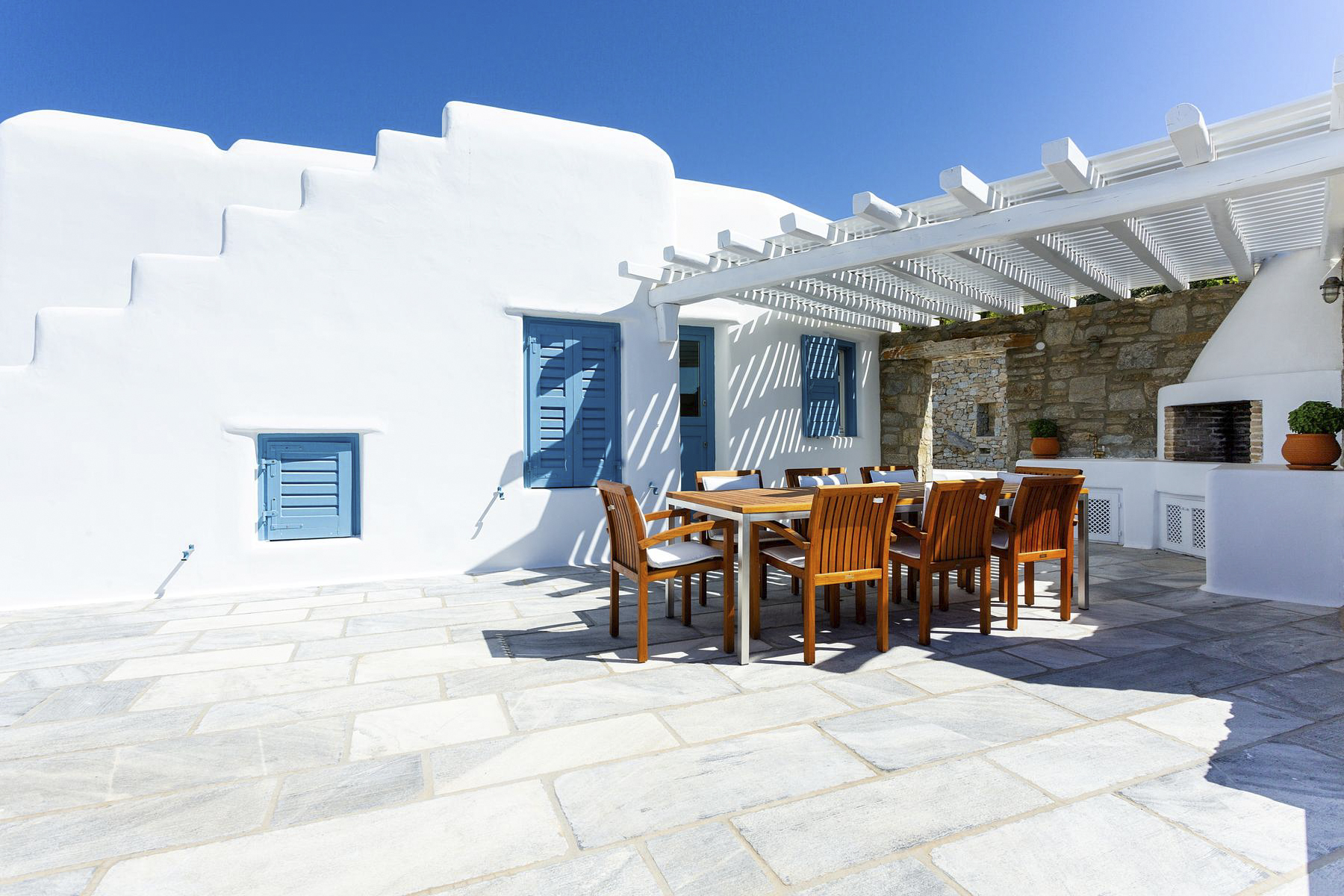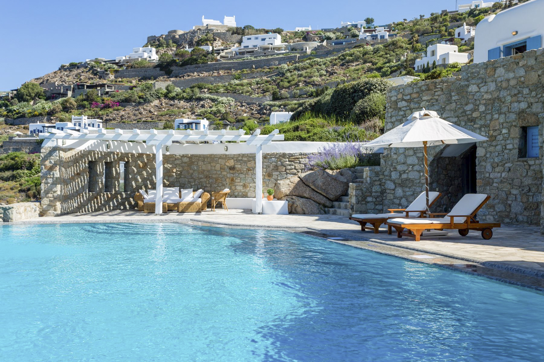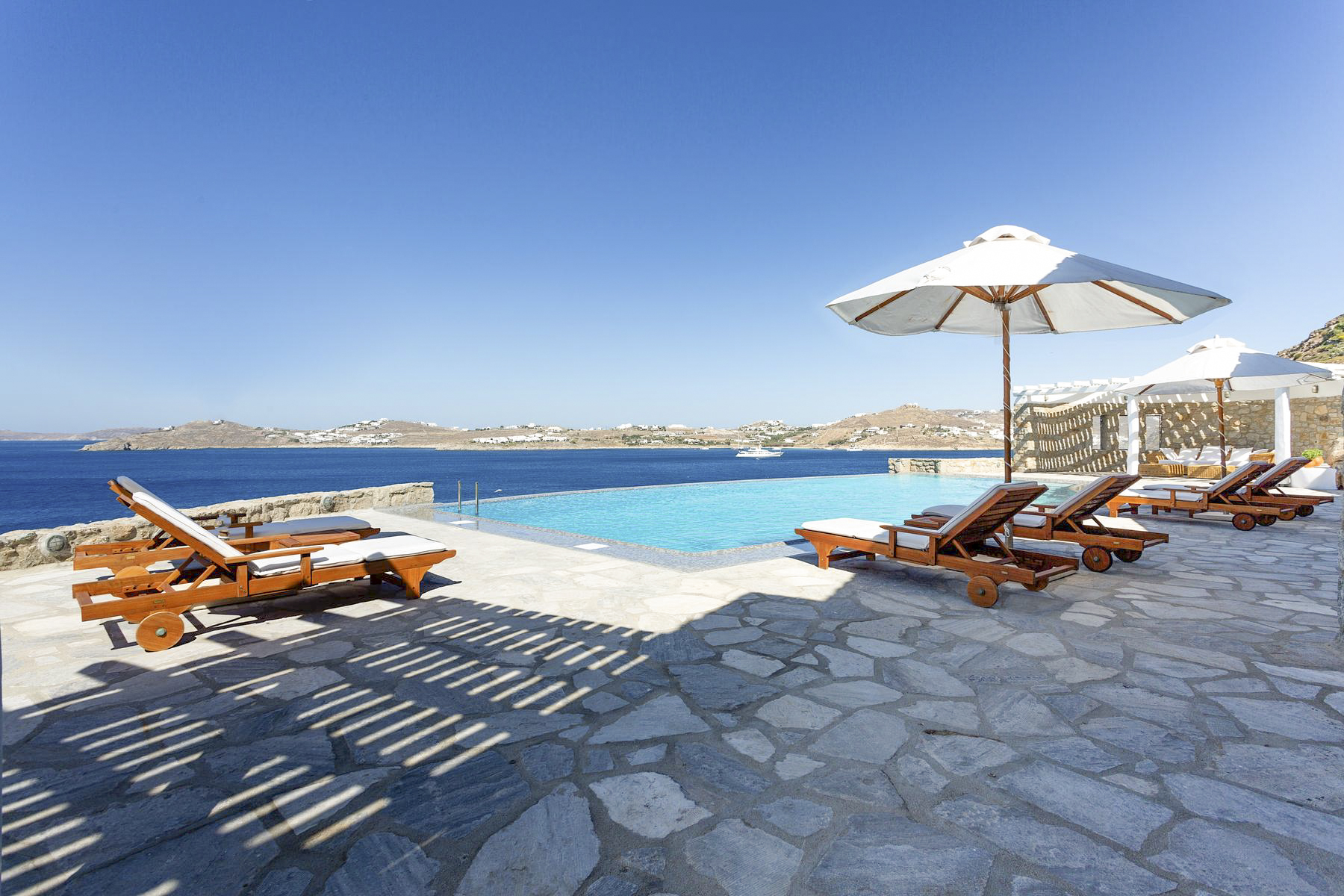 Near to Mykonos Town, and 3.5km from the villa, are the Mykonos Windmills. This group of 16th-century buildings are picture-worthy with their white magnificence and idyllic spot looking out towards the sea. You could also visit Little Venice – a collection of picturesque 18th-century homes on the shoreline. There you can grab a bite to eat at one of the cafés or restaurants.For days spent on the beach, there are 25 beaches for you to choose from. Psarou Beach is 400 metres away from the villa with calm waters for swimming. There’s also Elia – a favourite beach with families because of its sheltered shore and access to facilities – or Platys Gialos and Kalafatis Beaches which are renowned for water sports such as sea kayaking.