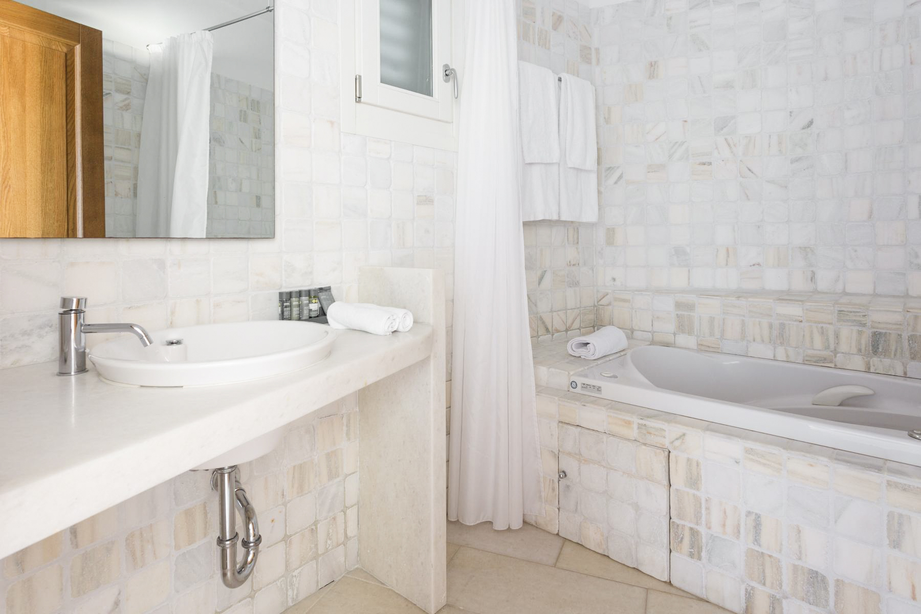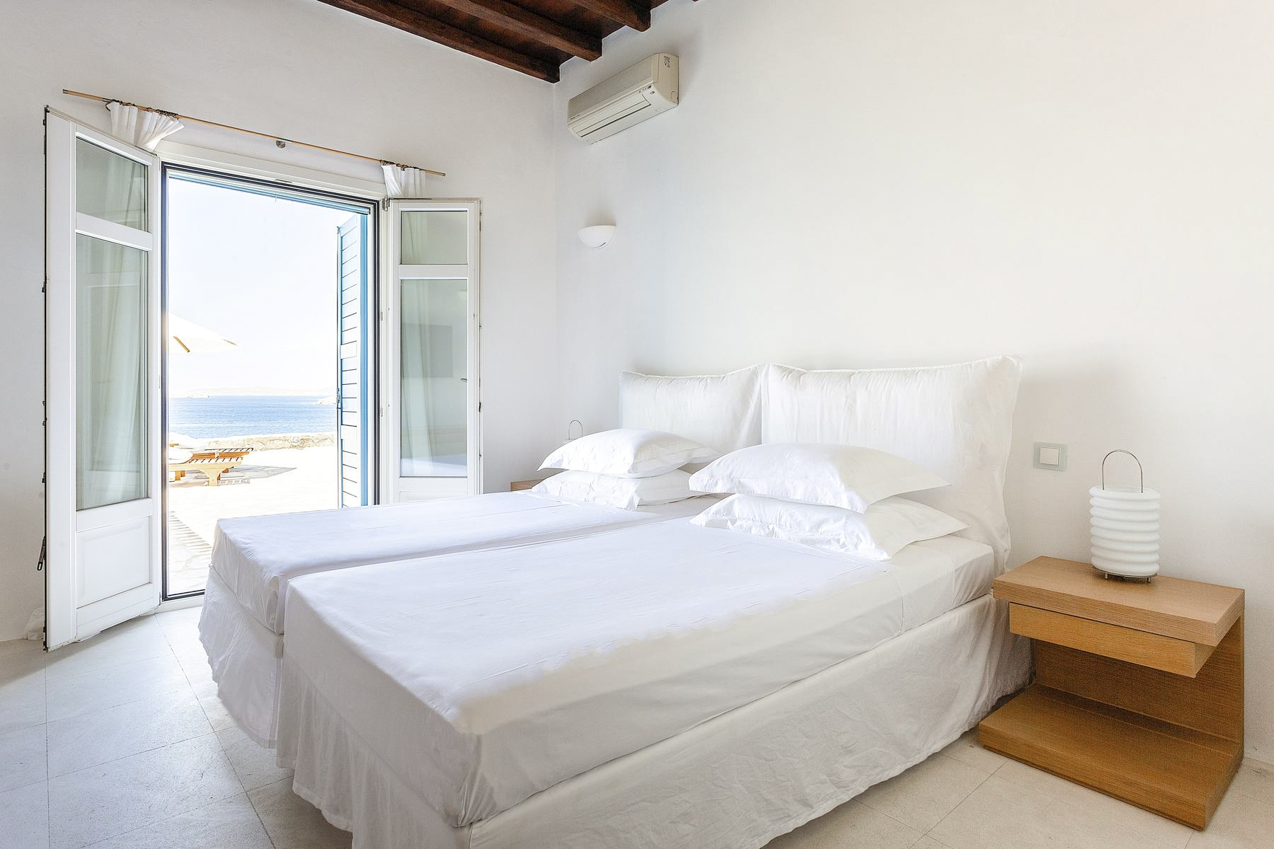 Villa Royal Blue sleeps 11, and there are five bedrooms and four bathrooms on-site. All are white for a bright and light feel, and the master has a beautiful beamed ceiling and a neat en-suite bathroom. Extra ‘luxe’ additions include Wi-Fi and air conditioning, and toiletries and towels are provided. Did we mention, there’s dedicated daily cleaning staff and 24/7 security for a carefree stay too.