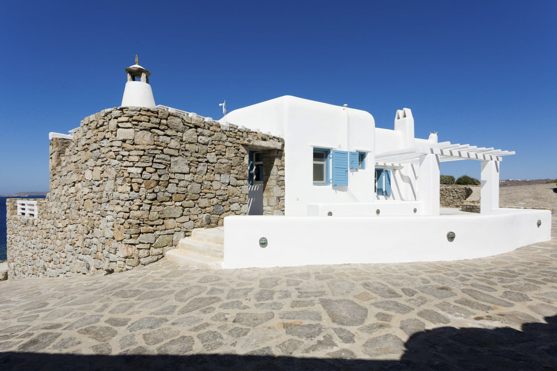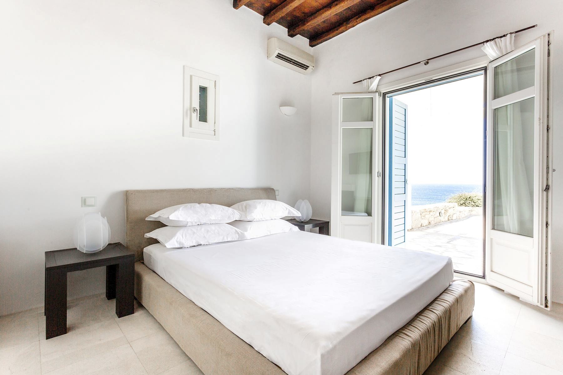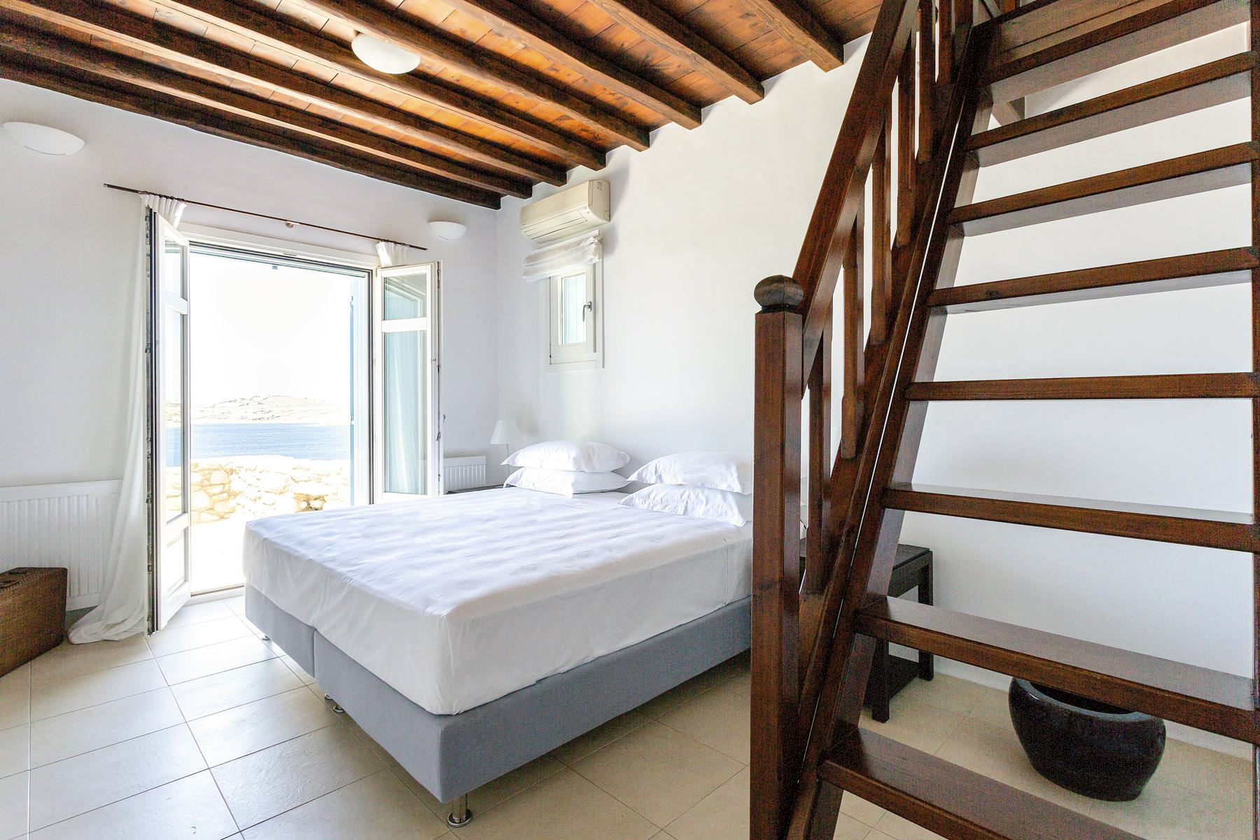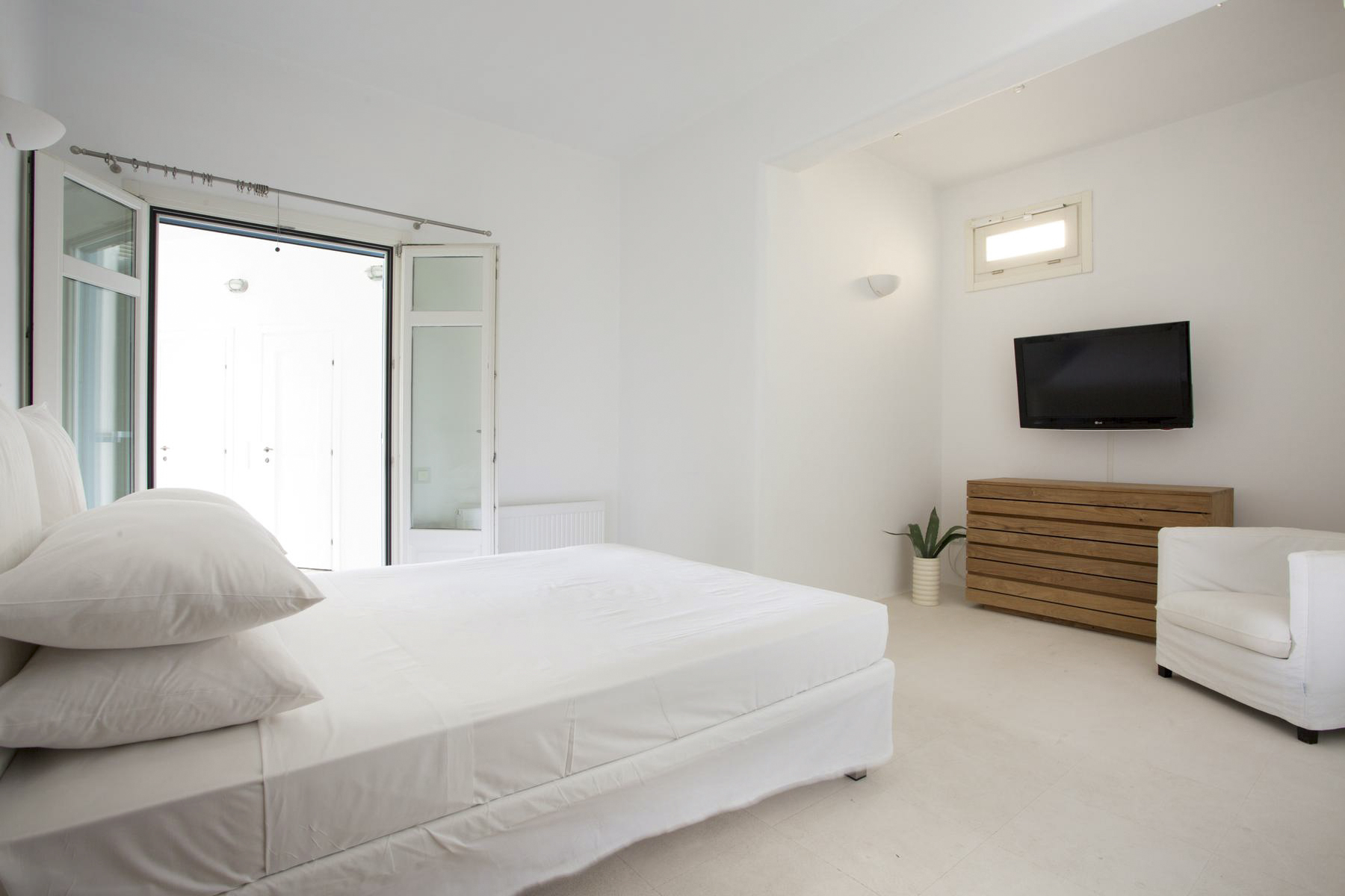 Out in the garden, you’ll find plenty of places to sit and relax in the sun or the shade. The cliff-edge pool is the prime spot to take in that view in all its glory (which is especially spectacular at sunset), and there are cushioned sun loungers on the paved terrace if you’ve had your last dip of the day. There’s also a dining area for eating al fresco and a BBQ for cooking up a storm.With the lively centre of Mykonos, with historic sites, shops and taverns a 15-minute drive away and a beautiful sandy beach a short 400-metre walk, Villa