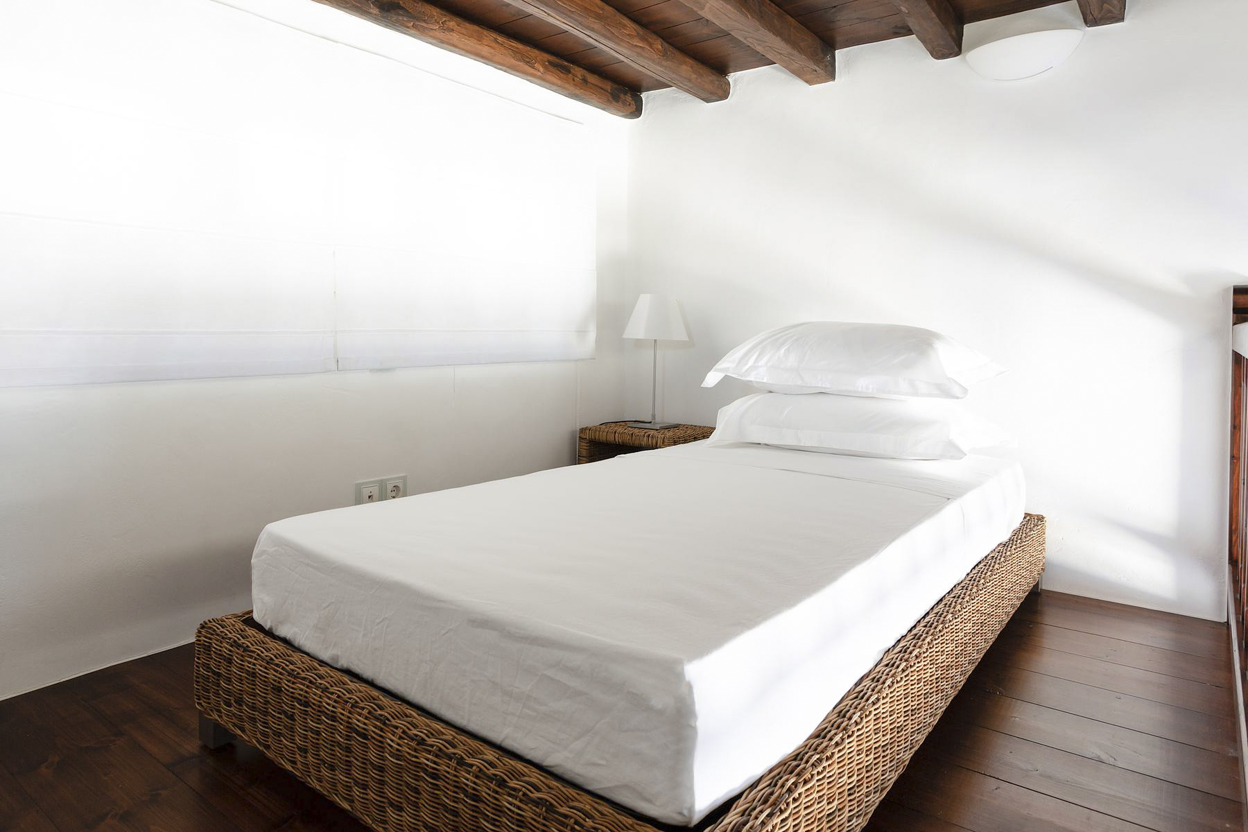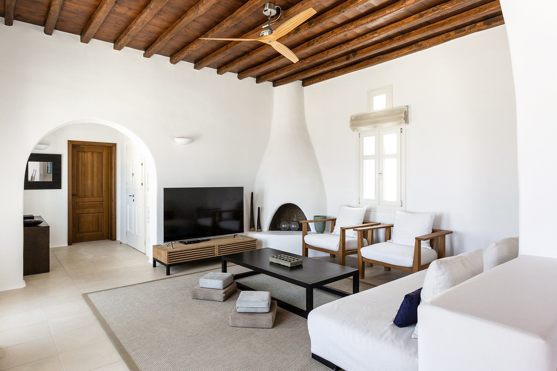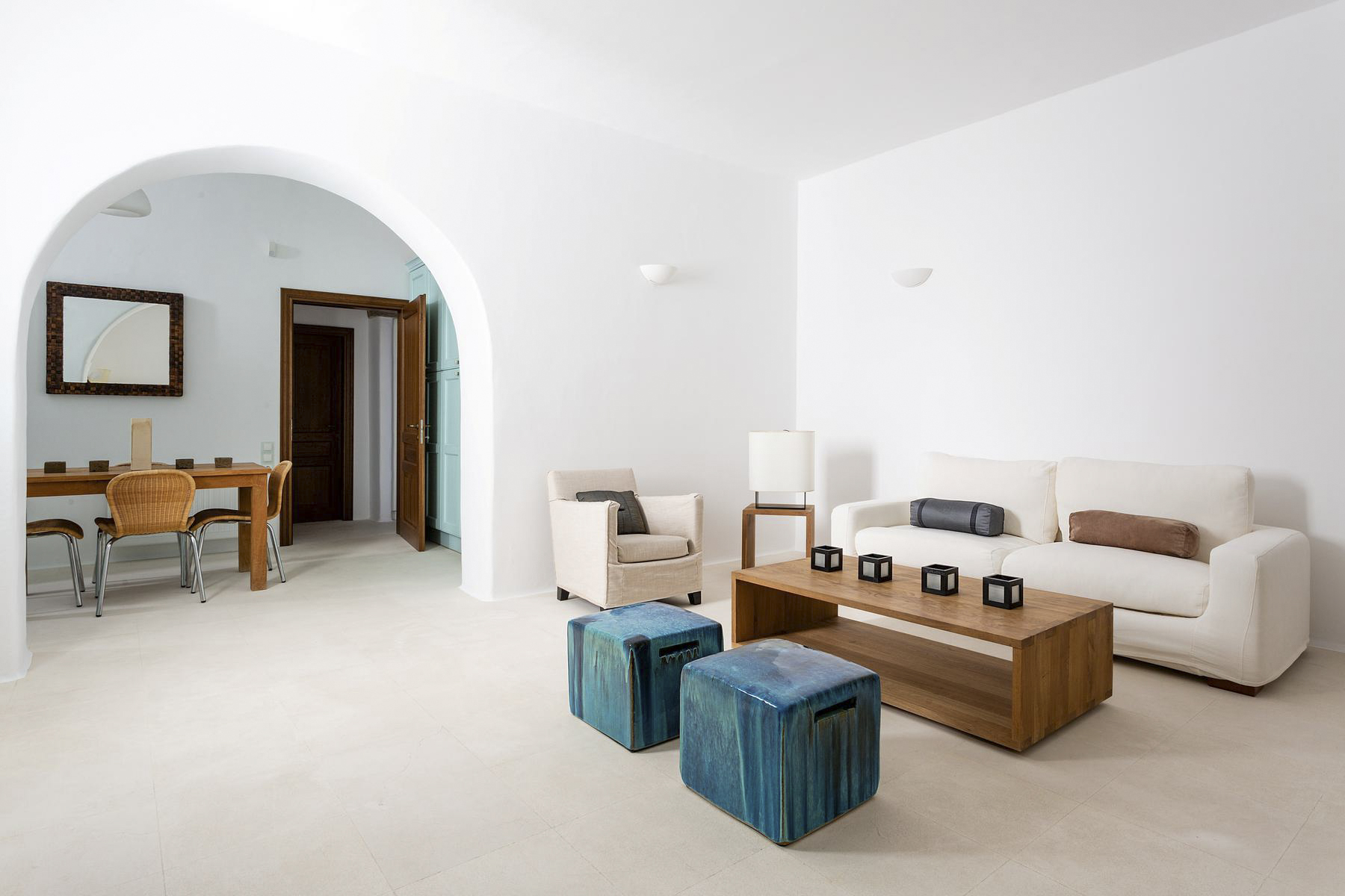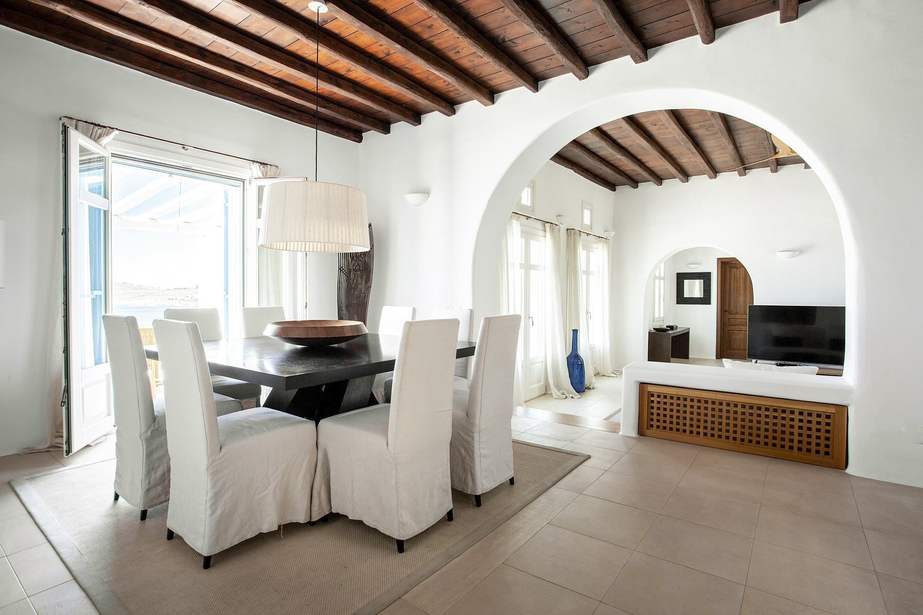 The villa is traditionally Mediterranean in style with whitewashed walls, rustic stone features and painted blue shutters. The contemporary interiors are splashed with the bohemian spirit of wooden furniture, wicker baskets and intricate art pieces. There’s an elegant beam-ceilinged sitting room with comfortable sofa and flat-screen TV, which adjoins to the similarly stylish dining room.