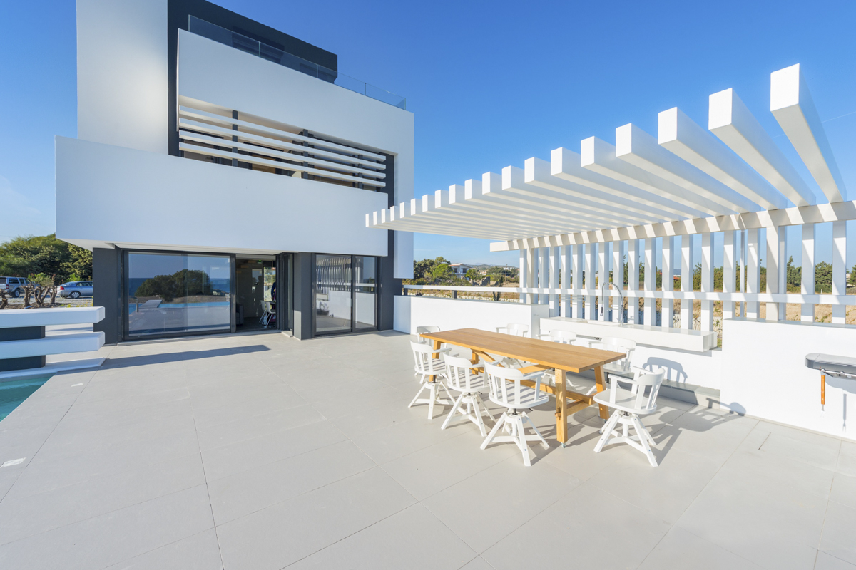 A modern villa for eight with a gorgeous Aegean Sea view. Villa Pindar is located on the beach close to Gennadi village on the south-eastern coast of Rhodes, just a few steps from the sea. With a large, salt water pool, it’s the perfect place for a medium-sized group to enjoy this tranquil part of the island. A large terrace provides a panoramic sea view and has a barbecue and dining area which is the ideal setting for a meal with friends. Sun loungers with parasols let you enjoy the reliably sunny climate that Rhodes is known for. The villa is architecturally striking and serves as an eye-catching backdrop to your time on the terrace. Inside, it’s equally contemporary, with a spacious living room equipped with a large flatscreen TV, a big, comfortable sofa you can really stretch out on and a games room with games console. The sleek kitchen is equipped with a dishwasher, microwave, large fridge freezer and all the usual amenities. There are three bathrooms and two double bedrooms which open out onto the furnished terrace. There is also a bedroom with bunk beds for the children, and the large sofa-bed in the lounge serves as a fourth bedroom for two guests. Villa Pindar’s proximity to the village centre is another plus point – restaurants, bakeries, cafés and beach bars are easy to find, along with useful amenities like a supermarket and pharmacy. Its position on the coast also makes it easy to reach some stunning sights to both the north and south. Among them, the beautiful beaches of Prasonisi and the natural wonders of Vouno Kalathos Park and the Epta Piges. Lindos with its famous clifftop Acropolis is only 20-25 minutes’ drive from Gennadi, and if you want to head for the island’s capital, you can reach it in around one hour. Almost anywhere you may encounter along the way will be worth stopping for – the stunning beaches and rugged scenery of Kolympia and Archangelos being just two examples.