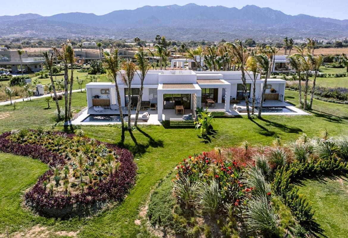 Leave a light footprint when you vacation in Villa Barefoot, near Tigaki beach, on the north of the Dodecanese Greek island of Kos, in the heart of the Aegean Sea. This eco-friendly villa has one double bedroom, and can comfortably accommodate up to four guests, ideal for a small family, or two couples sharing. The villa is part of a small complex that is surrounded by nature, reflecting the earth’s delicate ecosystem and zeitgeist green consciousness, combine this with a warm Greek welcome and a peaceful ambience, for the perfect holiday. The one-storey Villa Barefoot is set in impressive tropical gardens, populated by tall palm trees, local plants, and colourful flowers. The villa has its own small grounds, with a private heated swimming pool, and an alfresco living space, with landscaped gardens and a sandy coastline with breathtaking views. Villa Barefoot has been designed to embrace ethical luxurious living, with modern-day amenities, including complimentary Wi-Fi and air conditioning throughout, and state-of-the-art technology. The interiors are furnished with pieces made from locally sourced natural wood and decorated in a cool calm palette of crisp clean whites, and subtle earth tones.