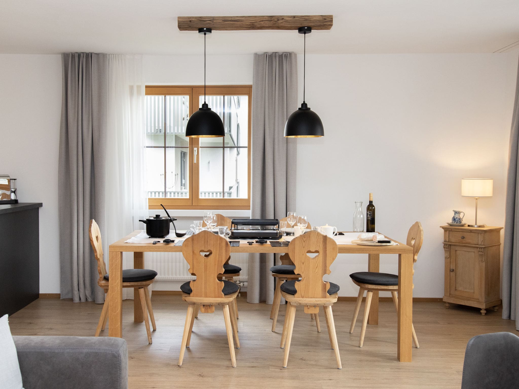Two beautifully appointed double bedrooms provide restful retreats after days exploring the mountains, while the fully equipped kitchen caters to all culinary needs. Complete with dishwasher, oven, four-plate ceramic hob, microwave, and Nespresso coffee machine, the kitchen also includes traditional Swiss touches including a raclette grill and fondue set for authentic Alpine dining experiences. Two modern bathrooms, one featuring a luxurious bathtub and the other a walk-in shower, ensure convenience for all guests.