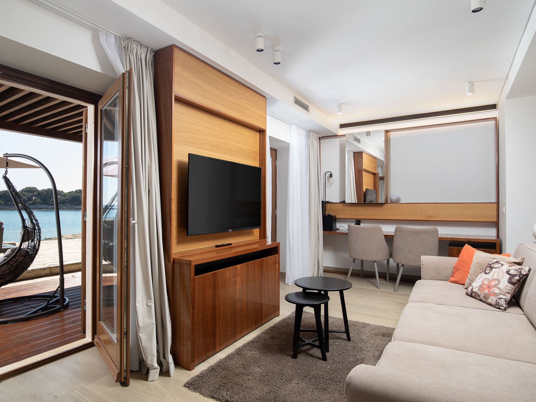 The expansive 4,400 square metre fenced property provides complete privacy and direct access to your own stretch of coastline. The heated swimming pool measures 7 by 4 metres with an internal staircase, available from March through November. Multiple terraces offer diverse outdoor experiences, from the covered 25 square metre terrace perfect for al fresco dining to sun-soaked deck areas with comfortable loungers. The outdoor shower provides refreshing relief after swimming, while the barbecue facilities enable memorable evenings under the stars. The property includes a private beach area where you can step directly into the crystal-clear waters of the Adriatic.