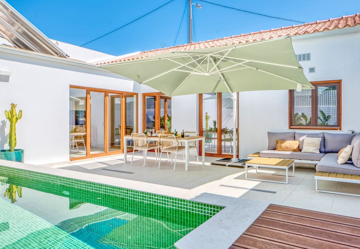 The lounge area is a haven of comfort, with plush seating and a large flatscreen TV for your entertainment. Here, you can stay connected with high-speed internet access, ensuring you can share your holiday memories or attend to any work if needed. In the hottest summer days, the air-conditioning keeps the interior cool and comfortable so you can unwind in style. The villa’s dining space is perfect for sharing meals and stories with loved ones, and it’s complemented by a fully equipped kitchen that’s a dream for culinary enthusiasts. Modern appliances and all the necessary utensils await, making it a breeze to whip up delicious meals or enjoy a leisurely breakfast before venturing out to explore the Algarve.