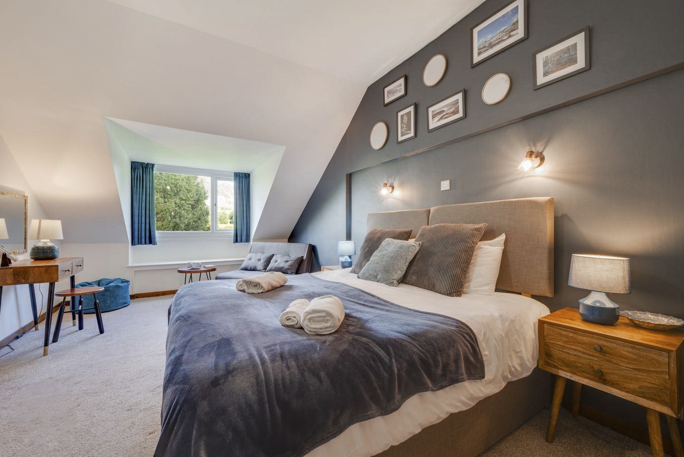 The secluded Blaenau Barn offers the very best of Snowdonia. Sleeping up to eight guests, the beautiful stone built, 4 bedroom, barn conversion is located on the outskirts of Llanffestiniog, less than 1 mile from the village pub and within 3 miles of Blaenau Ffestiniog. Surrounded by gorgeous countryside and stunning mountainous views with a magical waterfall 2 minutes away, This is the perfect place for walking and biking enthusiasts of all capabilities and those who want to gather together in a beautiful retreat in an inspiring location. Peaceful, private and wonderfully scenic, Blaenau Barn offers a warm farmhouse welcome as soon as you open the door. Enjoying underfloor heating, the hallway opens up to an attractive open-plan living area. Guests will love the wooden beams, high ceilings, gorgeous wooden floors and cosy evenings in front of the large roaring wood-burning stove. The lounge offers snuggly sofas and armchairs that bask in the warmth of the fire. A television and bookcase filled with books, games maps and local information are provided for your entertainment. The dining space is large and characterful with a large feature wall map, a talking point whilst enjoying fabulous feasts. Step out through the large sliding doors to experience wonderful views on your garden patio. The country-style kitchen is modern and spacious, boasting all of the appliances you could need including an electric range oven, dishwasher, huge fridge freezer, wine cooler, microwave and coffee machine. You will find two gorgeous, characterful bedrooms on the ground floor. Cosy and stylish, Bedroom 1 has a kingsize bed and underfloor heating. Bedroom 2 also has a comfortable kingsize bed. Both bedrooms can be rearranged into twin rooms if required. Located on the ground floor, you will also find a convenient separate shower room and a utility room with washing machine and dryer as well as a WC and sink. Upstairs are two large and characterful bedrooms. Bedroom 3 has a Super king bed and en-suite bathroom with shower room and Bedroom 4 has a Super king bed and en-suite bathroom with a luxurious double-ended bath. Both bedrooms have a double sofa bed and can be used as family rooms. Both bedrooms also benefit from the fabulous garden and mountainous views. The property is family-friendly with a travel cot, highchair and stairgate provided if required. Outside the large, peaceful enclosed garden enjoys plenty of space for fun and games. Surrounded by stunning scenery, there is a delightful mountain stream and picturesque ponds at the edge of the garden boundary.