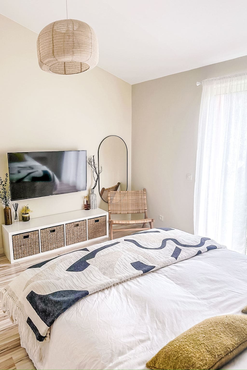 Four well-appointed bedrooms accommodate up to eight guests comfortably. The master bedroom features a luxurious French bed and direct terrace access, while two additional bedrooms offer flexible sleeping arrangements with both double and twin bed configurations, each with its own flat-screen television. A unique studio bedroom provides complete privacy with an en-suite shower room, making it perfect for teenagers or guests seeking independence.