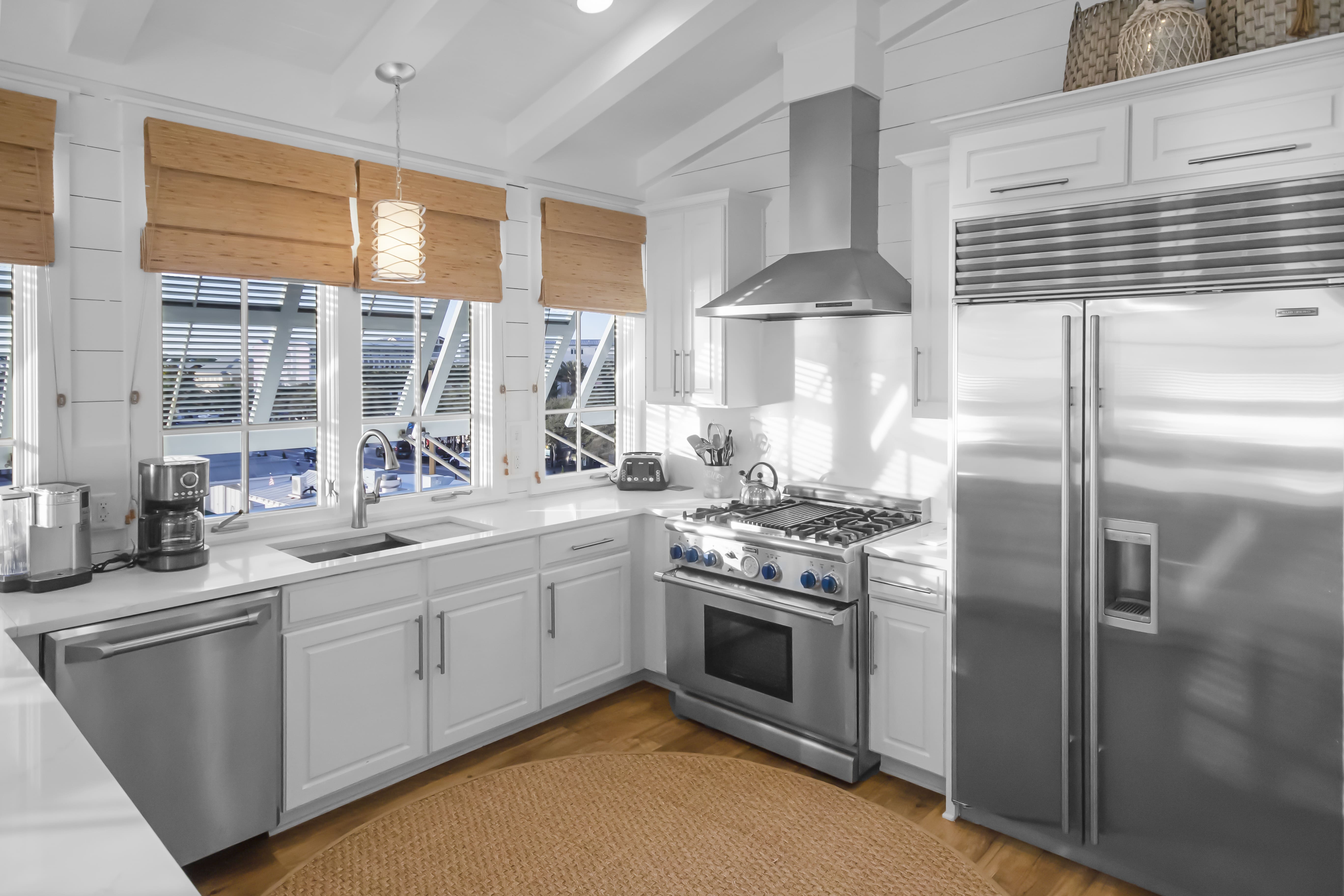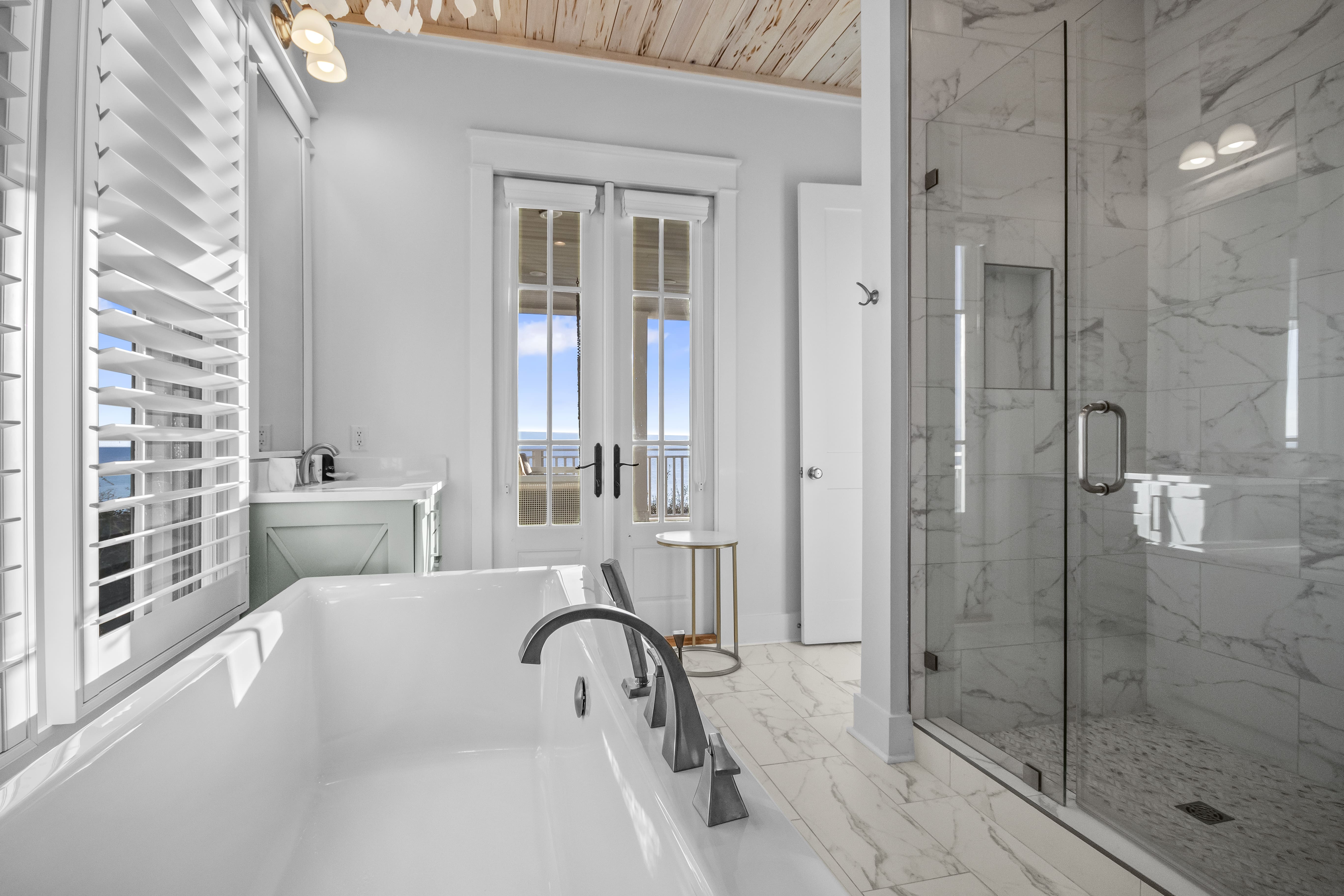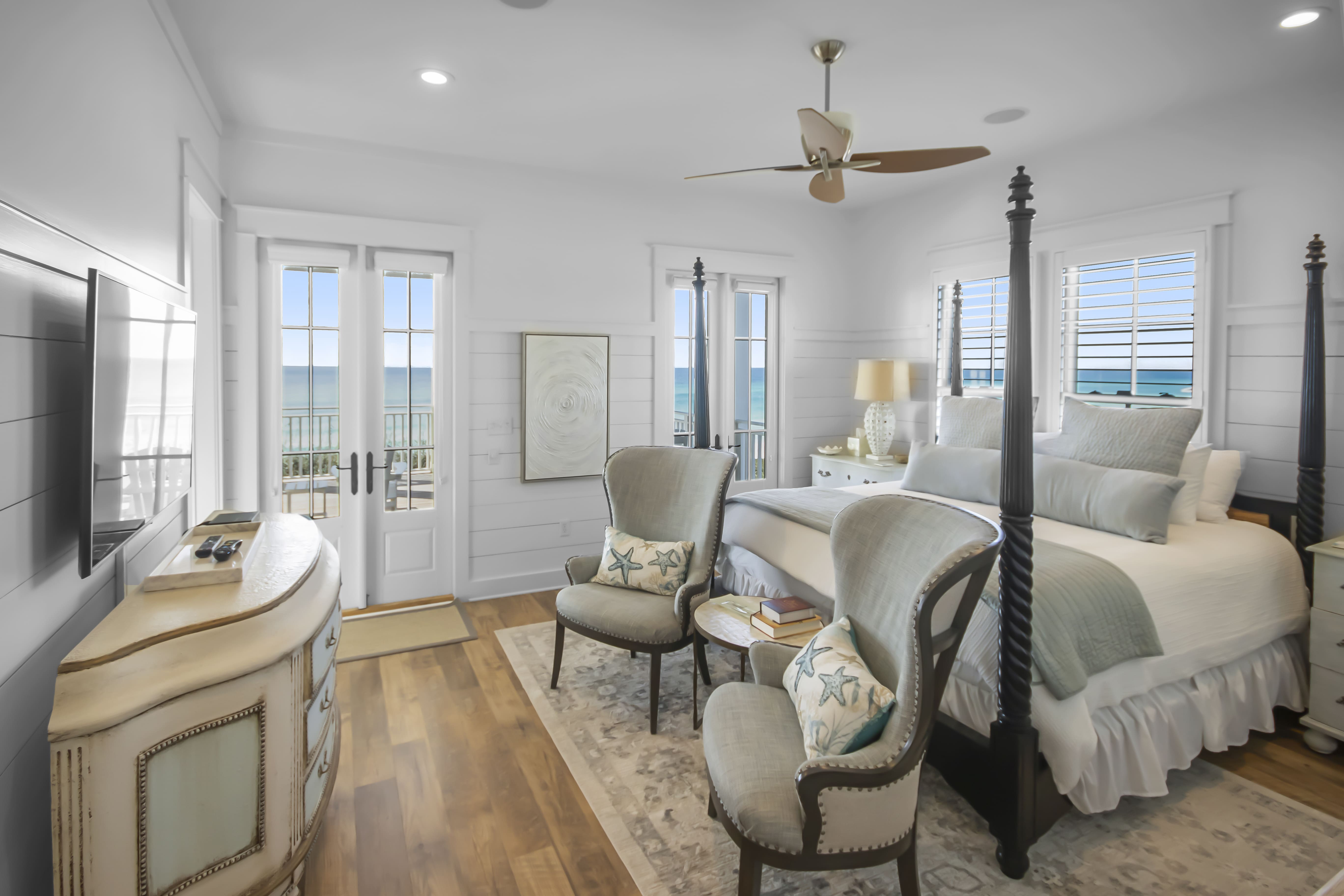 The interior of the villa is a masterclass in sophisticated design and functionality. Spread over three floors, it offers spacious living areas that seamlessly blend relaxation and style. The state-of-the-art kitchen on the third floor is perfect for culinary enthusiasts, while the living room, with its cozy fireside setting, invites you to unwind. Each of the four bedrooms is tastefully decorated, providing a private sanctuary with en-suite bathrooms for ultimate convenience. The primary bedroom boasts a private porch overlooking the Gulf of Mexico, offering a serene spot for morning coffee or sunset views.