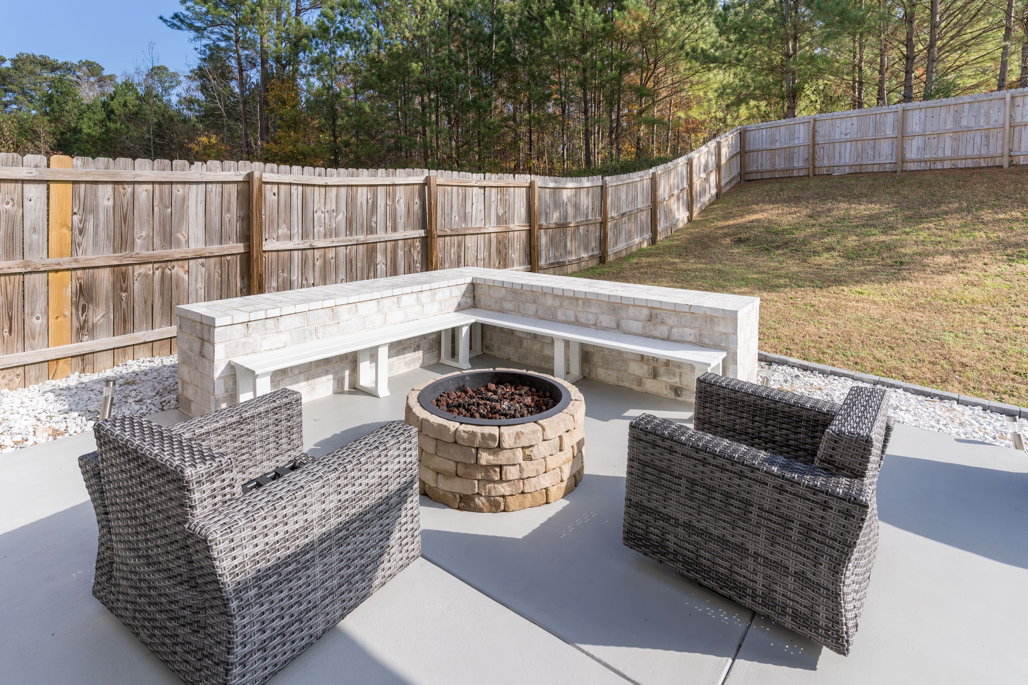 The villa’s outdoor spaces are equally inviting, offering a fire pit for evening gatherings and an alfresco lounge to enjoy Atlanta’s pleasant weather. The surrounding gardens provide a lush backdrop, creating a tranquil oasis just a short drive from the vibrant cityscape of Atlanta.