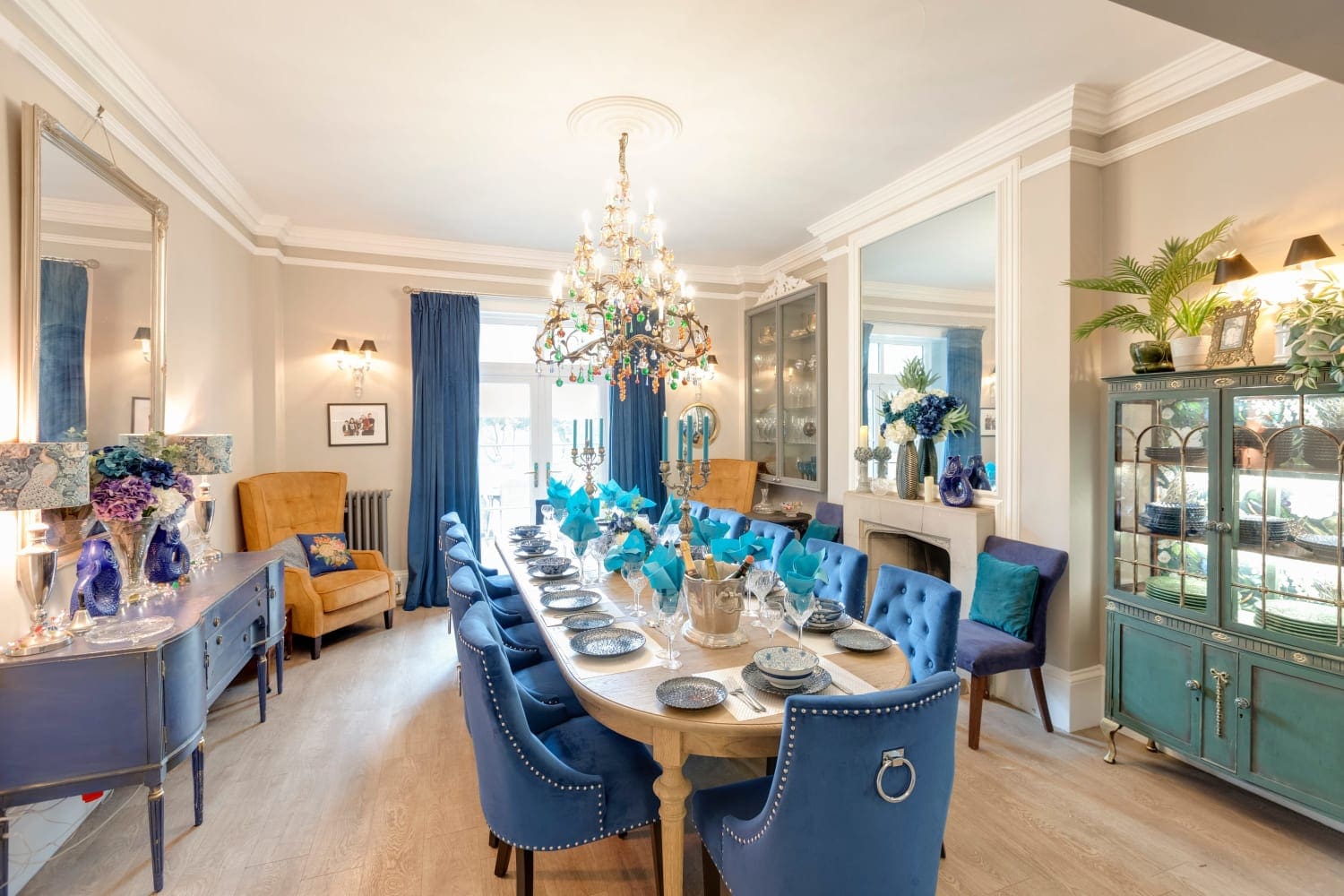 Step inside to discover a harmonious blend of traditional English decor and modern amenities. The spacious living areas are perfect for socializing, featuring plush seating and a grand piano for musical evenings. The fully equipped kitchen caters to all culinary needs, while the elegant dining room sets the scene for unforgettable meals. The main house accommodates up to 12 guests, with additional bedrooms available in the adjacent coach house for larger groups.