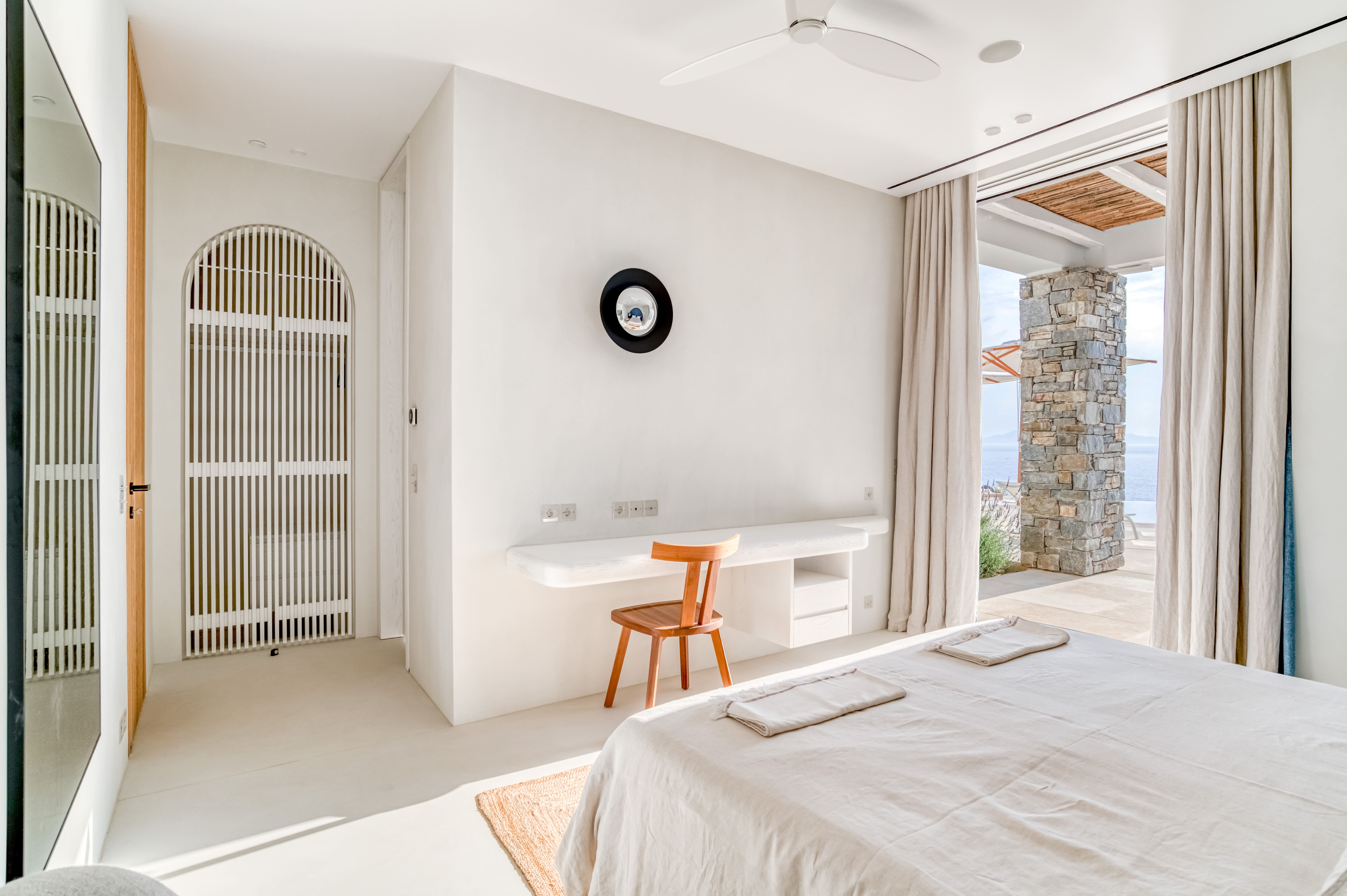 Step into a world of elegance as you enter this luxury villa rental in Paros. The interior exudes a minimalist charm with an open-plan living area that seamlessly flows into the dining and kitchen spaces, all designed to maximize the mesmerizing ocean views. The villa boasts five spacious bedrooms, each with an en-suite bathroom, providing ample space for families or groups of friends. A fully equipped kitchen awaits those who love to cook, while floor-to-ceiling windows ensure the stunning sea views are always within sight.