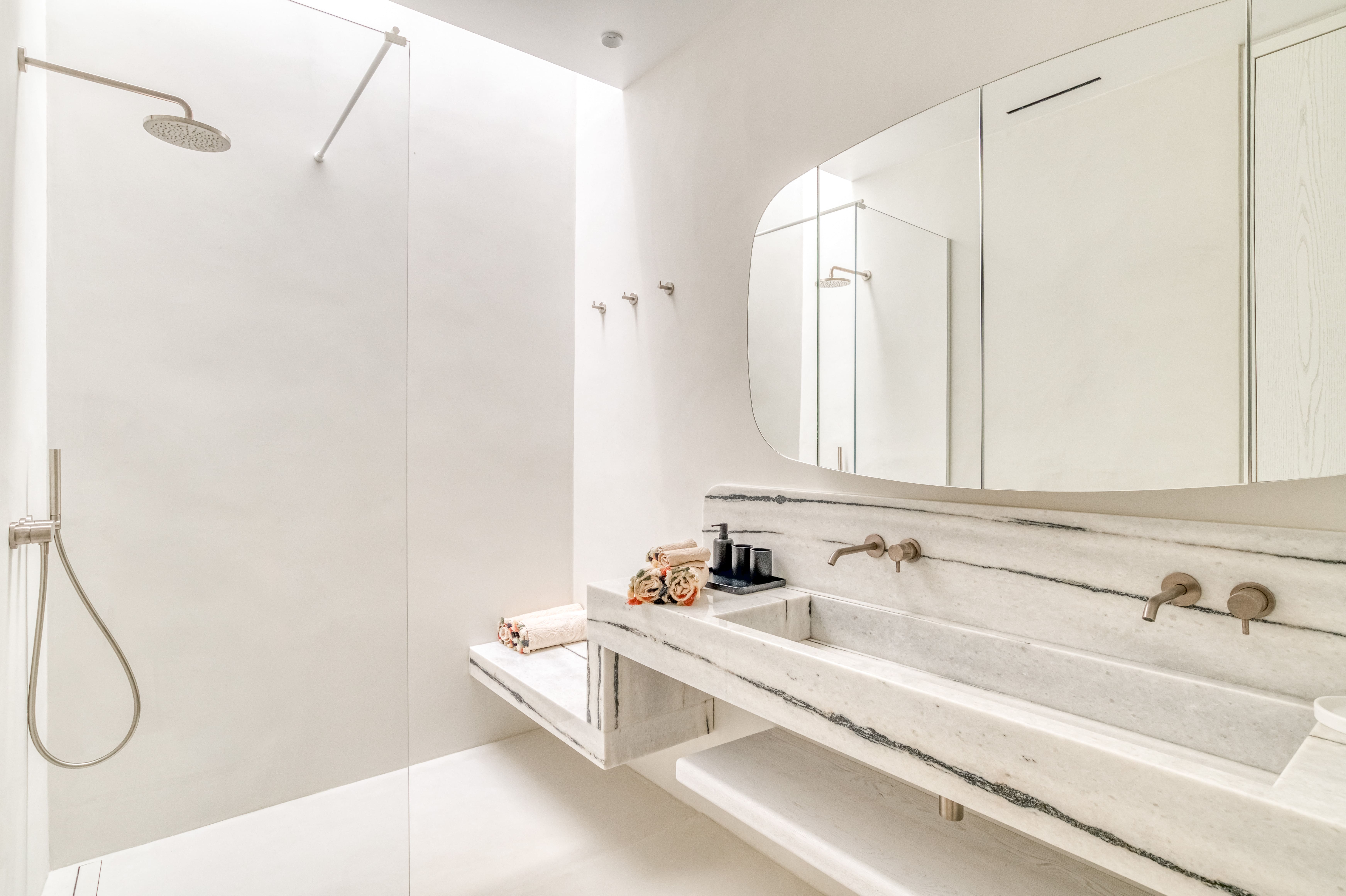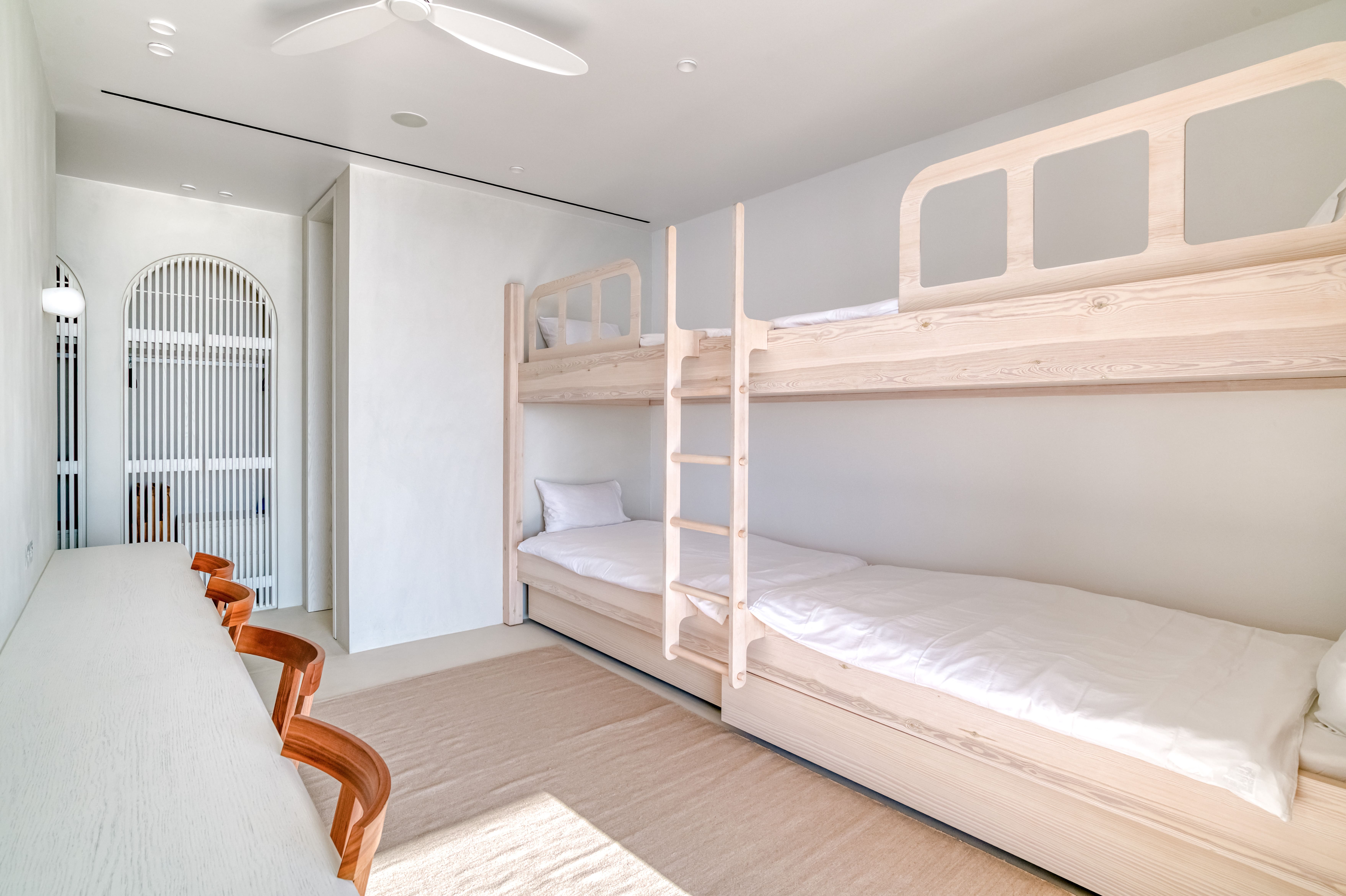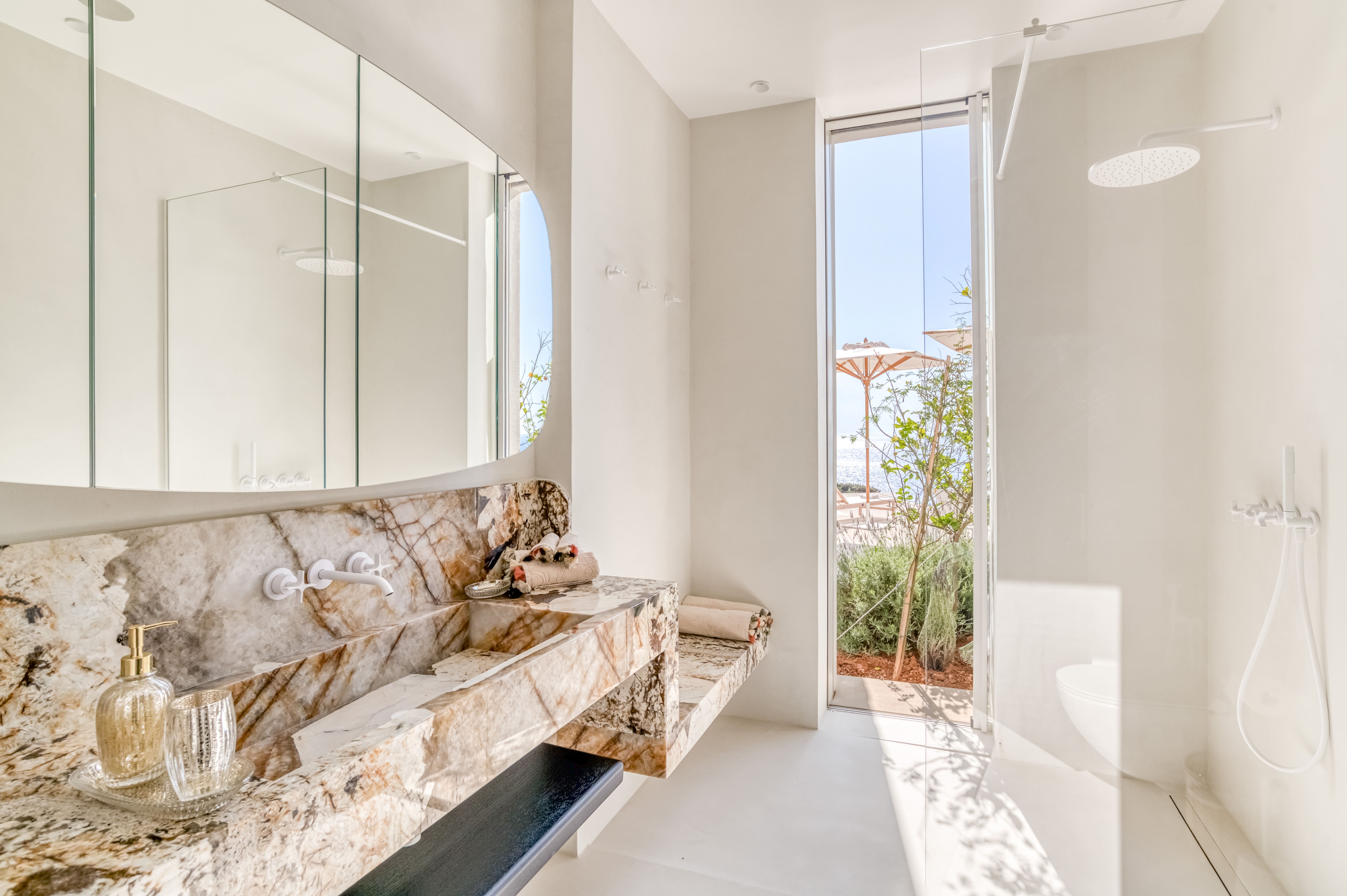 Step inside this stunning apartment to discover minimalist interiors that exude sophistication. The spacious living area is designed for comfort, featuring contemporary furnishings that complement the clean white color palette. Each of the six bedrooms offers direct access to private terraces or courtyards, inviting natural light and the soothing sounds of the sea into your personal sanctuary. With six bathrooms, every guest enjoys privacy and luxurious amenities. The kitchen is fully equipped with state-of-the-art appliances, perfect for preparing local delicacies or hosting a dinner party.