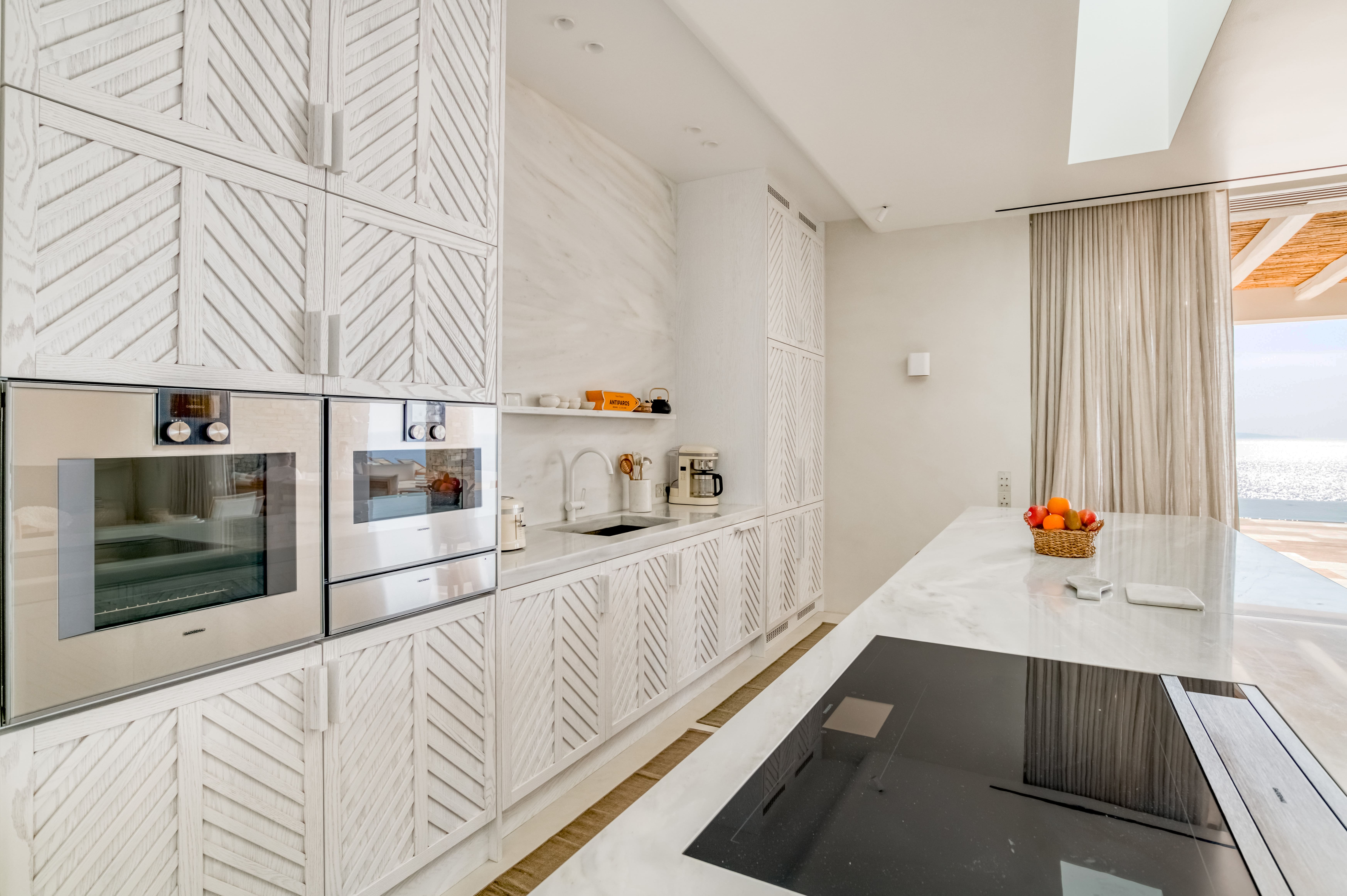 The villa’s interior exudes sophistication with its spacious living areas and six elegantly appointed bedrooms, each with a private bathroom. Designed for relaxation, the open-plan living space features modern furnishings and a fully equipped kitchen, perfect for preparing Greek delicacies. Large windows ensure you never miss the stunning seascape, while air-conditioning keeps you cool in the Mediterranean heat.