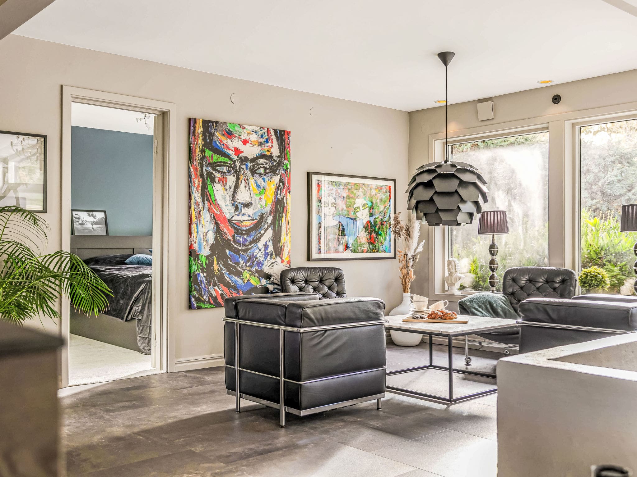 The villa is located 10 kilometers from Halmstad city center, easily accessible by car or public transport with bus stops just 100 meters away.