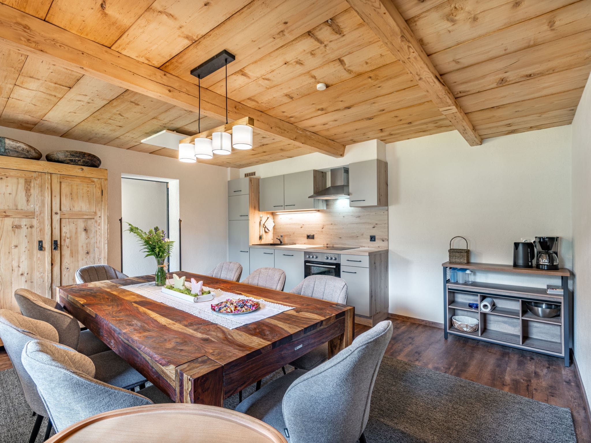 This thoughtfully designed 2-bedroom, 2-bathroom apartment showcases the finest in sustainable Alpine living. The spacious living and dining area centers around a beautiful Scandinavian wood stove, creating a cozy atmosphere after days exploring the mountains. Tasteful wooden furnishings throughout reflect authentic Tyrolean craftsmanship, while modern amenities ensure complete comfort. The fully equipped kitchen features premium appliances including a dishwasher, microwave, and electric coffee machine, perfect for preparing meals with locally sourced ingredients. Both bedrooms offer flexible sleeping arrangements with comfortable beds and en-suite facilities, accommodating up to 8 guests across various configurations including bunk beds ideal for families.
