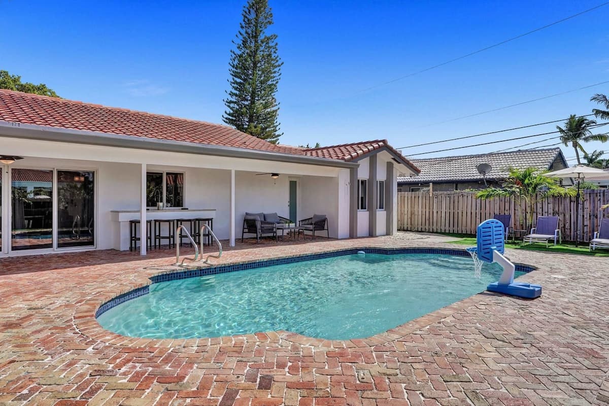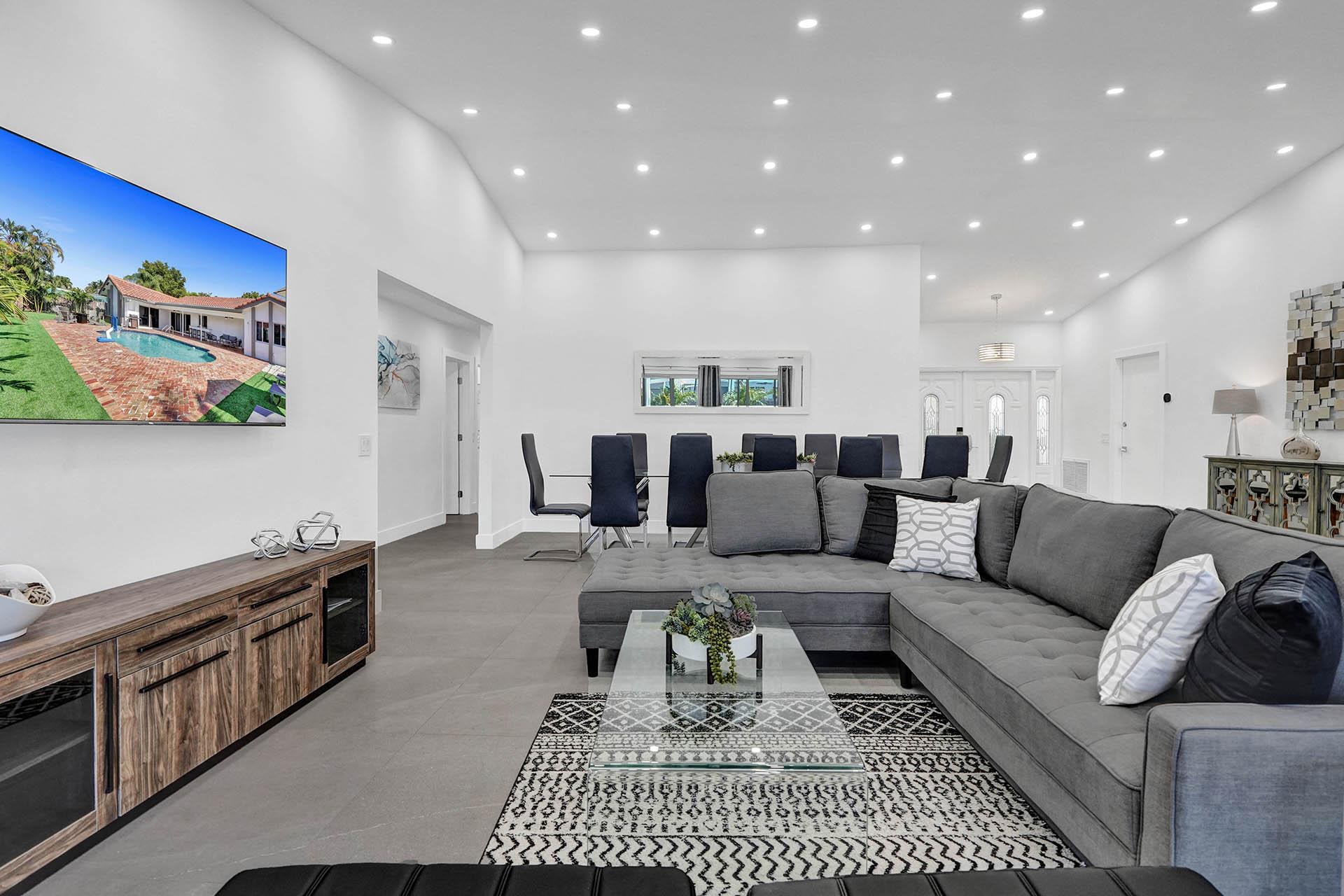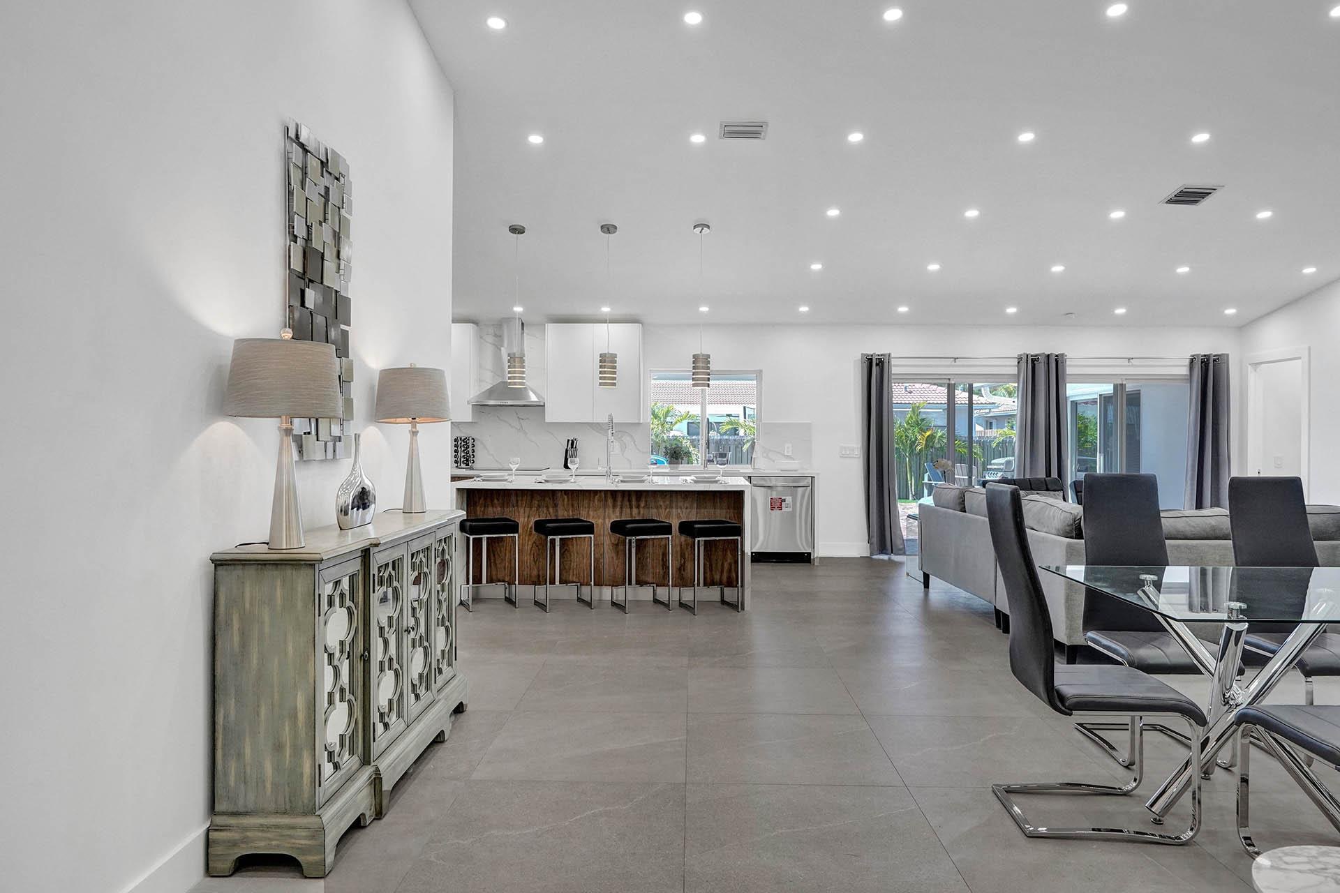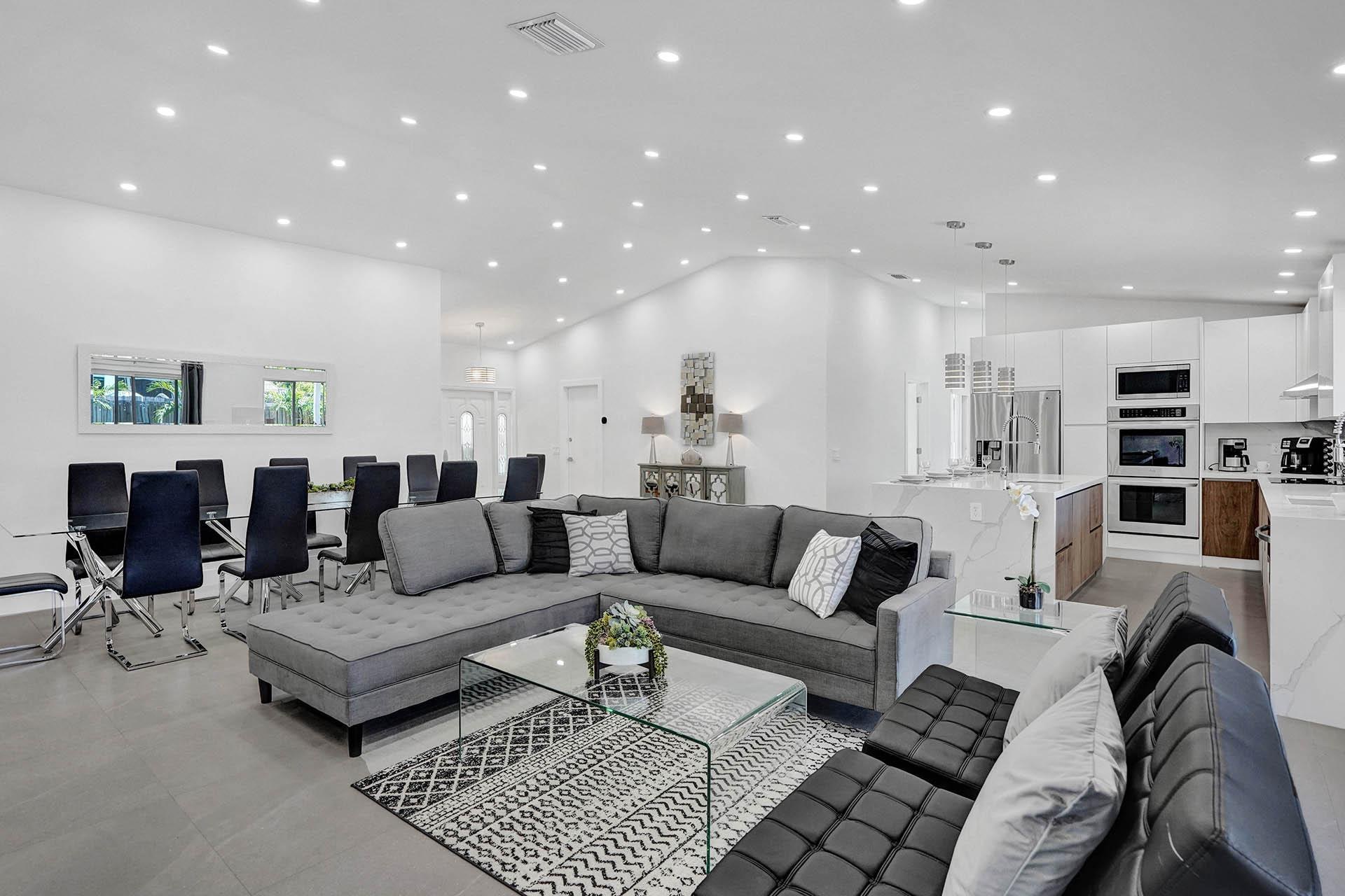 Adorned in a silver colour palette throughout, this glamorous mansion provides the perfect residence for a large group looking to lap up the Florida coastline without compromising on home luxuries. Finished to an ultra-high standard, this place oozes luxury resort vibes with its very own outdoor swimming pool, games room (featuring an air hockey table, football table, poker table, video games, home cinema, board games and work-out machines) as well as a fabulous open-plan living area that will guarantee a sociable stay. The gorgeous furnishings include custom tile work and fixtures across the entire home, while the outside spaces offer a secluded living area with pool loungers, comfy seating, an outdoor grill area and a bar. All this, plus a prime location, just eight minutes away from Hollywood Beach, allows this magnificent villa to stand out as a rental that is sure to offer a memorable vacation experience with life-long memories to cherish when it’s all over.