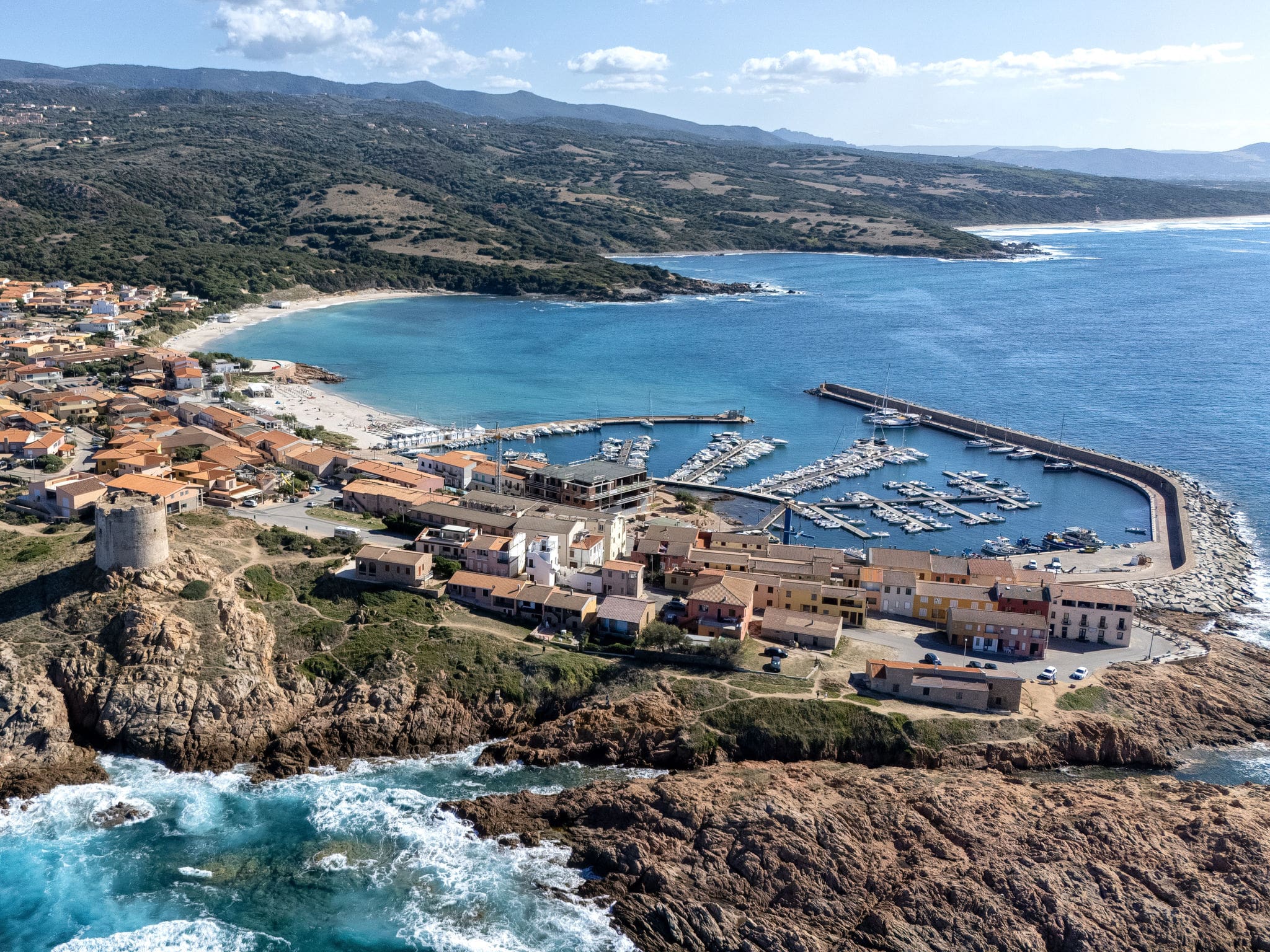 The charming coastal town of Isola Rossa lies just four kilometres away, famous for its distinctive red granite rocks that give the resort its name. Sandy beaches stretch along this protected coastline, offering excellent swimming, sailing, and windsurfing conditions in crystal-clear waters.