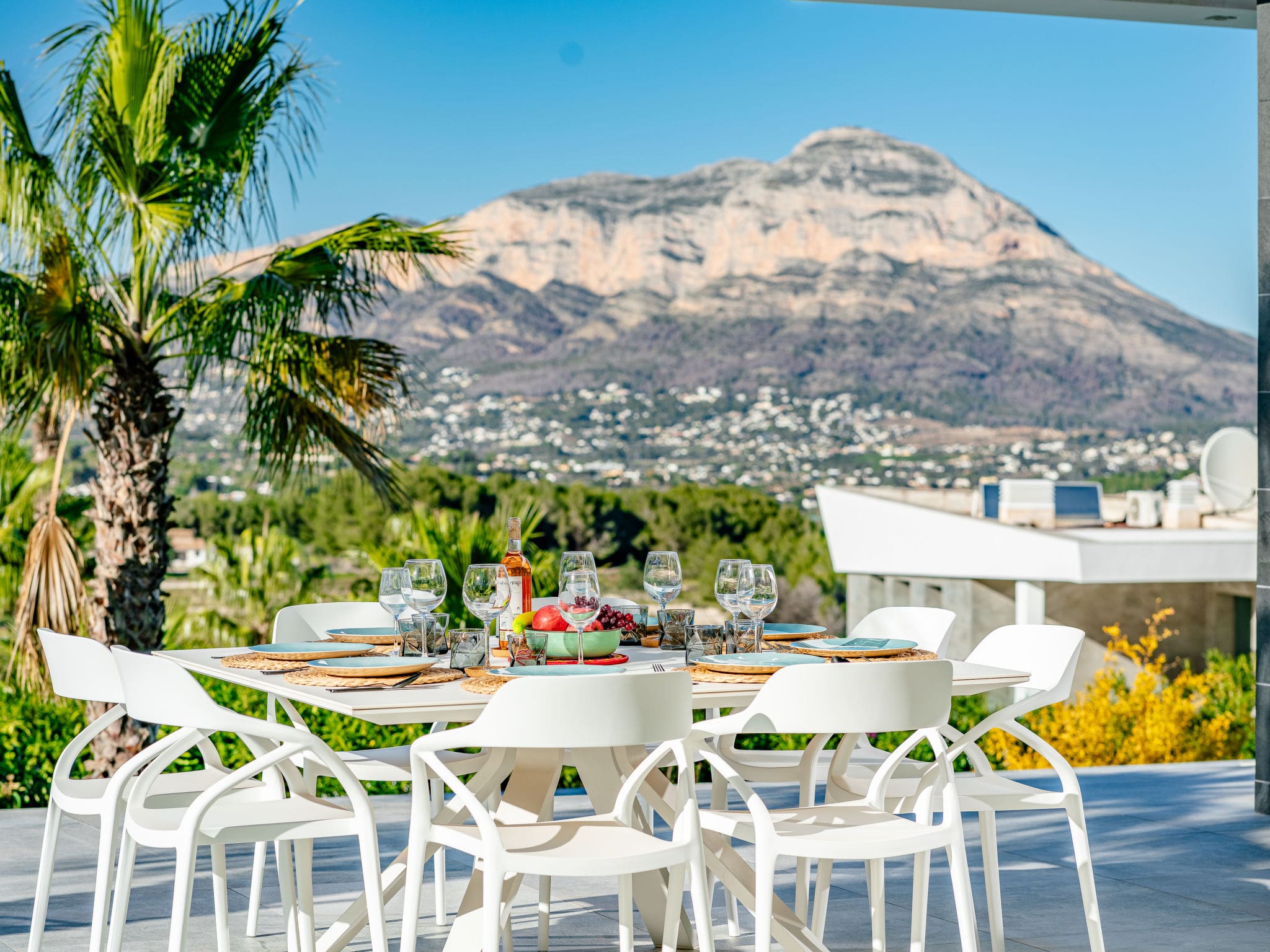 The property’s elevated position ensures privacy while maximising the spectacular panoramic views that sweep from the sparkling coastline to the dramatic Montgó massif. Comfortable outdoor furniture and sun loungers are positioned to take full advantage of the villa’s sunny southern exposure, making it ideal for both morning coffee and evening cocktails as the sun sets over the Mediterranean.