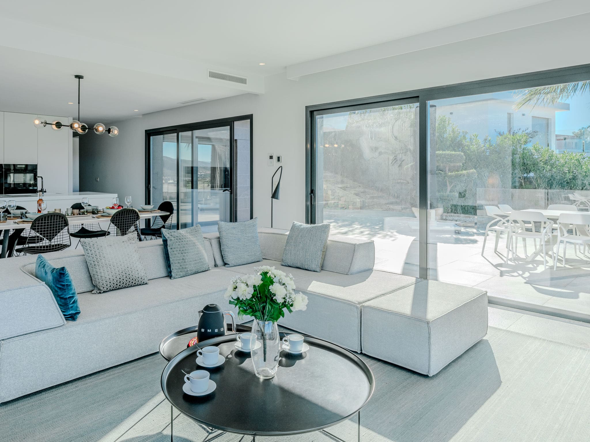 Spread across two levels and encompassing 250 square metres of thoughtfully designed living space, this modern villa showcases stylish furnishings and floor-to-ceiling windows that flood every room with natural light. The open-plan ground floor seamlessly connects the living and dining areas with a state-of-the-art kitchen featuring a cooking island, induction hobs, and premium appliances including a combination microwave and electric coffee machine. Air conditioning and underfloor heating ensure year-round comfort, while satellite television and complimentary WiFi cater to modern connectivity needs.