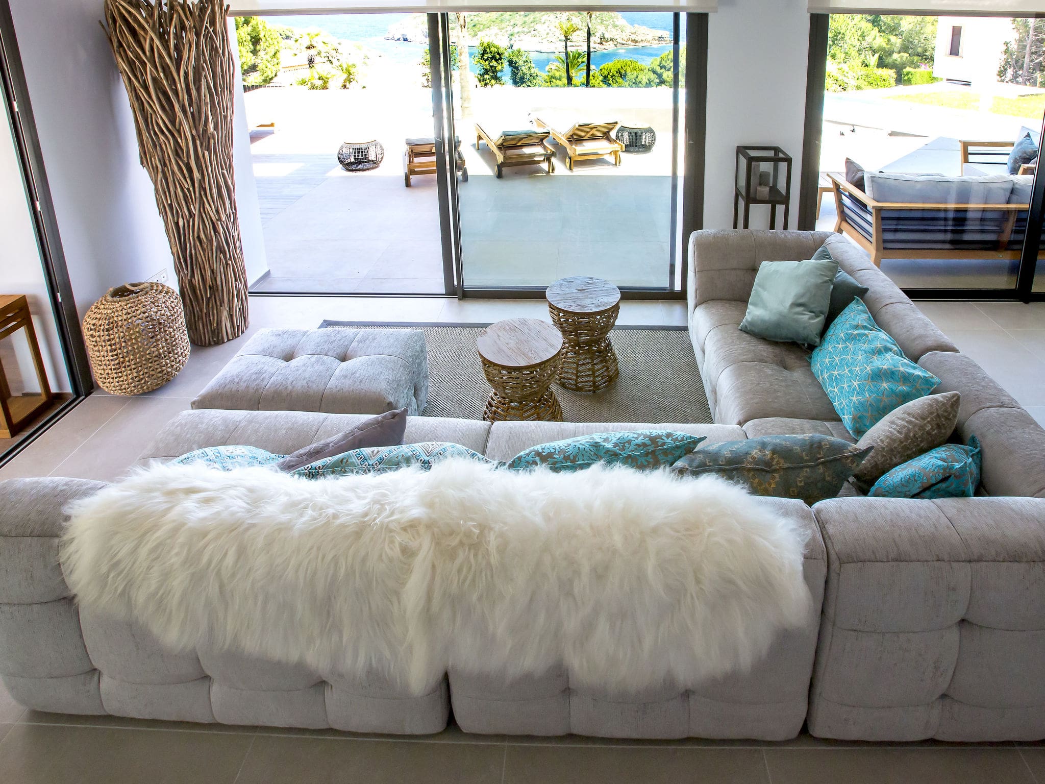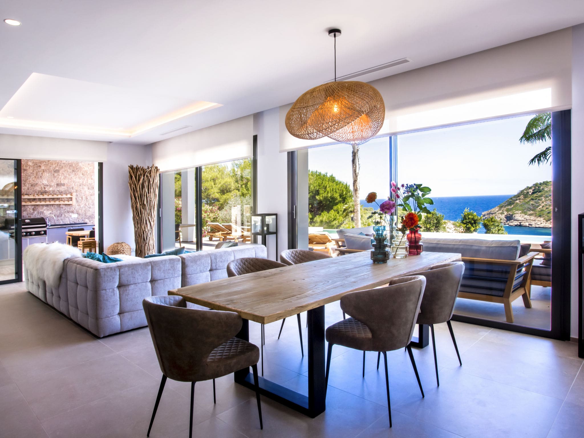 All four bedrooms feature French beds and individual climate control, with three rooms offering private en-suite bathrooms complete with rainfall showers. Each bedroom opens onto private terraces where guests can savour morning coffee or evening cocktails while drinking in those spectacular sea vistas. The master suite impresses with its double hand-basin and luxurious shower facilities, creating a true sanctuary for relaxation.