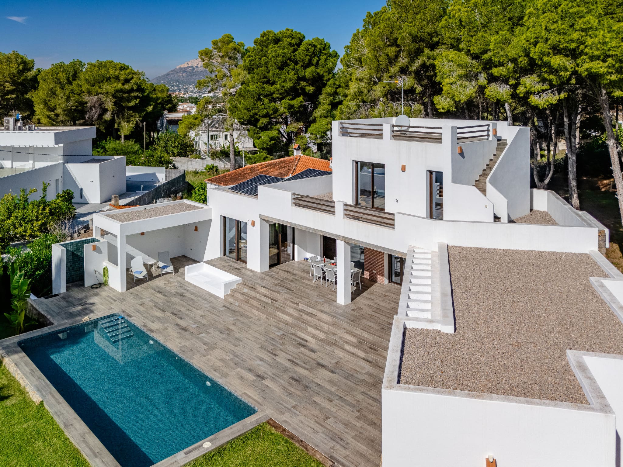 The villa is located within Jávea itself, with the historic old town centre approximately 3 kilometres away and the lively Arenal area about 2 kilometres distant.