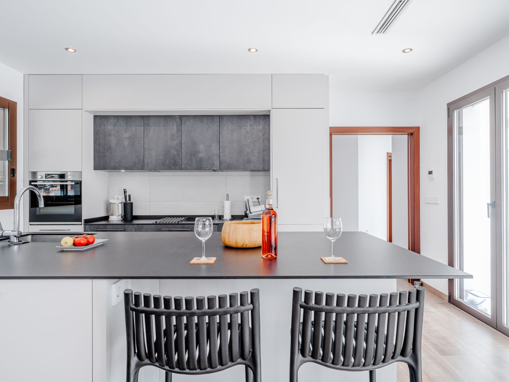 Spread across two carefully designed levels, this modern villa showcases bright, spacious interiors with air conditioning throughout. The ground floor centres around an open-plan living and dining area featuring satellite television and direct access to the pool terrace. The contemporary kitchen comes fully equipped with induction hob, oven, dishwasher, microwave, and coffee machine, perfect for preparing meals with local ingredients from nearby markets. Two bedrooms occupy this level: a master suite with king-size bed and a single room with private shower room and terrace access. The upper floor houses the second master bedroom with ensuite bathroom and private terrace offering elevated views across the surrounding landscape.