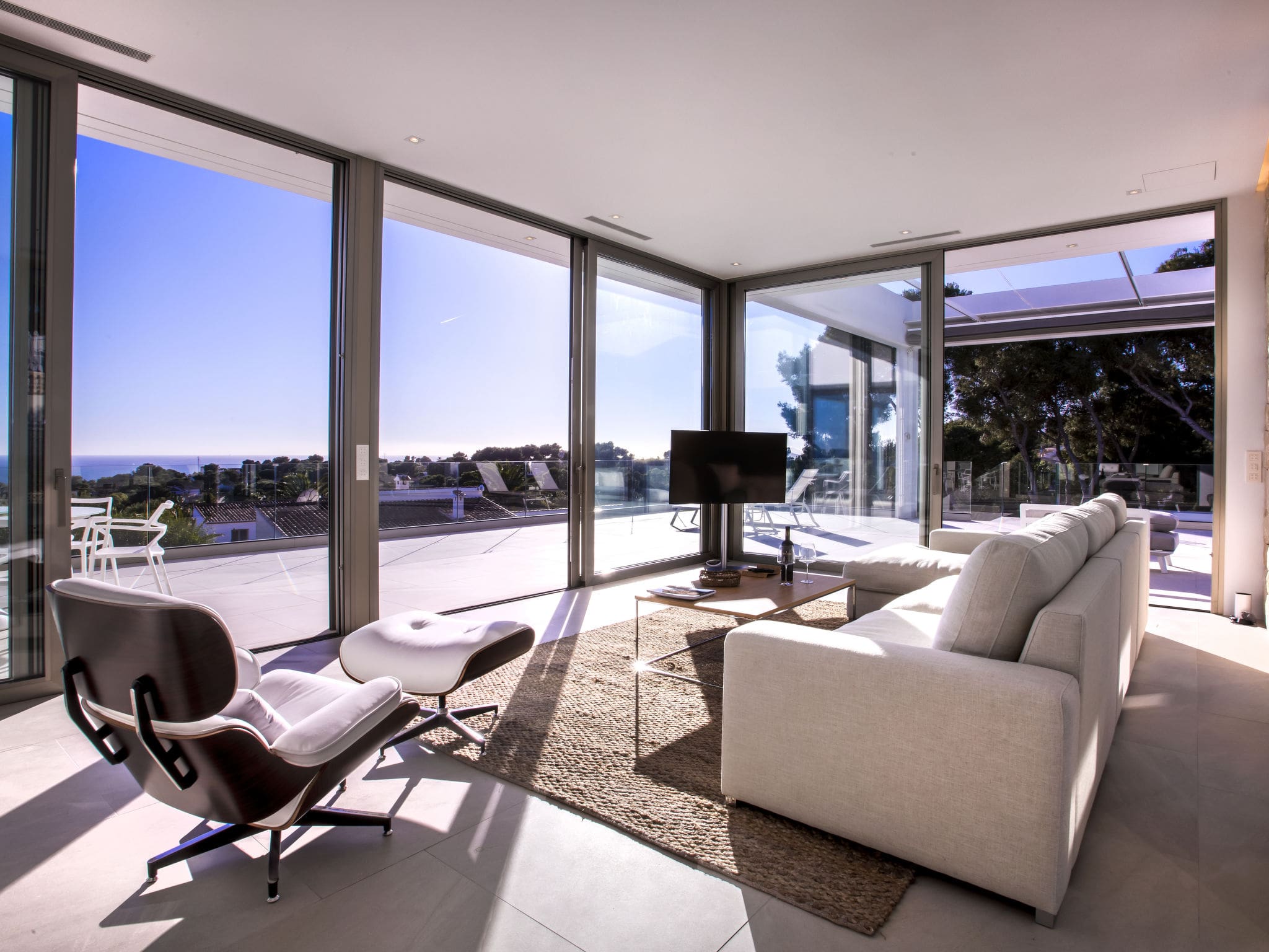 The villa sits in the prestigious Balcón al Mar area, approximately 10 minutes drive from Jávea’s historic centre and port area, with restaurants and supermarkets much closer.