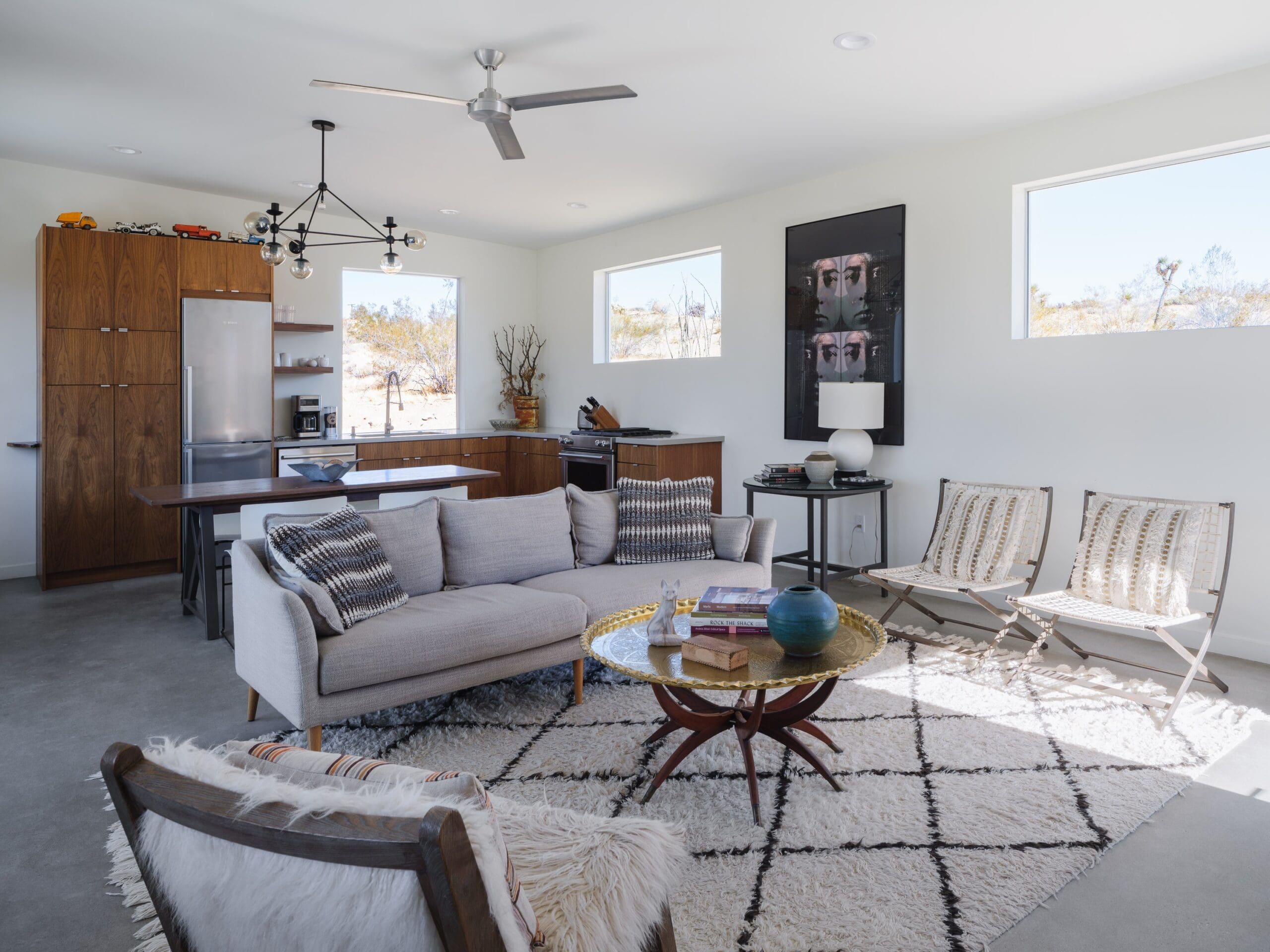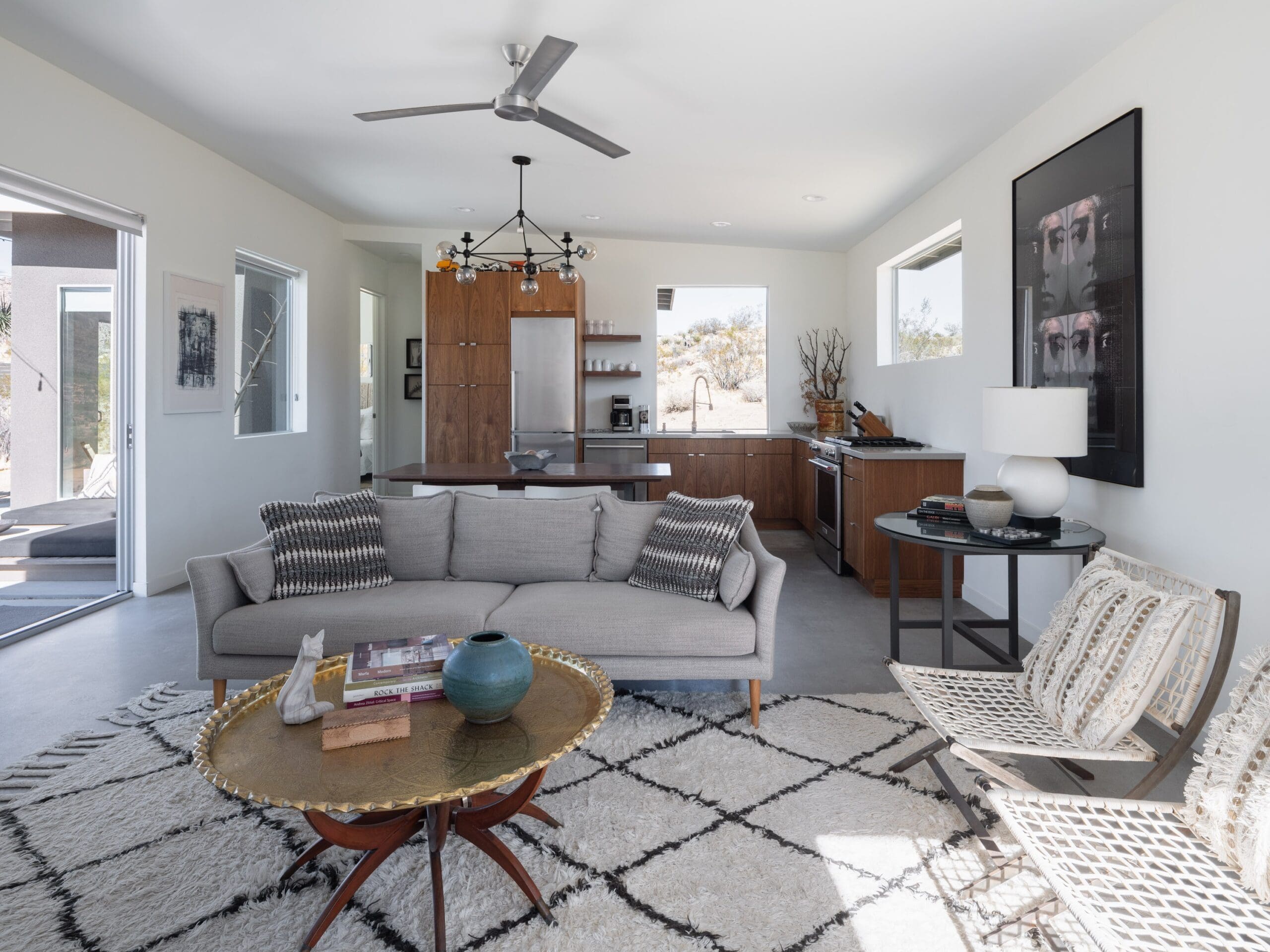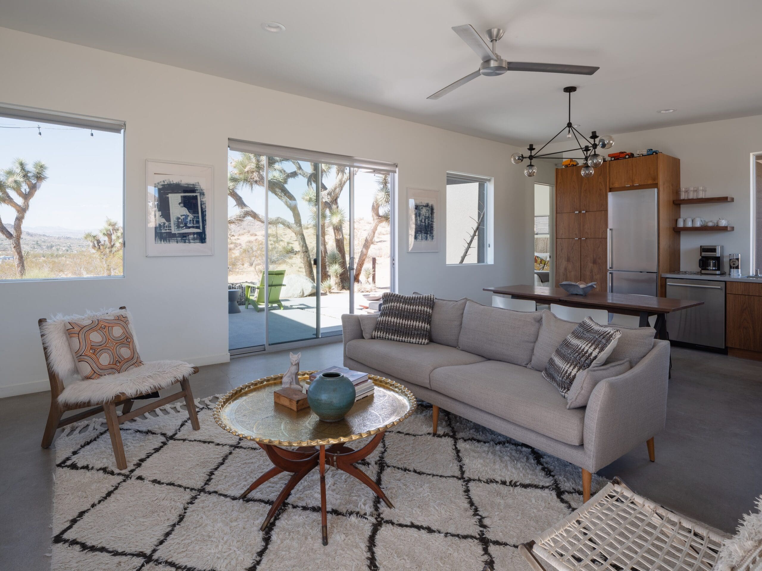 You can feel the unique magic of the high desert all through this contemporary home, located just outside Joshua Tree Village. The bright white walls, natural wood and polished concrete floors create a laid back yet welcoming vibe, with woven rugs and intricate wall hangings adding a boho touch. Outside, you’ll find plenty of places to relax and take in the epic views across the wilderness – curl up in the hanging egg chair, stretch out on a sun lounger or gather at the alfresco dining area. If you’re feeling active, Joshua Tree National Park is just a mile away, where you can hike through the desert and admire the awe-inspiring landscapes stretching out in every direction. Come back for a dip in the hot tub or cowboy bath, then rustle up dinner on the grill as the sun sets over the mountains. After dark you’ll be treated to fantastic views of the night sky – spot your favourite constellations as you keep warm beside the fire pit with a glass of Californian wine.