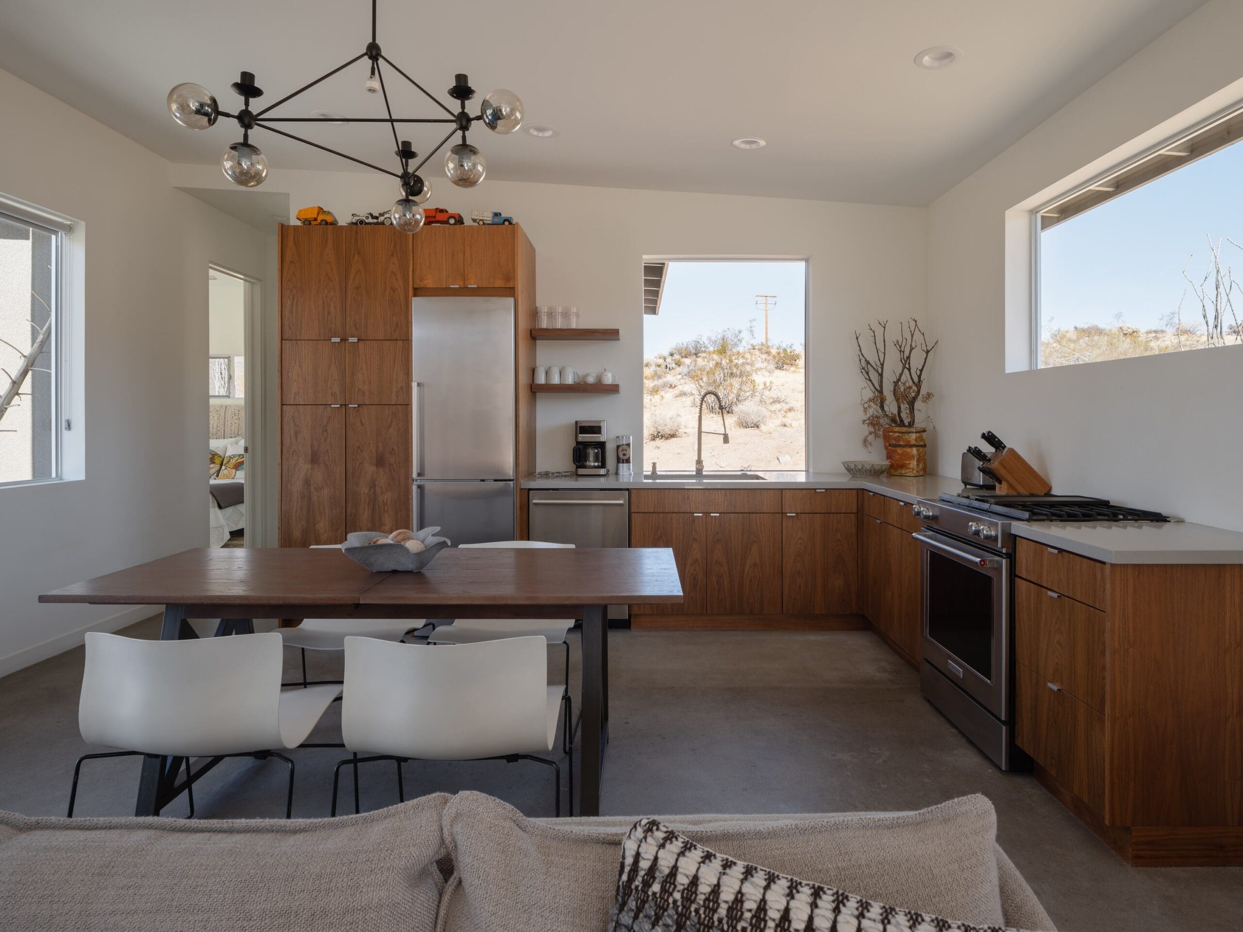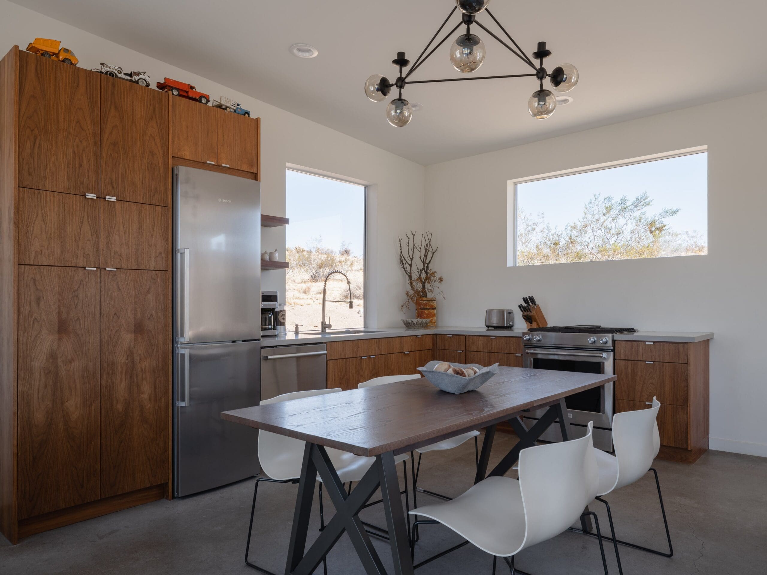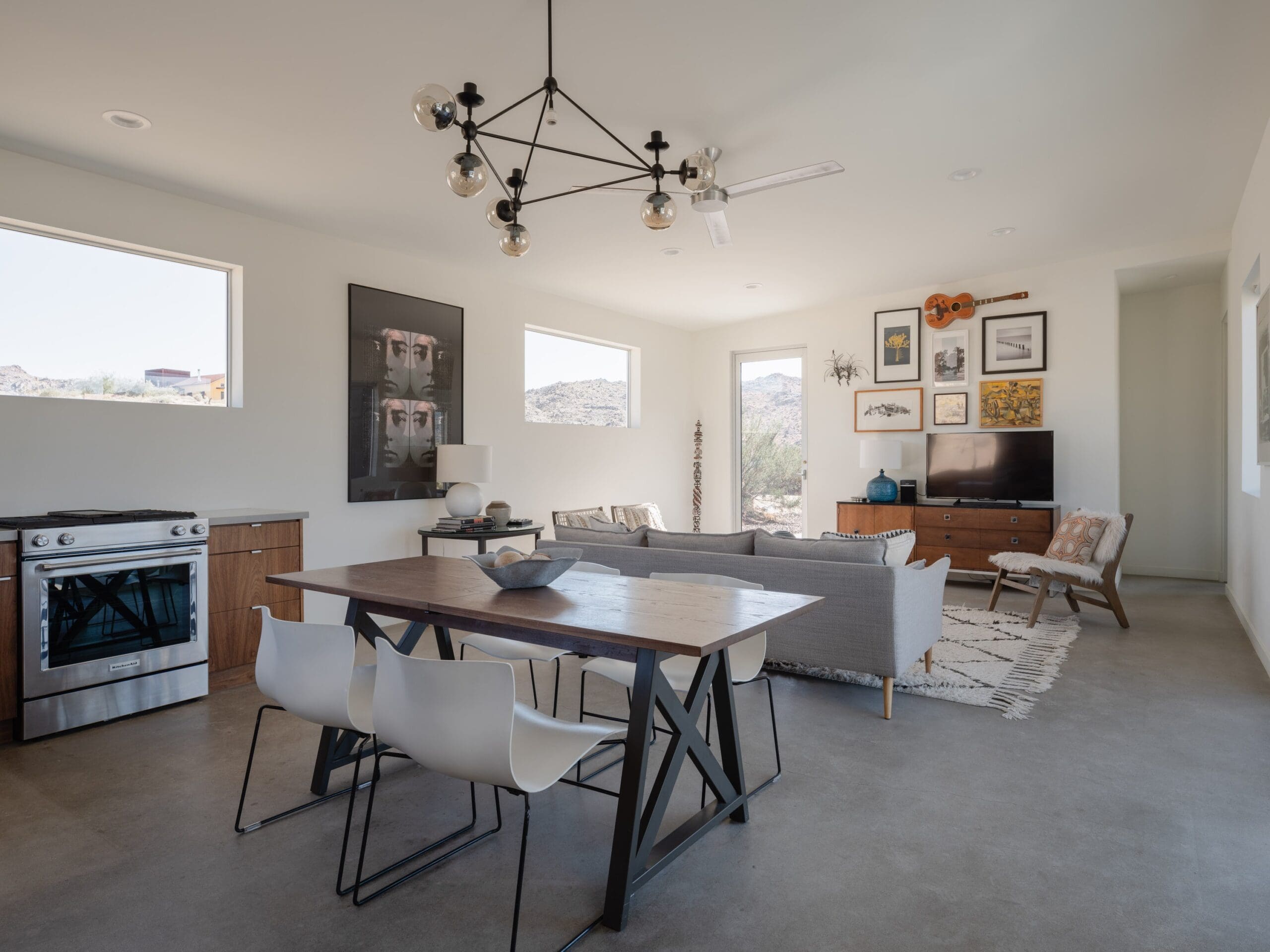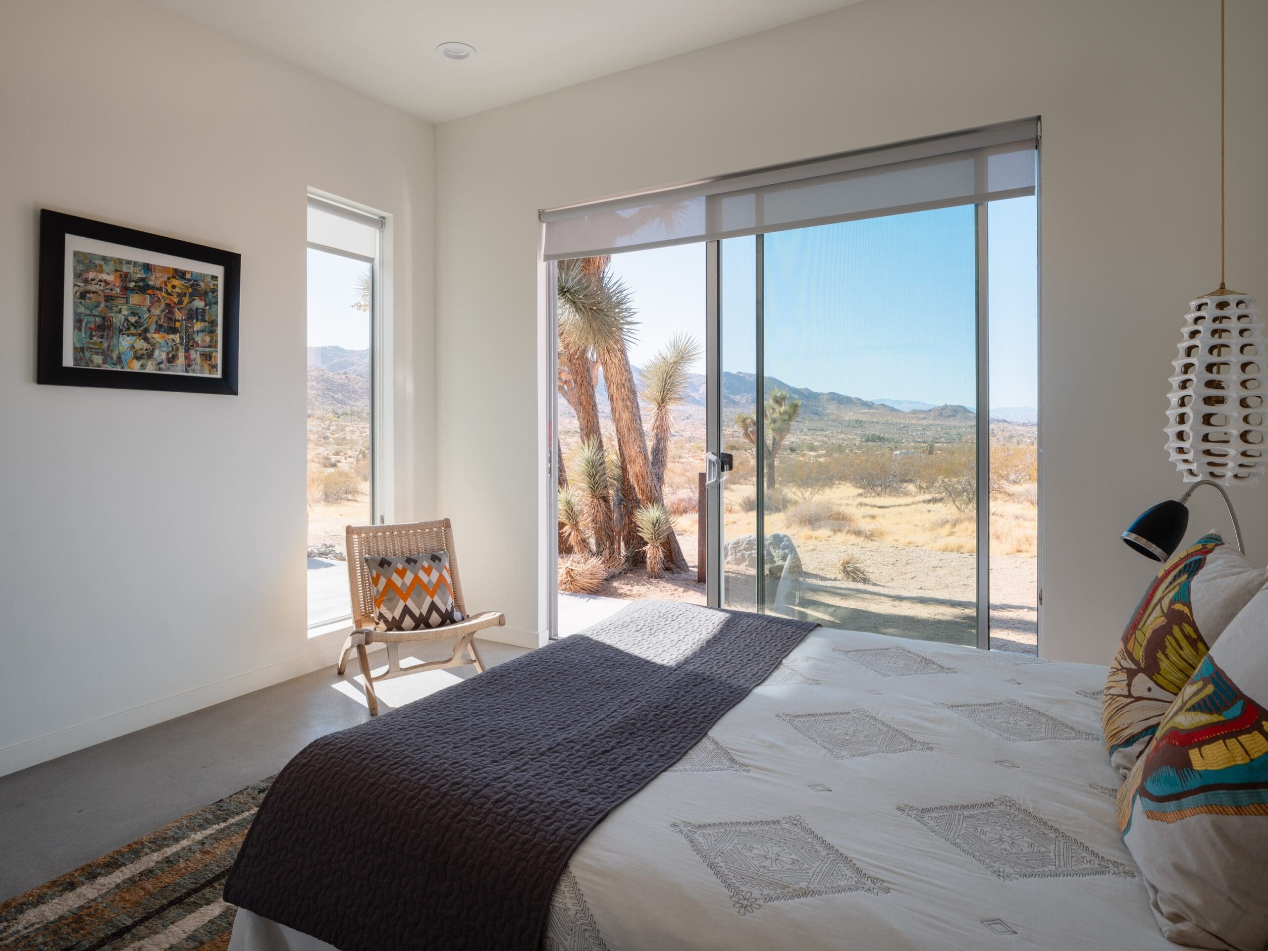 You can feel the unique magic of the high desert all through this contemporary home, located just outside Joshua Tree Village. The bright white walls, natural wood and polished concrete floors create a laid back yet welcoming vibe, with woven rugs and intricate wall hangings adding a boho touch. Outside, you’ll find plenty of places to relax and take in the epic views across the wilderness – curl up in the hanging egg chair, stretch out on a sun lounger or gather at the alfresco dining area. If you’re feeling active, Joshua Tree National Park is just a mile away, where you can hike through the desert and admire the awe-inspiring landscapes stretching out in every direction. Come back for a dip in the hot tub or cowboy bath, then rustle up dinner on the grill as the sun sets over the mountains. After dark you’ll be treated to fantastic views of the night sky – spot your favourite constellations as you keep warm beside the fire pit with a glass of Californian wine.