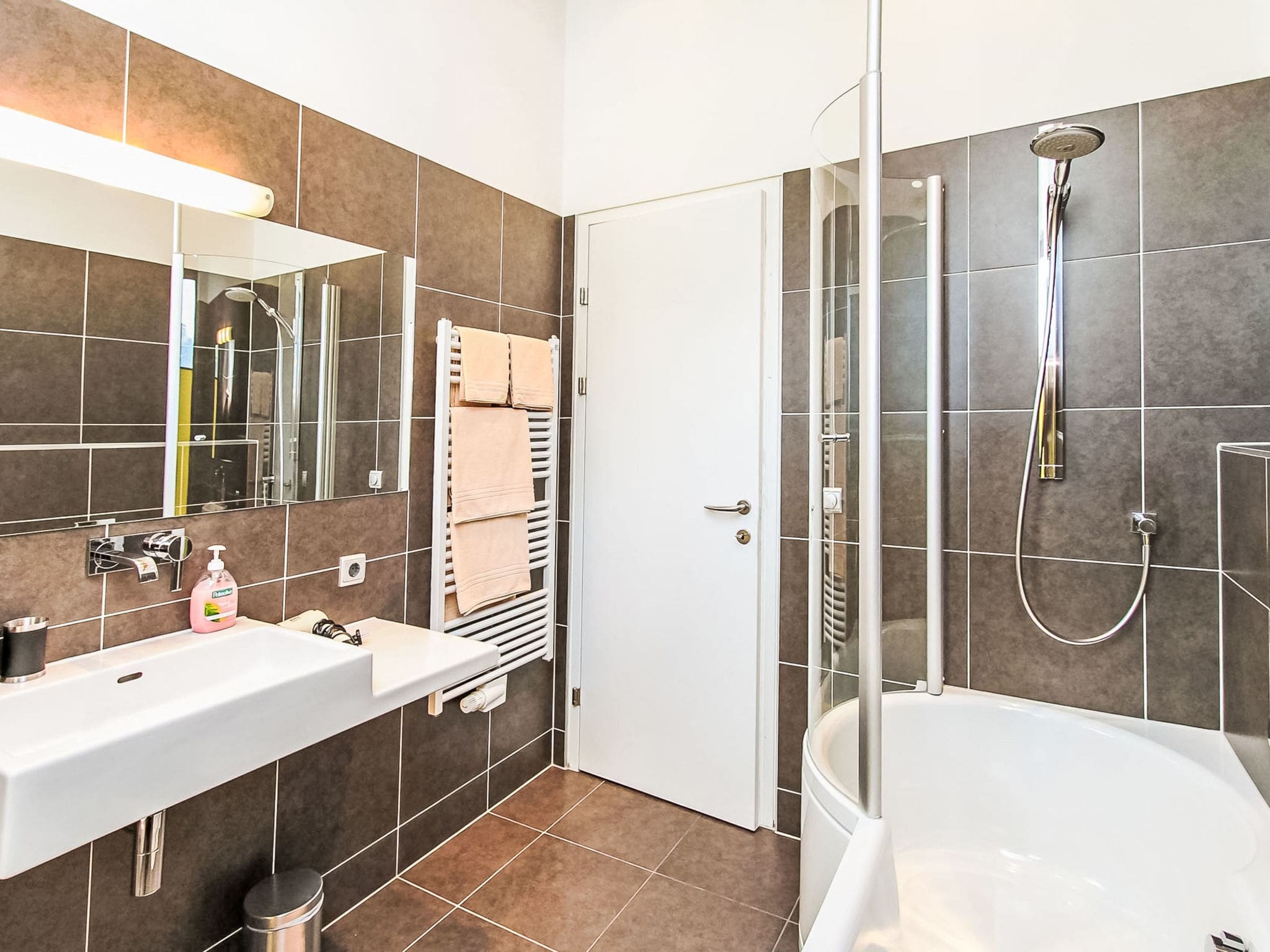 The fully equipped open kitchen features premium appliances including a modern oven, efficient dishwasher, ceramic glass hob with four hotplates, and convenient countertop appliances such as a toaster, kettle and microwave. Coffee enthusiasts will appreciate the electric Nespresso machine for morning caffeine rituals. The bathroom offers a full suite with bathtub, bidet and WC, complemented by a separate guest WC for added convenience. Underfloor heating ensures year-round comfort, while the spacious balcony with outdoor furniture provides the perfect vantage point for admiring the spectacular mountain panorama.