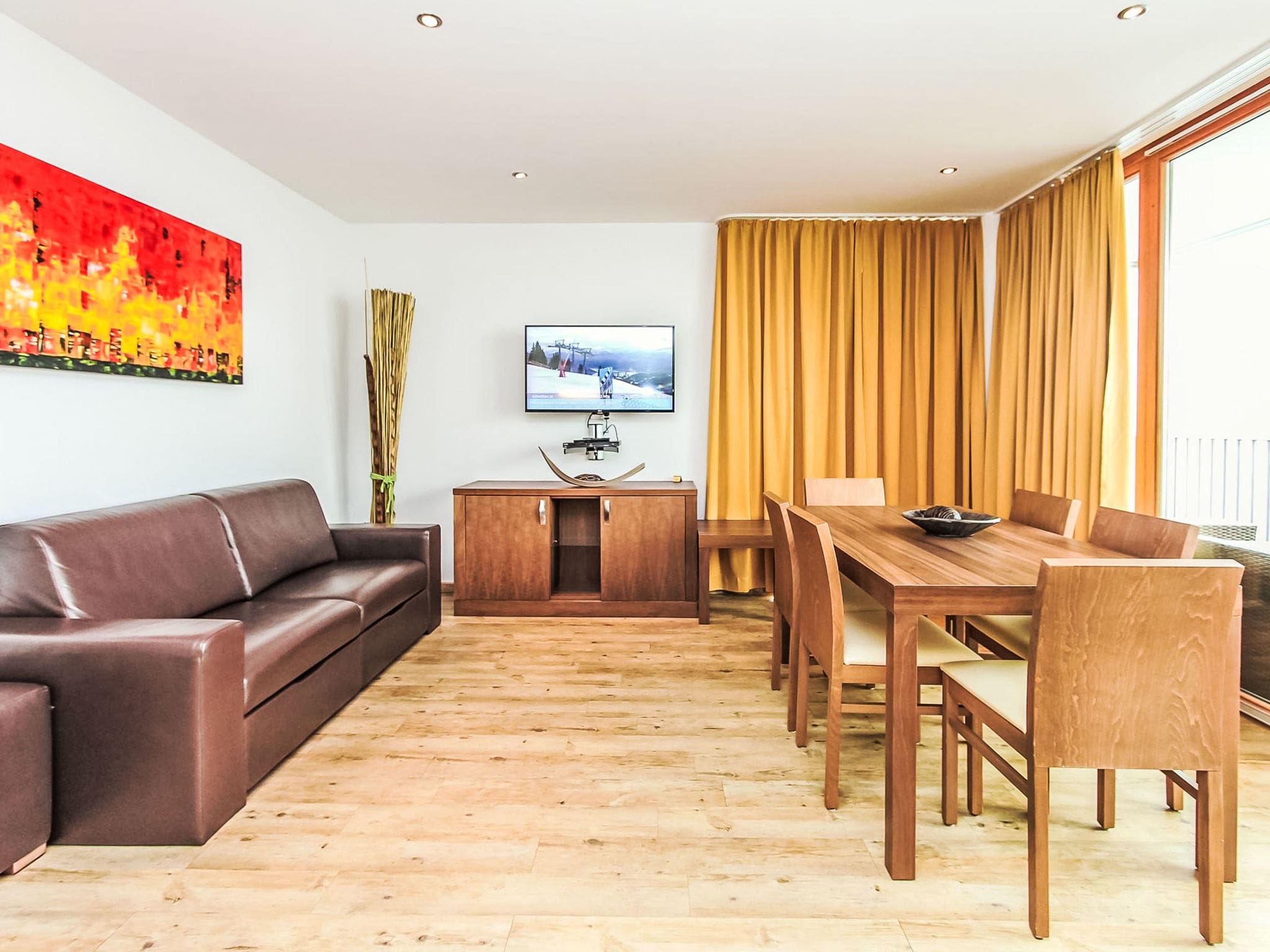 Spread across two levels and encompassing 62 square metres, this contemporary alpine residence showcases bright, tasteful furnishings throughout its well-designed living spaces. The accommodation features two comfortable double bedrooms, each equipped with satellite television and modern flat-screen displays for evening relaxation. The open-plan living area includes a versatile living and sleeping space with a quality double sofa bed, creating flexible accommodation for up to six guests. The dining nook provides an intimate space for family meals and mountain planning sessions.