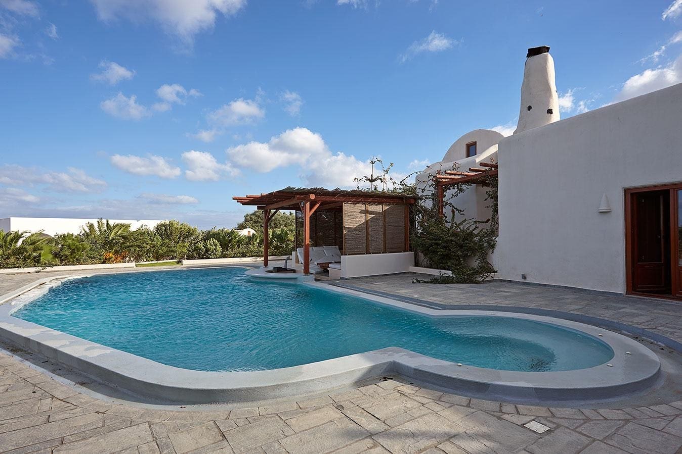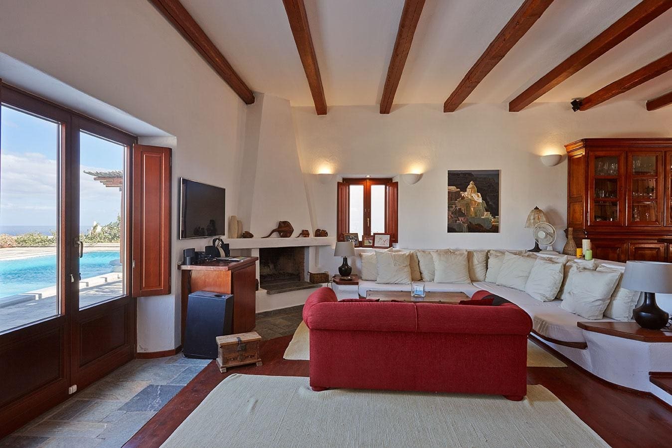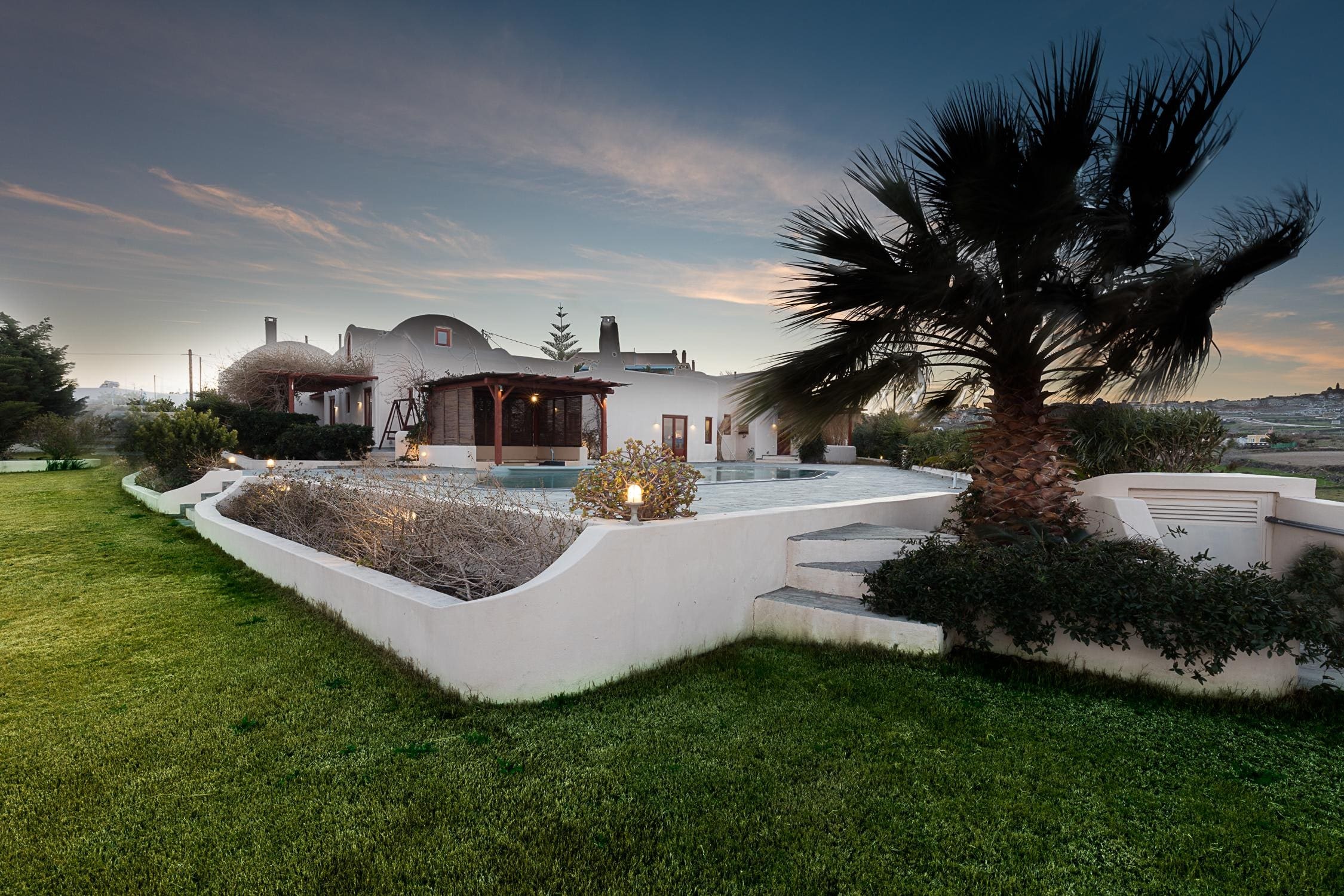 When it comes to settings for a party, there can’t be many that are better than this. Starting with the exterior, there’s a large freshwater swimming pool surrounded by loungers and covered terraces, which all enjoy a gorgeous view of a Cycladic hillside. Moving around the side of the address, guests also get the run of a massive lawn with children’s play equipment on it.
