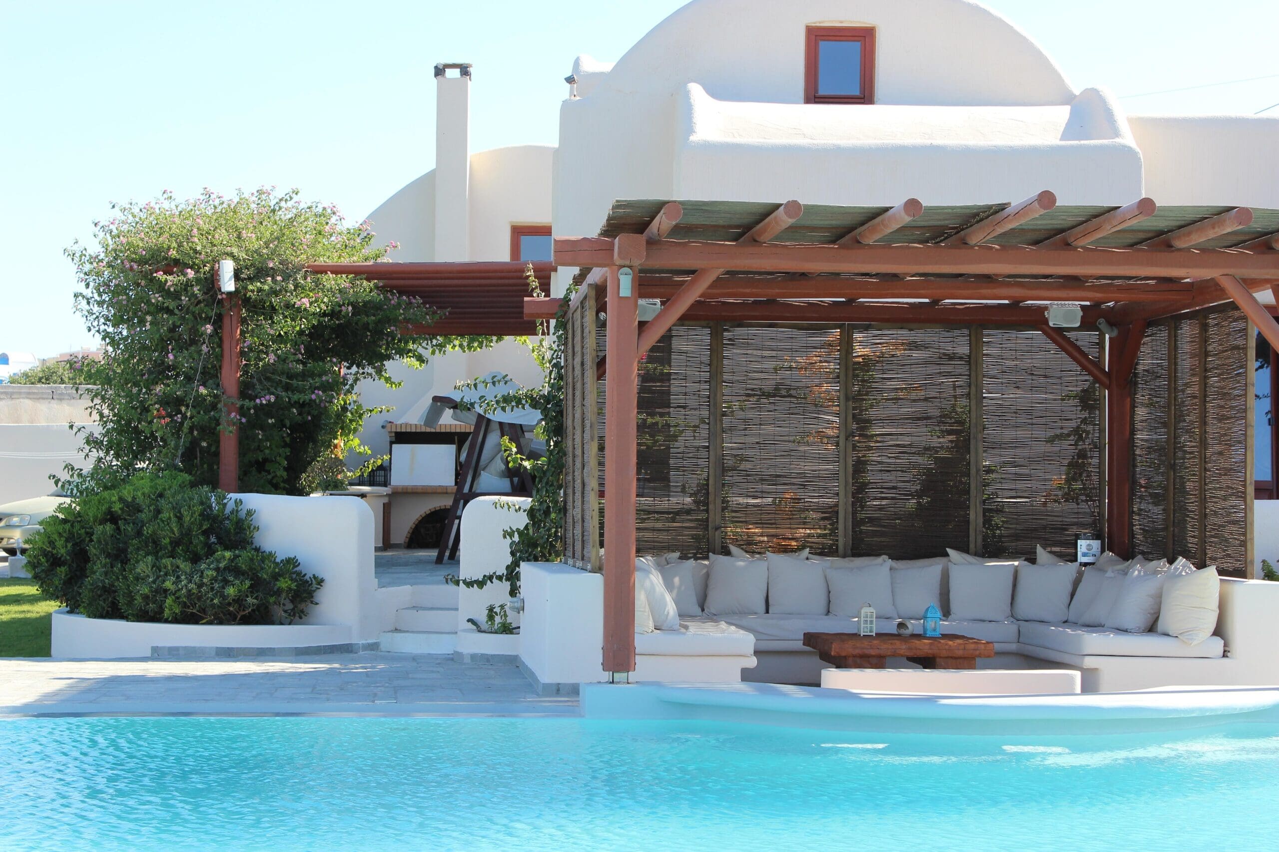 Inside, the home has been appointed in traditional Santorinian style, with cooling white walls, wooden ceiling beams and bare floorboards. Oddly enough, the only rooms that veer away from this script are the bathrooms, which all have been treated to a quirky range of tiling.
