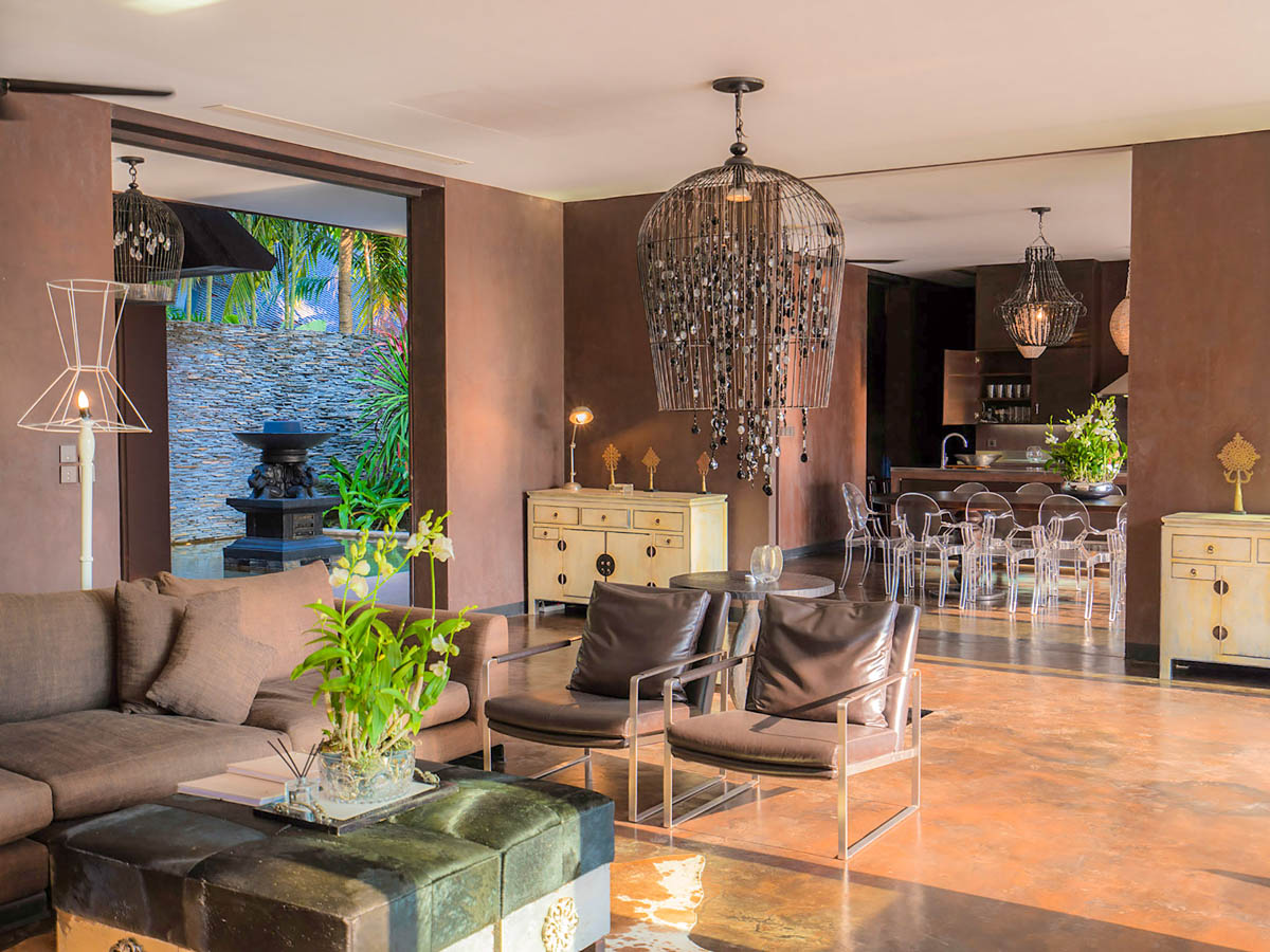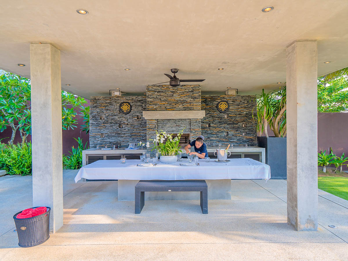 The villa’s private chef is on hand to cook breakfast, lunch, dinner and is an expert at both Asian and Western cuisines. Guest requests are accommodated as far as possible (including special diets). There is also an excellent media/entertainment room and a fantastic gym. The open-plan living area looks out onto the spectacular outdoor area, offering guests stunning views of Natai beach.