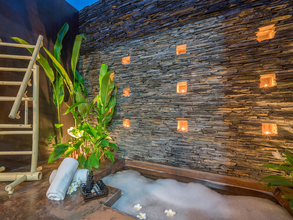 Outside, there is not one, but two infinity edge pools, one with a jacuzzi for guests to choose from! Around the pools is a huge sand-wash deck furnished with comfortable sun loungers for guests to relax on; there is also a beachside sala, a family-sized daybed and a barbecue area with wood-fired pizza oven for alfresco dining.