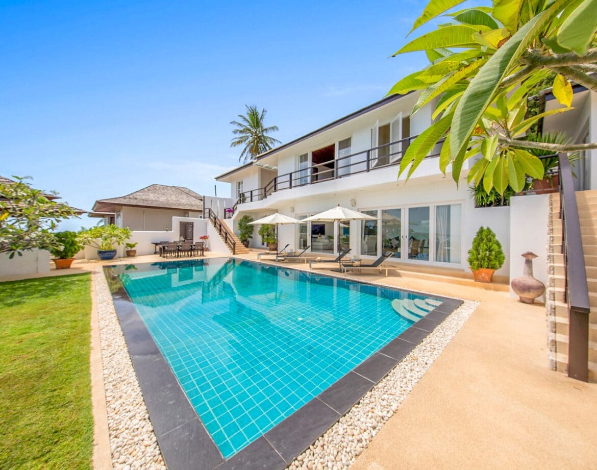 Nestled atop a serene hillside in the convenient Bophut area, Baan Laelay beckons with its panoramic views of Bophut Bay and Koh Phangan. If you’re seeking solace away from the bustling crowds yet still within reach of the sea, this four-bedroom sanctuary promises an idyllic retreat. Spread over two expansive storeys, this recently refurbished villa sprawls across nearly 750 square metres, offering ample space for relaxation and rejuvenation.