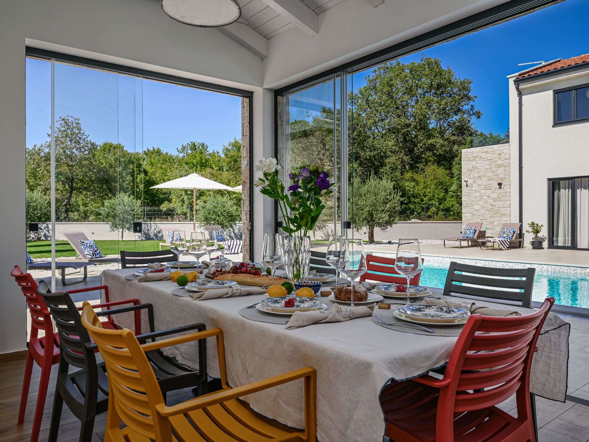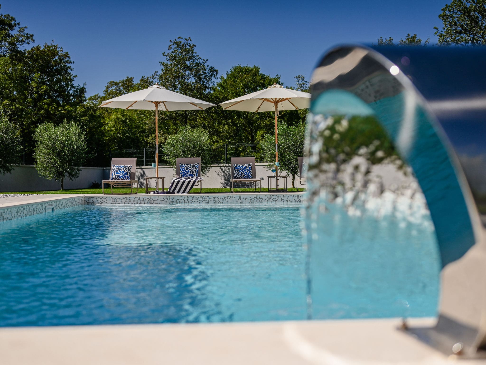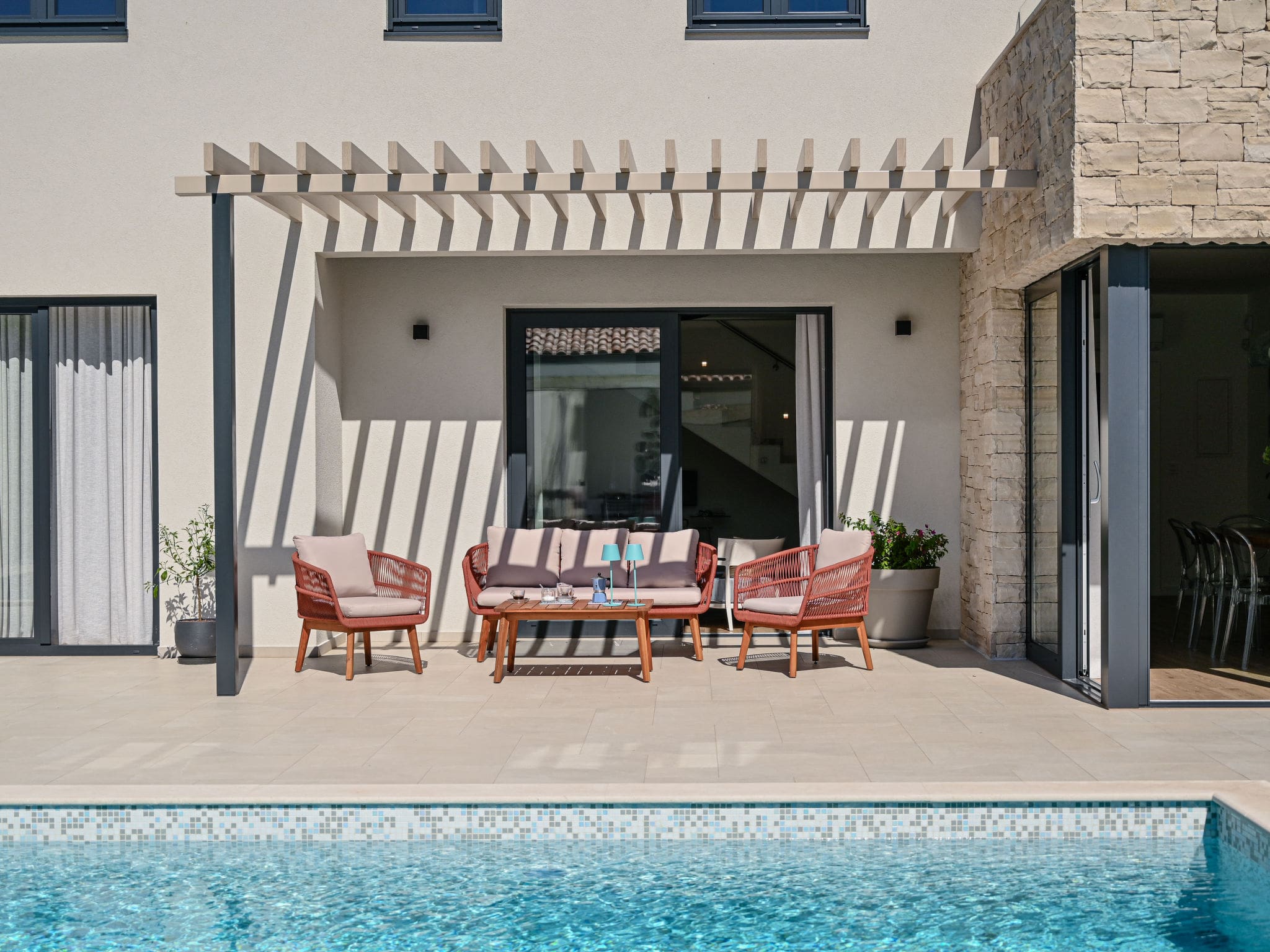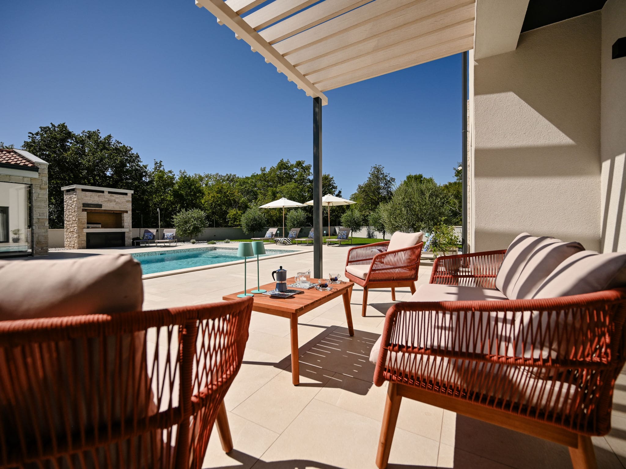 A dedicated pool house enhances outdoor entertaining with its own refrigerator, toilet, and cooking stove, while an outdoor shower provides convenient pool-side refreshment. The barbecue area and comprehensive garden furniture create multiple spaces for al fresco dining and lounging. Eight deck chairs ensure everyone can enjoy the Croatian sunshine in comfort.