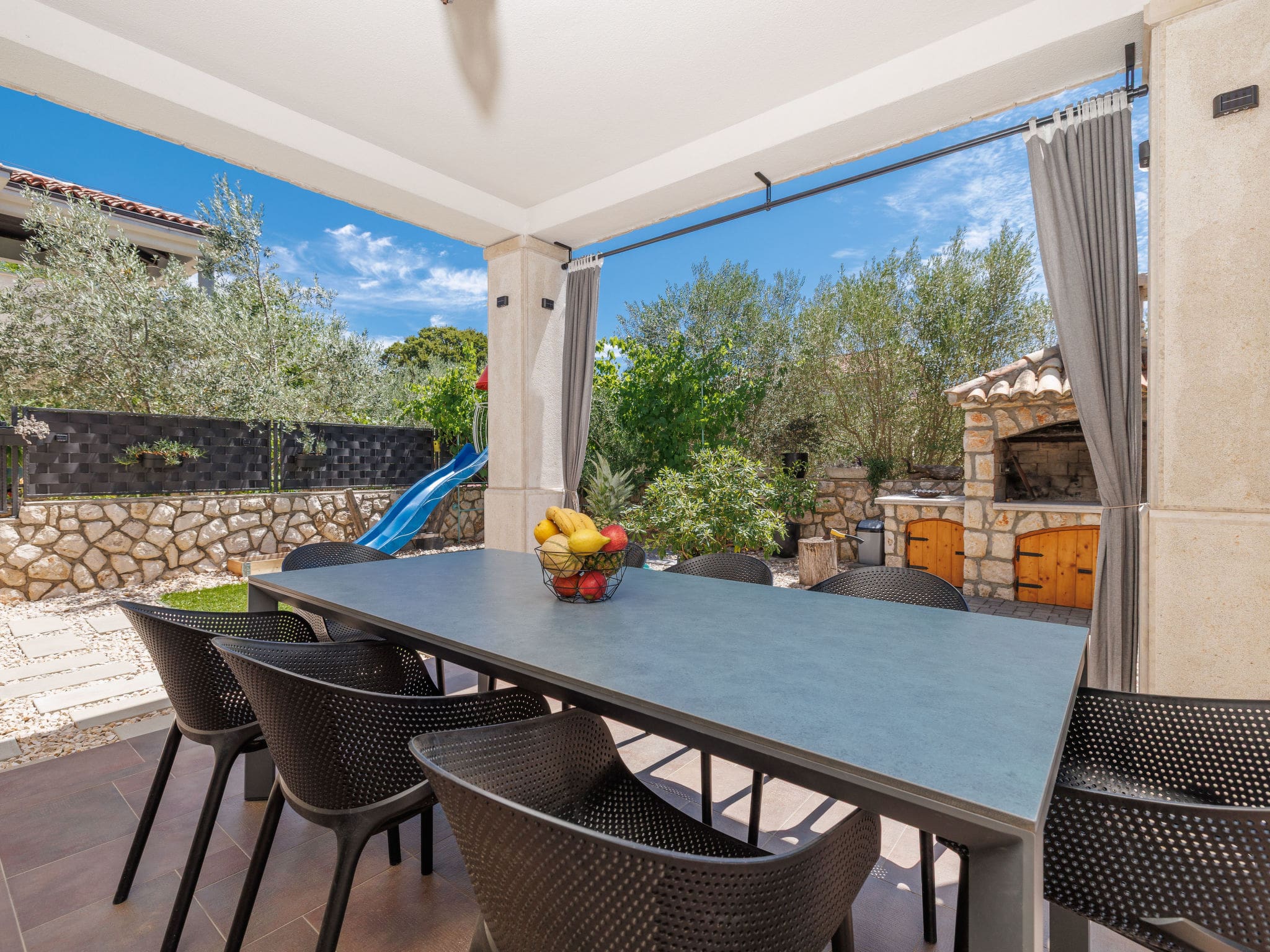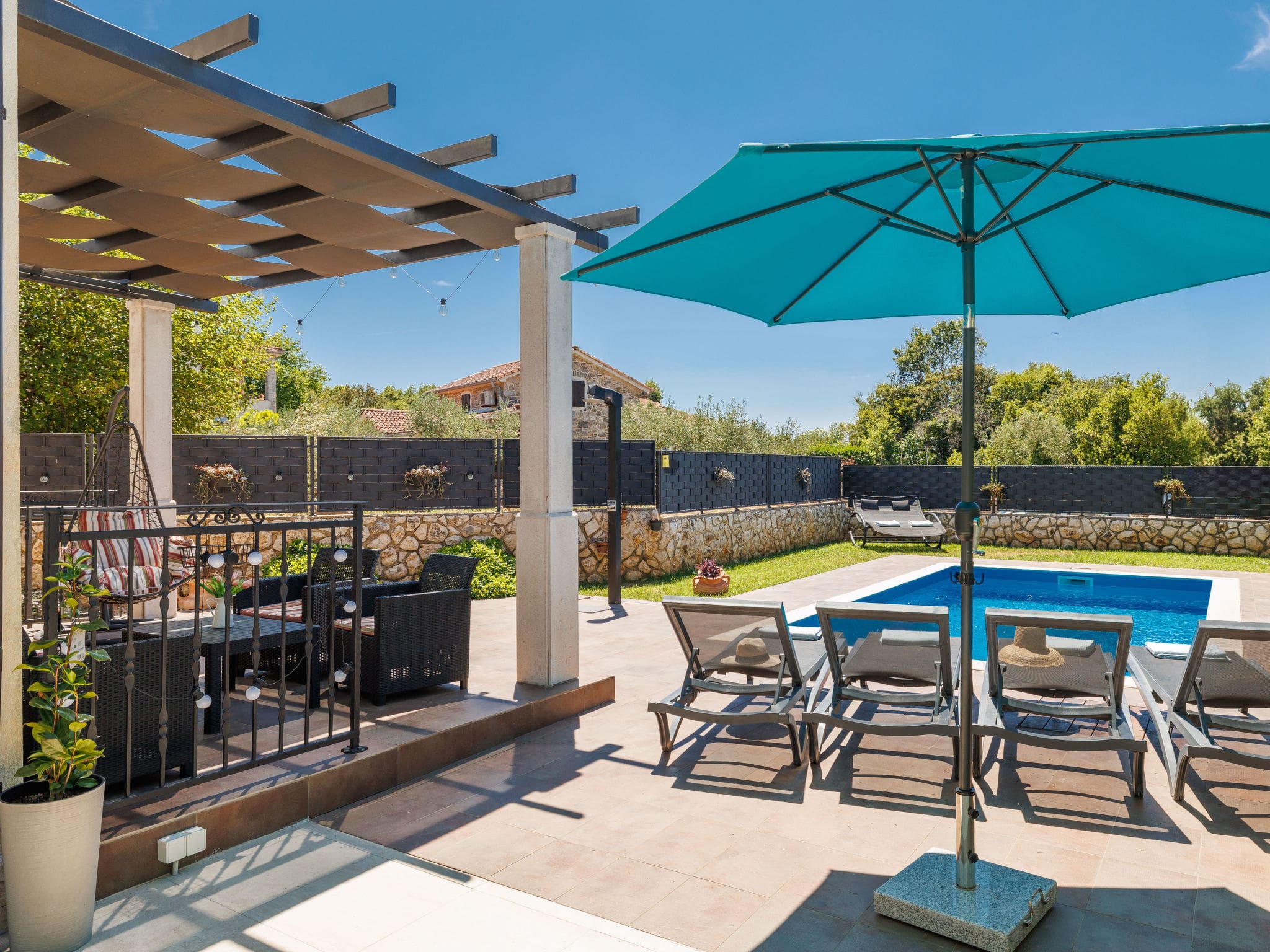 The villa’s private outdoor space truly shines with its angular swimming pool measuring 6 by 3 metres, perfect for refreshing dips during warm Croatian days. The pool operates seasonally from April to October and features convenient internal stairs for easy access. Surrounding the pool, you’ll find comfortable deck chairs and terrace furniture arranged across multiple outdoor areas, including both covered and open terraces totalling nearly 40 square metres. The property includes a barbecue area for al fresco dining, an outdoor shower for poolside convenience, and a children’s playground set within the beautifully landscaped garden. The entire 500-square-metre plot is securely fenced and features a wildlife garden that creates a peaceful natural environment.