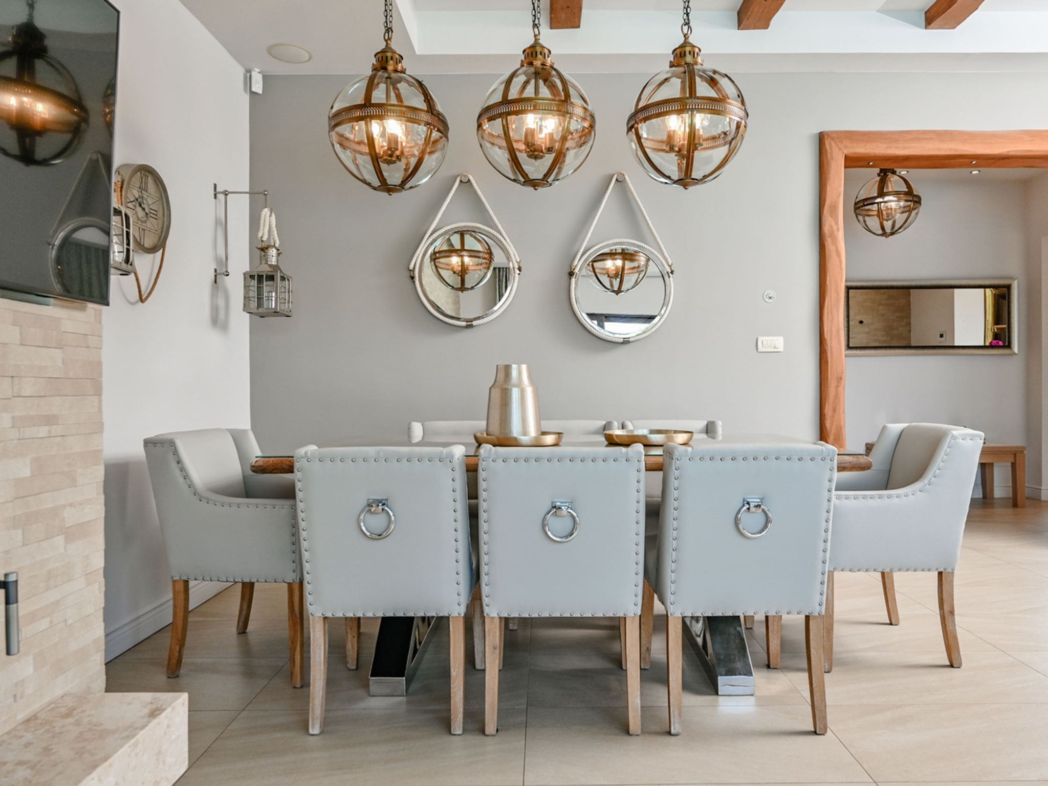 Upstairs, three additional bedrooms offer comfortable accommodation for families and groups. Two rooms feature elegant double beds with ensuite shower rooms, while the fourth bedroom provides flexible sleeping with bunk beds perfect for children or additional guests. Each room benefits from air conditioning and carefully chosen furnishings that reflect the villa’s sophisticated aesthetic. The property’s non-smoking policy ensures a fresh, clean environment throughout.